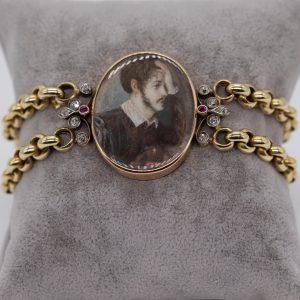 Rosé and yellow gold, stamped 585/- on the clasp tab; total weight: approx. 33 g; high-oval centrepiece featuring a set miniature in tempera, showing a man in a thinker’s pose in side profile, dated 1787; narrow, plain bezel border with two applied ornamental elements, each holding five rose-cut diamonds in chaton settings, totalling approx. 0.4 ct; colour and clarity in the mid range; flanked by one small ruby on each side; attached to two rows of circular chain links; round box clasp set with a sapphire cat’s eye cabochon; miniature dimensions: approx. 31.5 x 24.7 mm; height: approx. 5.4 mm; total length: approx. 18.5 cm.