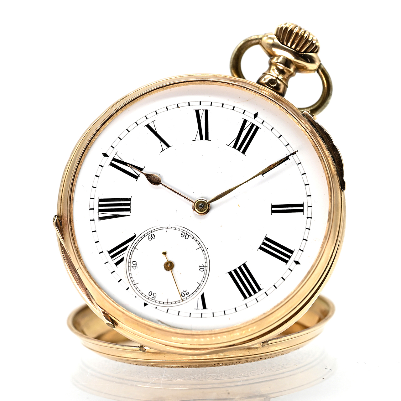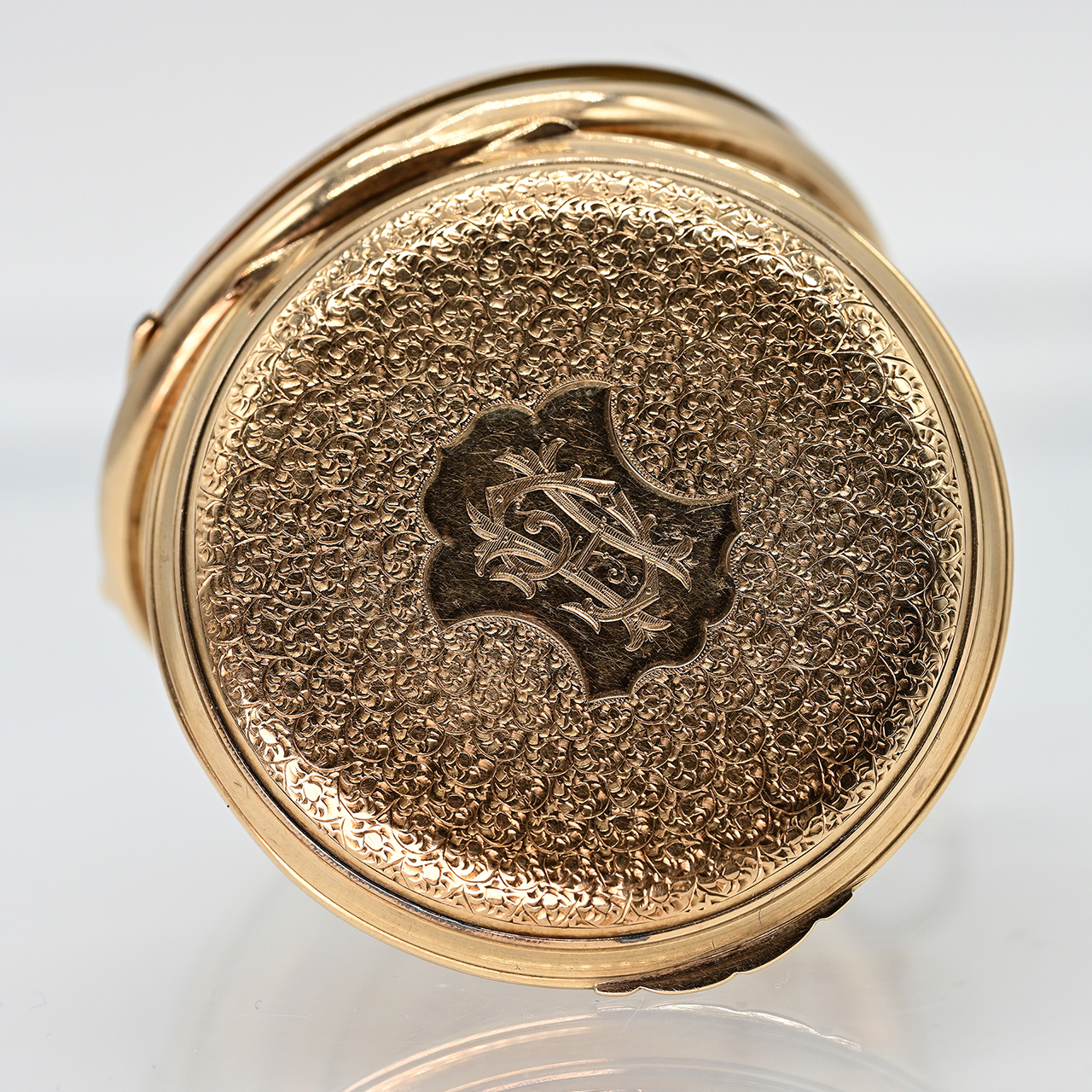 585/- gold case and dust cover, crown and bow made of doublé; total weight: approx. 84 g; white enamel dial with black Roman numerals; arrow-shaped hands; small seconds at 6 o’clock; reverse engraved with ornamental décor, central cartouche with crest and monogram inlaid; case diameter: approx. 49.4 mm; no guarantee on movement or function.