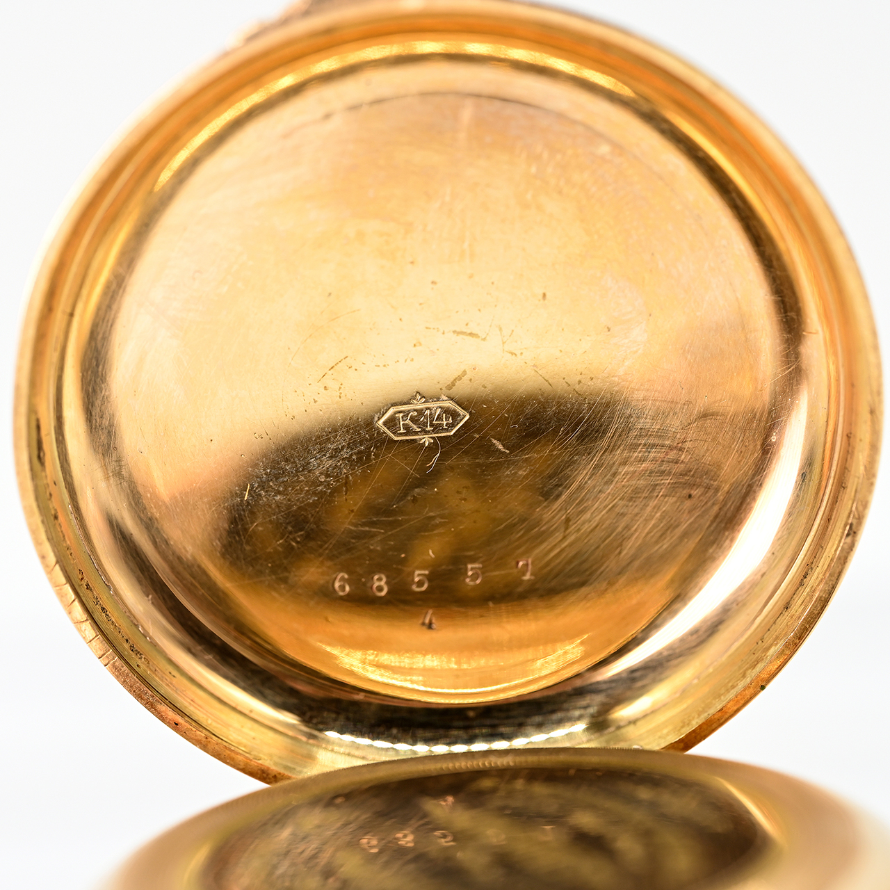 585/- goldenes Gehäuse und Staubdeckel, Krone und Bügel aus Doublé; Gesamtgewicht: ca. 84 g; weißes Emaillezifferblatt mit schwarzen römischen Ziffern; pfeilförmige Zeiger; kleine Sekunde auf der 6; rückseitig gravierter Ornamentdekor mit mittiger Wappenkartusche und legiertem Monogramm; Gehäusedurchmesser: ca. 49,4 mm; keine Garantie auf Werk und Funktion.