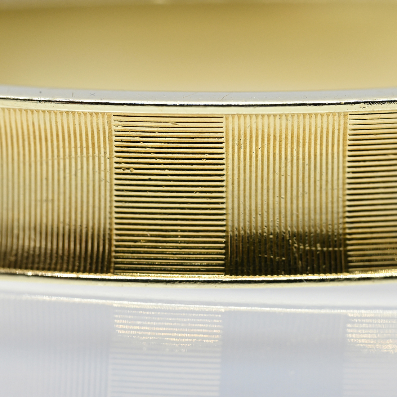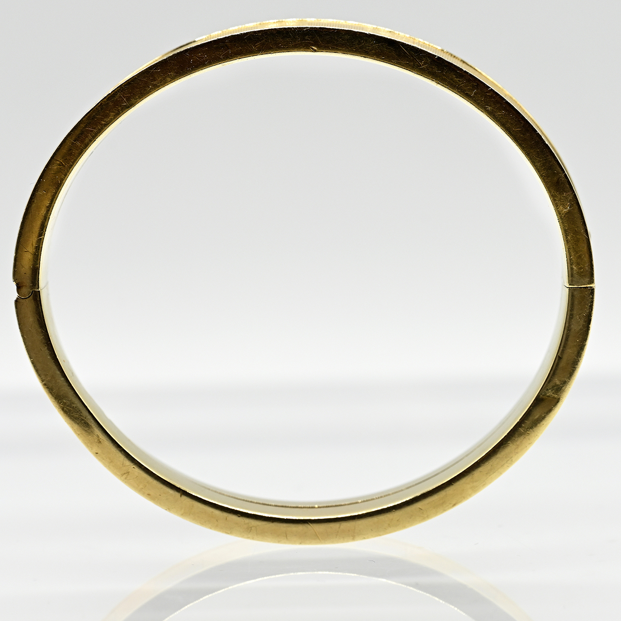 585/- Gelbgold; Gesamtgewicht: ca. 28,7 g (z. T. gefüllt); ovale, aufklappbare Bandform mit konkaver Innenseite; umlaufend unterteilt in einzelne rechteckige Segmente mit fein schraffiertem horizontalem und vertikalem Dekor; verdecktes Kastenschloss mit seitlicher Sicherheitsacht; Innendurchmesser des Reifs: ca. 6 × 5,3 cm; Breite: ca. 10 mm; diverse leichte Tragespuren.
