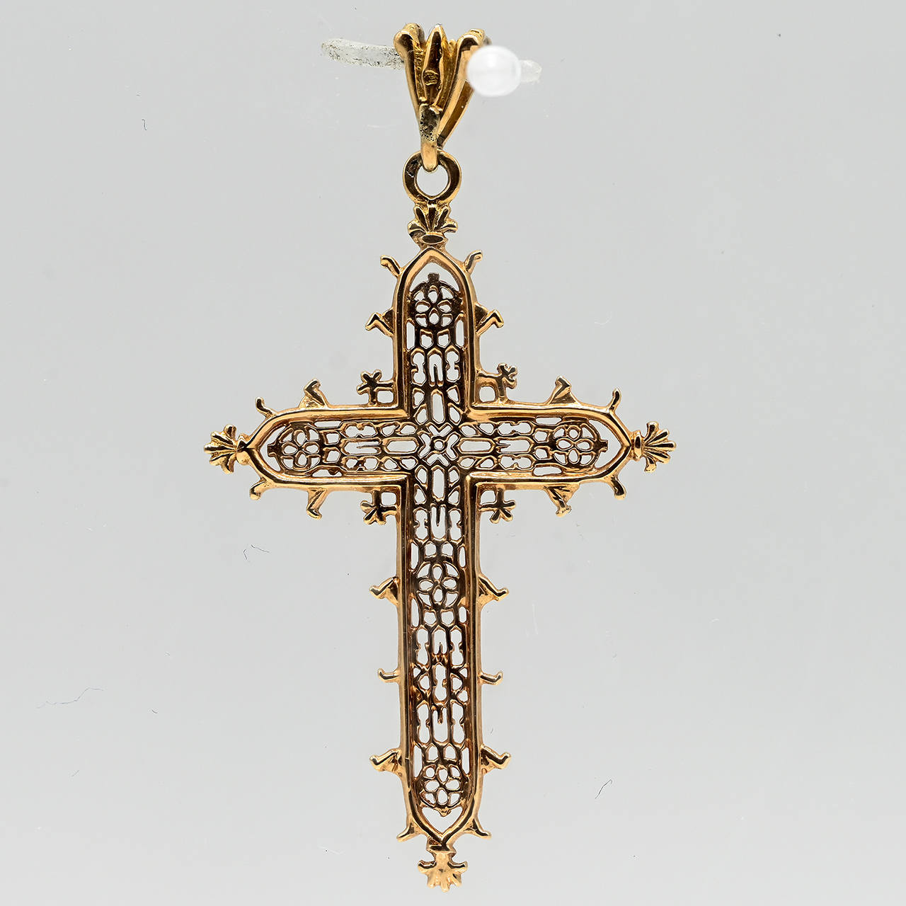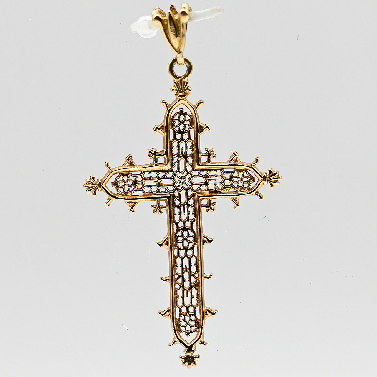 750/- Rotgold; Gesamtgewicht: ca. 3,6 g; flache Kreuzform in feiner Filigranarbeit und seitlich am Rand mit kleinen feinen Kugel- und Ornamentbelötungen; gefächerte Dreiecksöse; Gesamtlänge inkl. Öse: ca. 51,2 mm; Breite: ca. 28 mm.