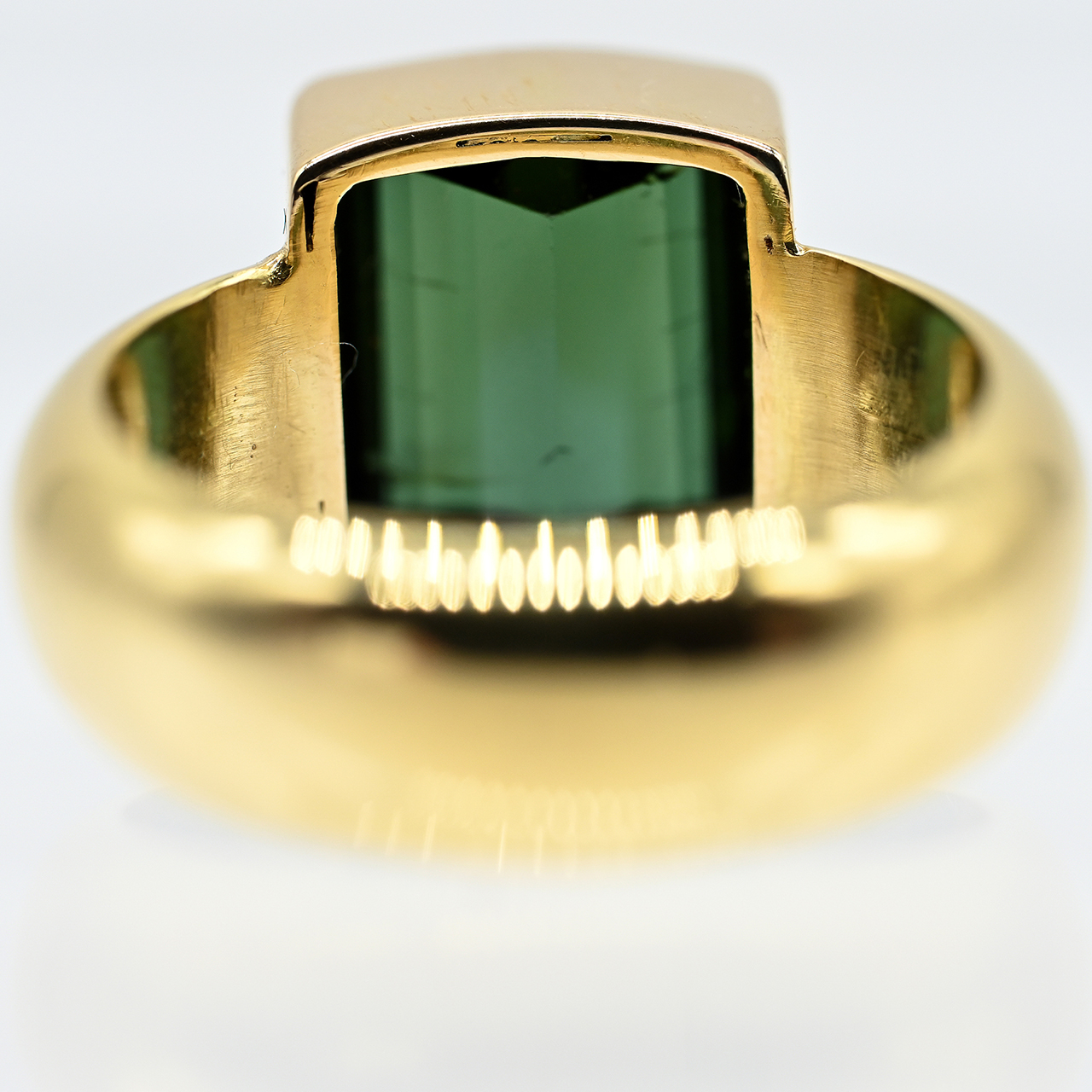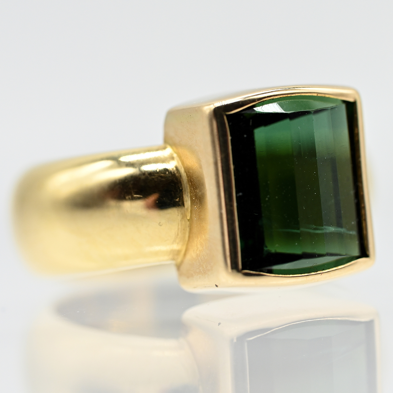 750/- Gelbgold; Gesamtgewicht: ca. 14,5 g; im Hochformat rechteckige, hohe Zargenform mit gefasstem grünem, getreppt facettiertem Turmalin; Maße: ca. 10,2 x 9,1 mm; Höhe: ca. 6 mm; breite, halbbogenförmige, schlichte Ringschiene; Maße der Ringmitte: ca. 12,2 x 10,9 mm; Breite der Ringschiene: ca. 7,2 mm; Ringgröße: 56.