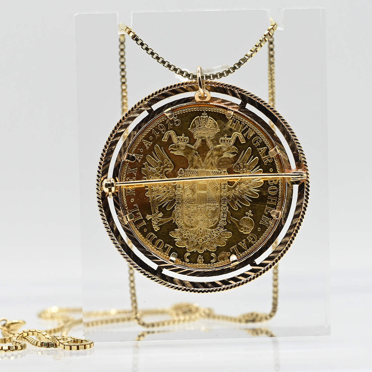 Large golden coin pendant / brooch; 4-ducat gold coin, Austria, dated 1915, and Venetian chain, 1980s