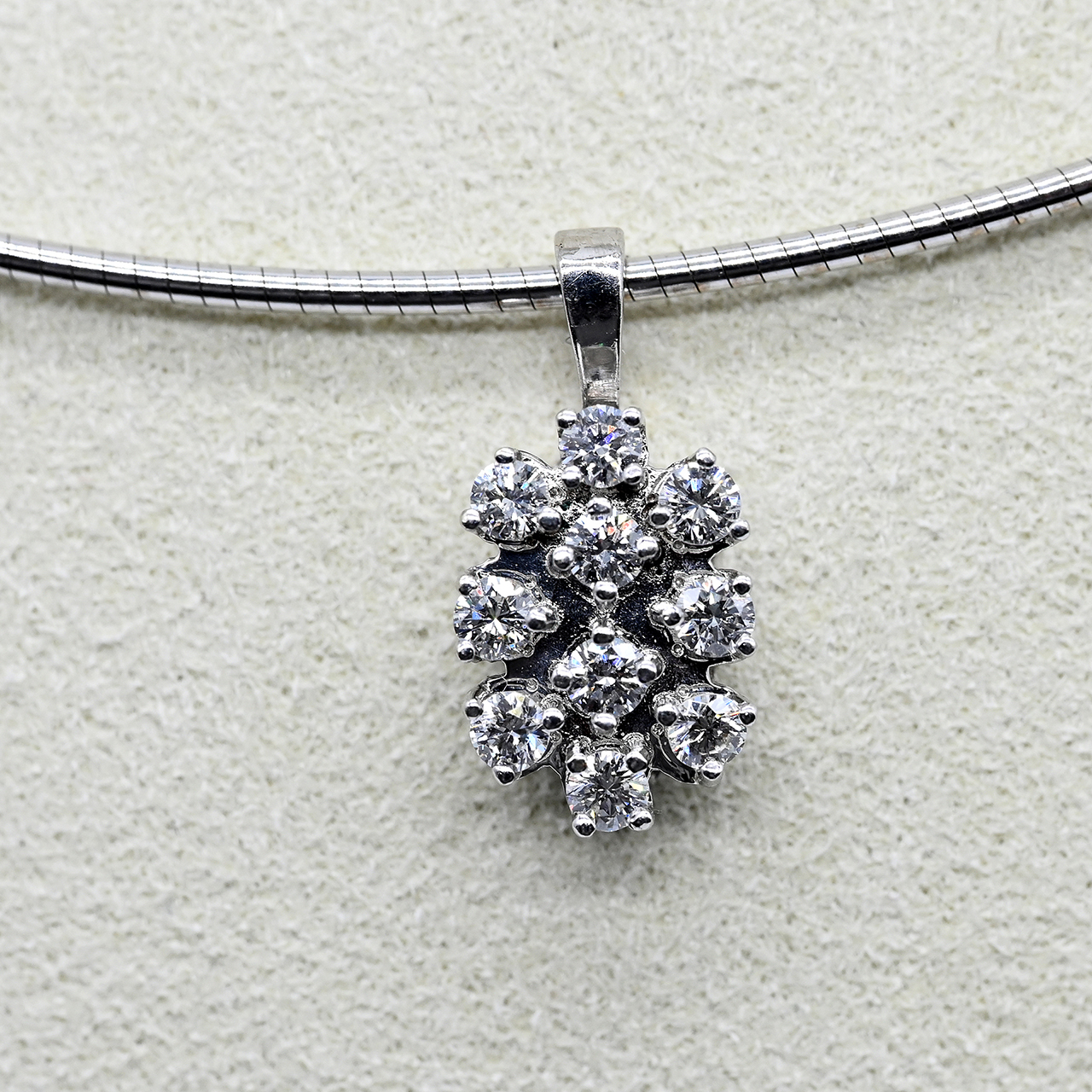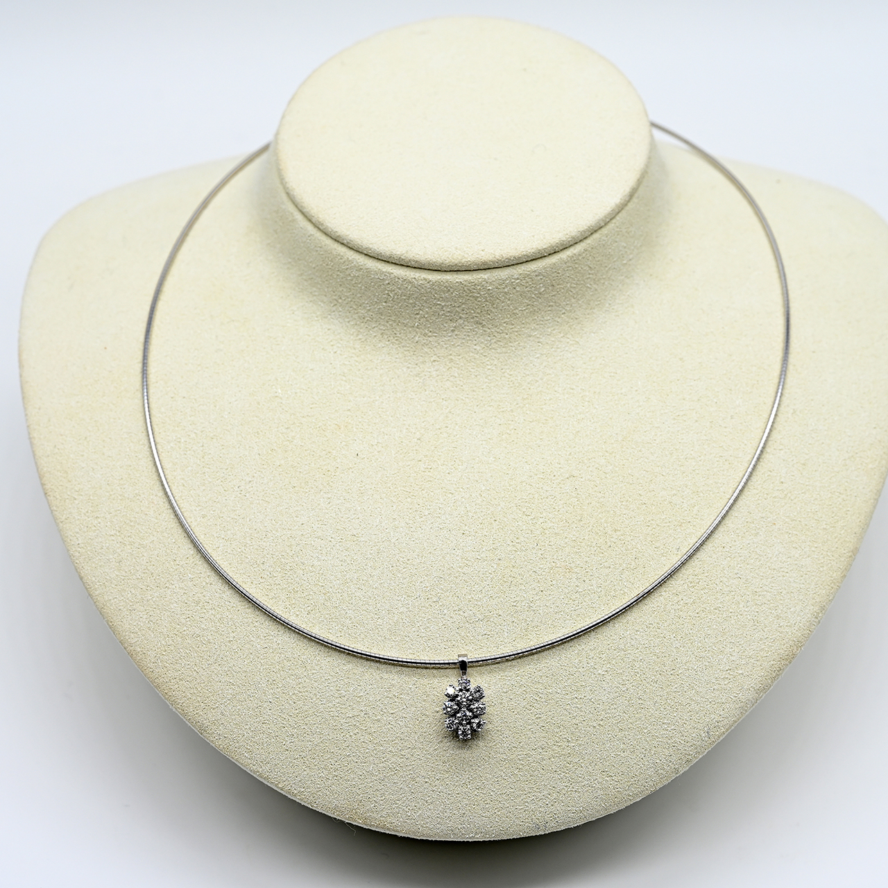 585/- Weißgold; Gesamtgewicht: ca. 6,5 g; hochovaler Anhänger aus 10 angeordneten Krappenfassungen; jeweils mit einem Brillanten ausgefasst, zus. ca. 0,35 ct; Farbe: F-H, Reinheit: VVSI-VSI; Einzelgewicht: ca. 0,96 g; festangesetzte Dreiecksöse; Maße des Anhängers: Länge inkl. Öse ca. 16,1 mm, Oval ca. 11,1 x 7,9 mm, Höhe ca. 4,7 mm; Halsreif in stilisierter, fester Reifform mit integriertem Drehsteckschloss; einzelnes Gewicht: ca. 5,6 g; Gesamtlänge: ca. 42 cm.