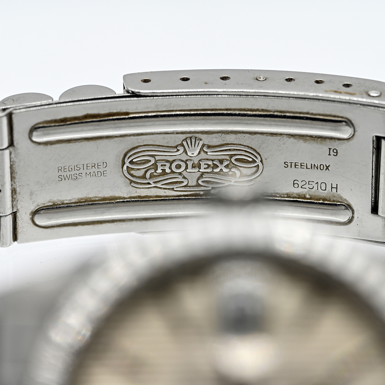 Steel; total weight: approx. 93.2 g; automatic movement; linearly hatched dial with date display at 3 o’clock; baton indices and luminous hands; sapphire crystal with magnifying lens; safety folding clasp; diameter of bezel: approx. 35 mm; visible wear and signs of use on the box; no guarantee on movement and function.