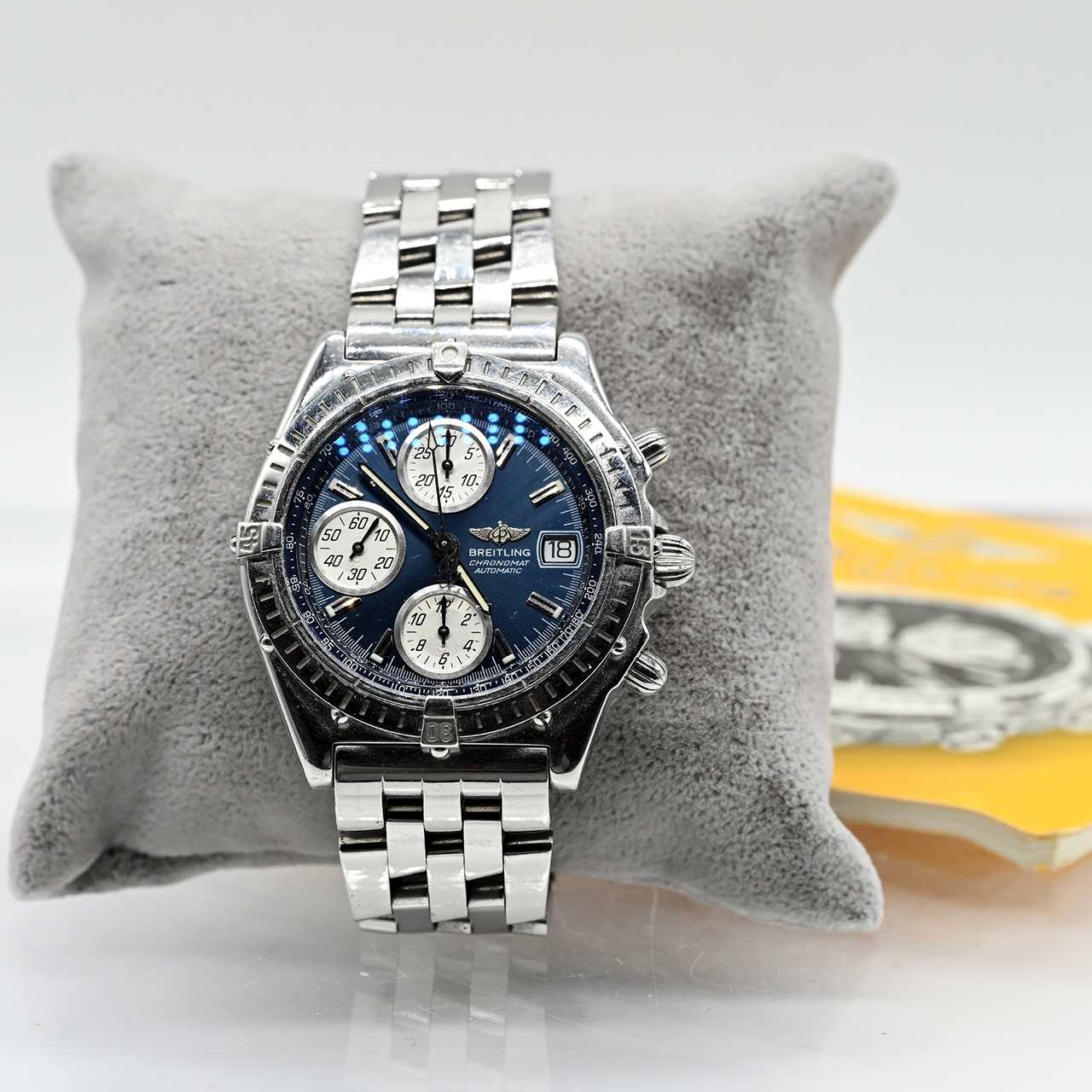 Steel; automatic movement; blued dial; in original box (with signs of use) and with instruction manual; diameter of bezel: approx. 37.2 mm; no guarantee on movement and function.