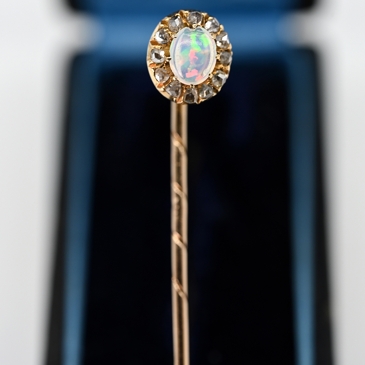 Krawattennadel mit Opal-Cabochon und 12 kleinen Diamantrosen, um 1900