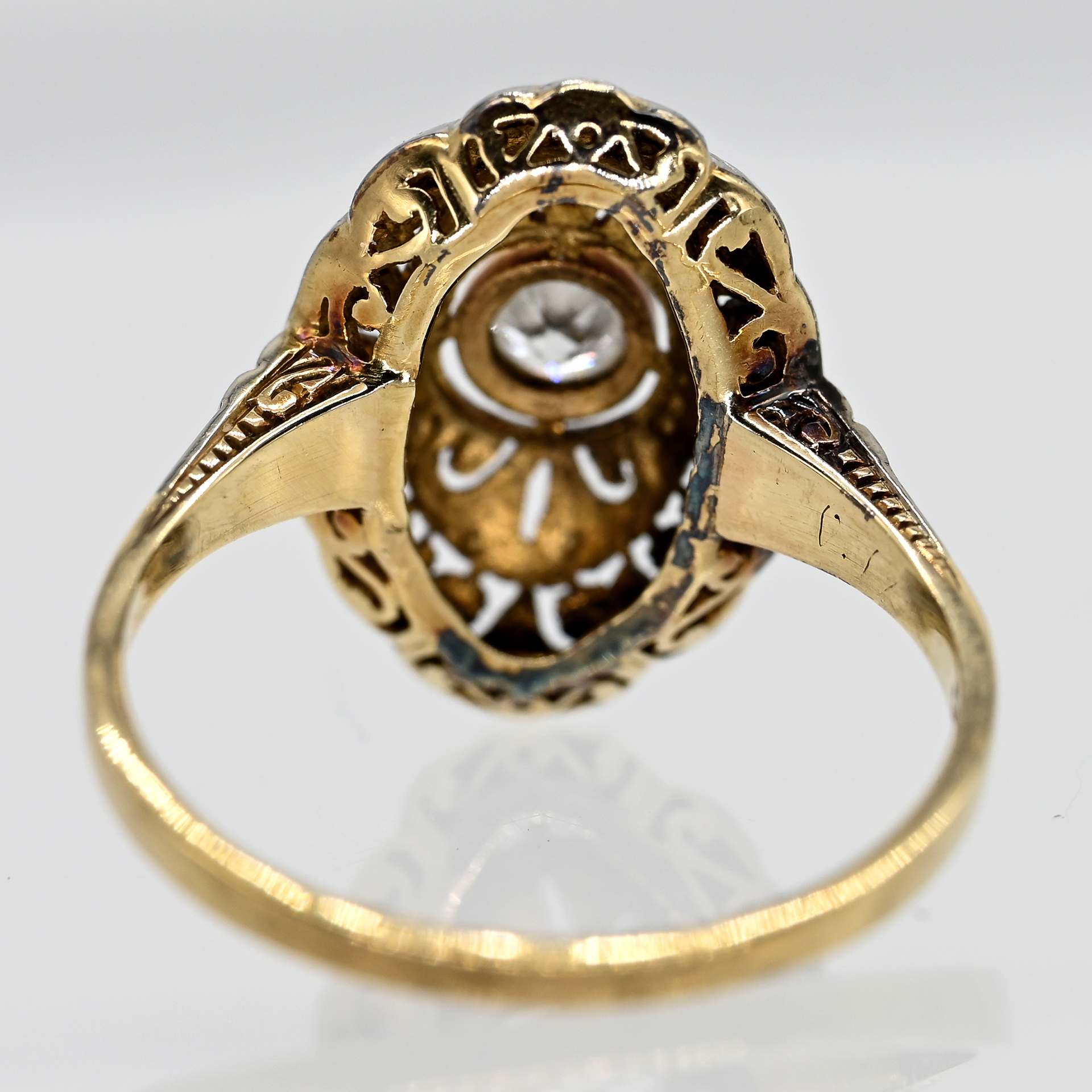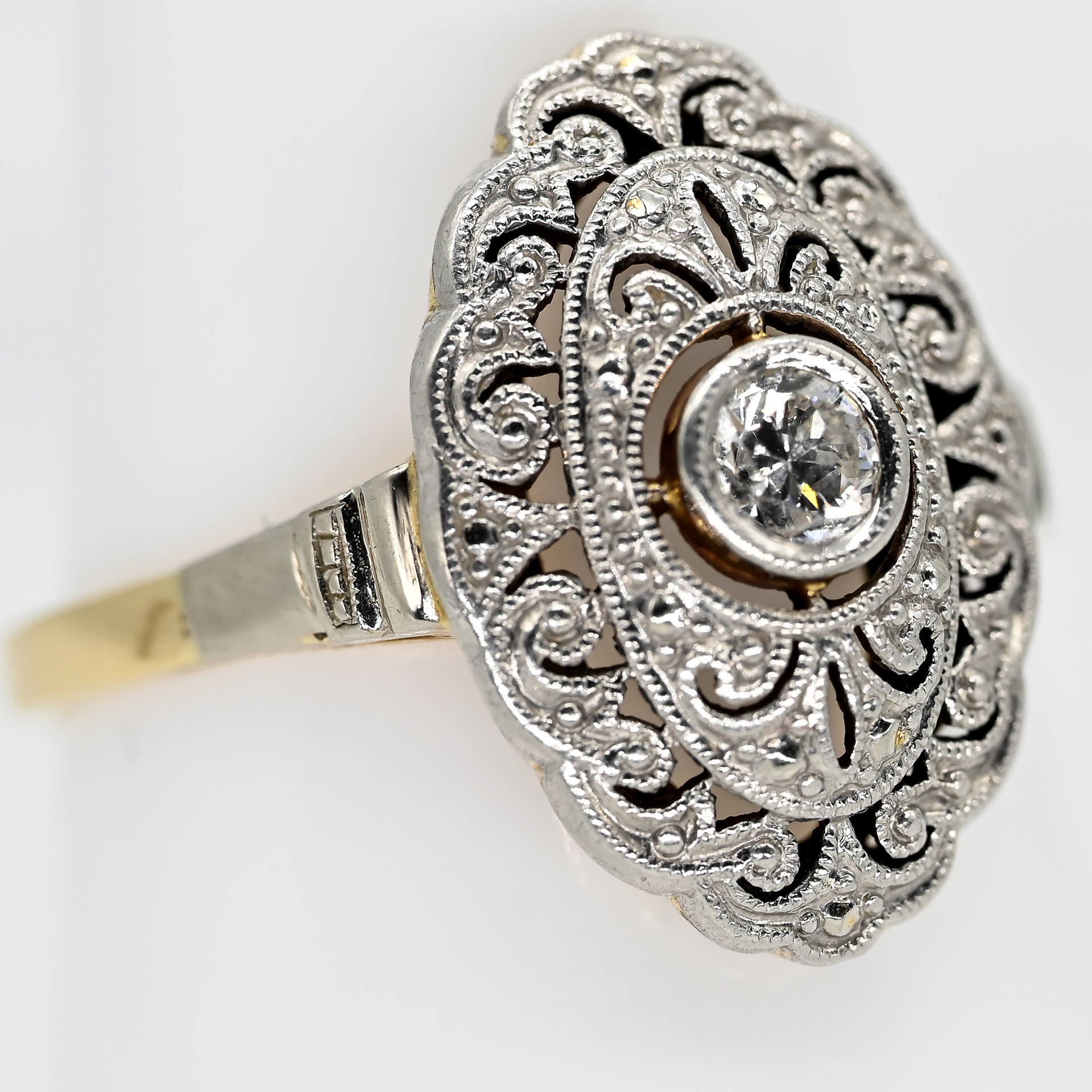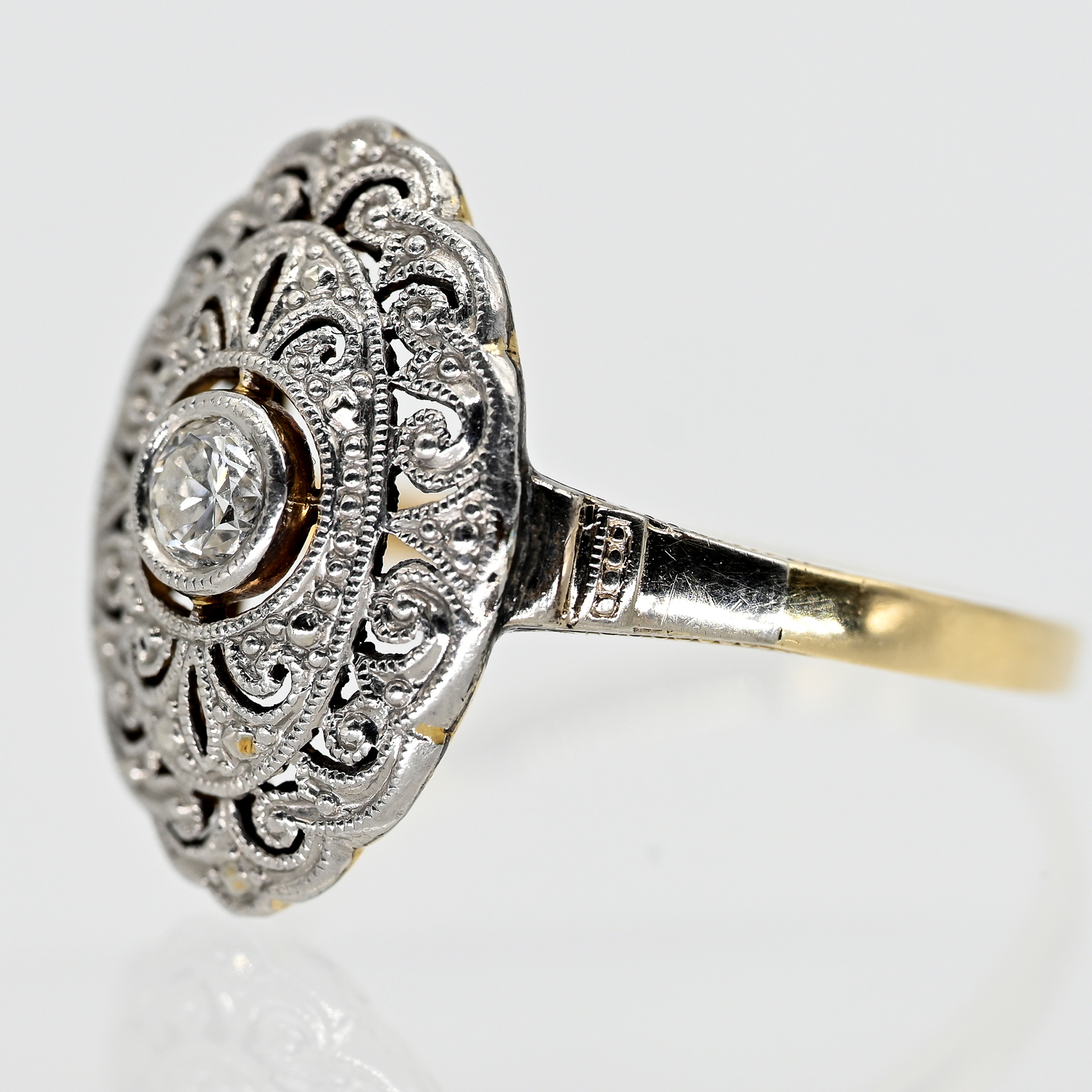 Gestempelt: 585/- Gelbgold, Silber parkettiert; Gesamtgewicht: ca. 2,27 g; hochovale, leicht gewölbte Ringmitte mit feinem Sägeschnittdekor, Millgriffrändern, Kugelbelötung und mehrpassigem Randabschluss; mittig in erhöhter Zargenfassung gefasster Altschliff-Diamant ca. 0,1 ct; Farbe und Reinheit: im mittleren Bereich; Maße der Ringmitte: ca. 16,1 x 10,9 mm; Ringgröße: 52,5.