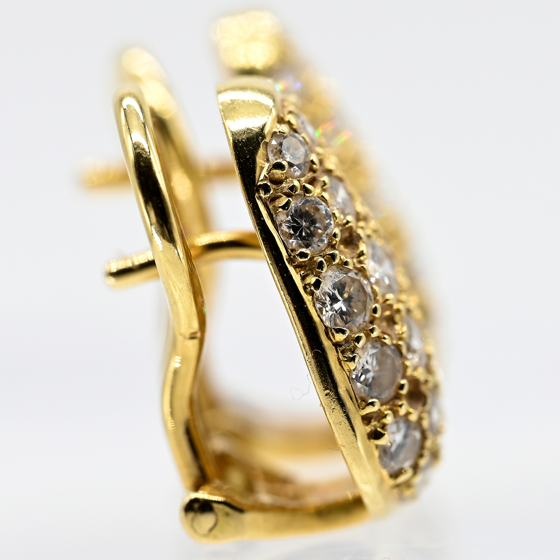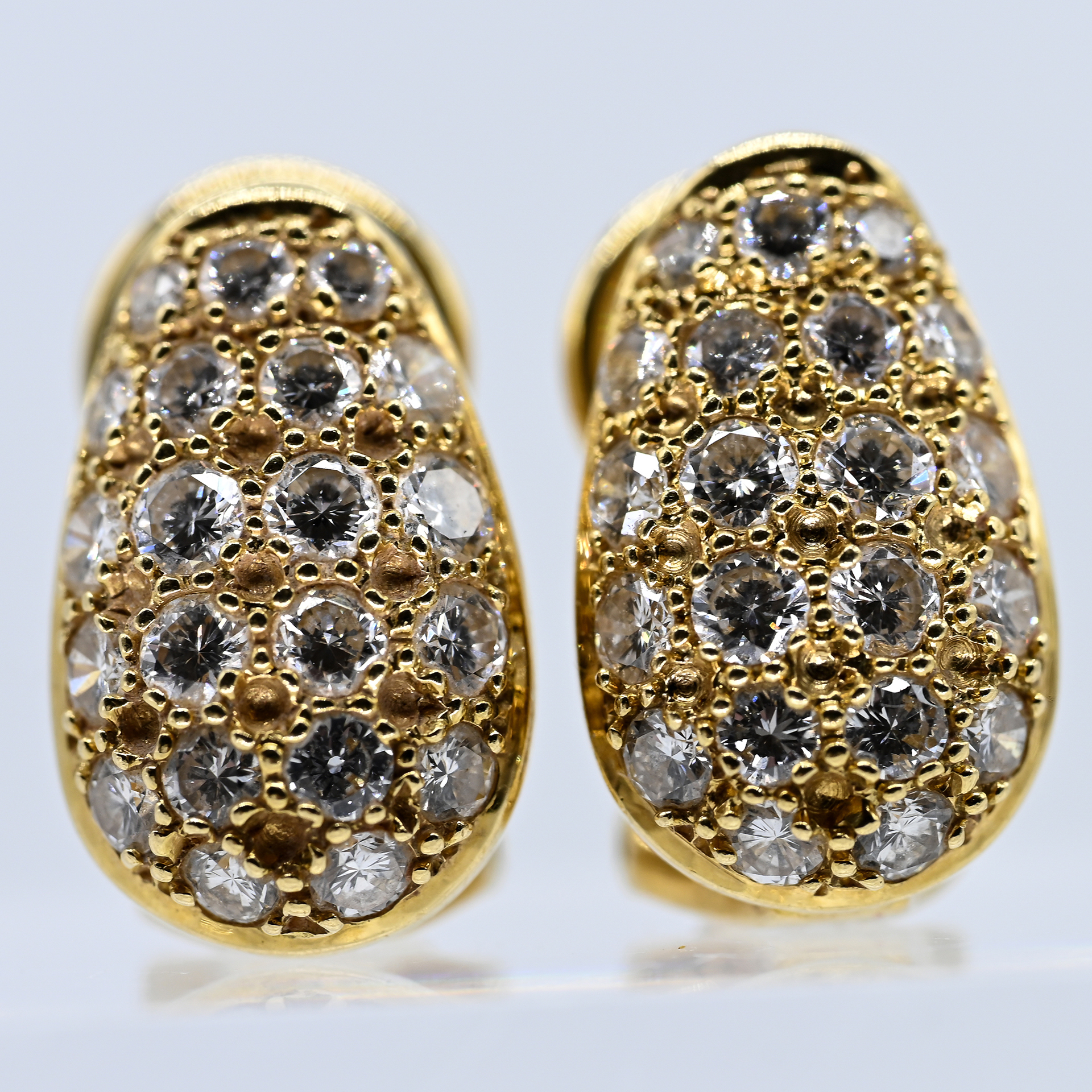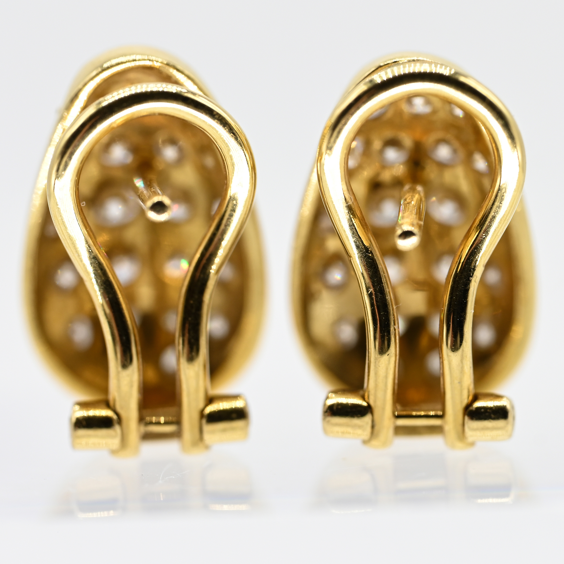 Gestempelt: 750/- Gelbgold; Gesamtgewicht: ca. 4,8 g; stilisierte, gewölbte Tropfenform; auf der Schauseite mit jeweils 21 Brillanten, in Pavé ausgefasst; zus. ca. 1,6 ct; Farbe: F-G; Reinheit: VS-VVS; Clip- und Steckermechanik; Maße der Schauseite: ca. 15,2 x 9,4 mm; Höhe: ca. 3,7 mm; auf der Clipinnenseite gestempelt: Leicht.