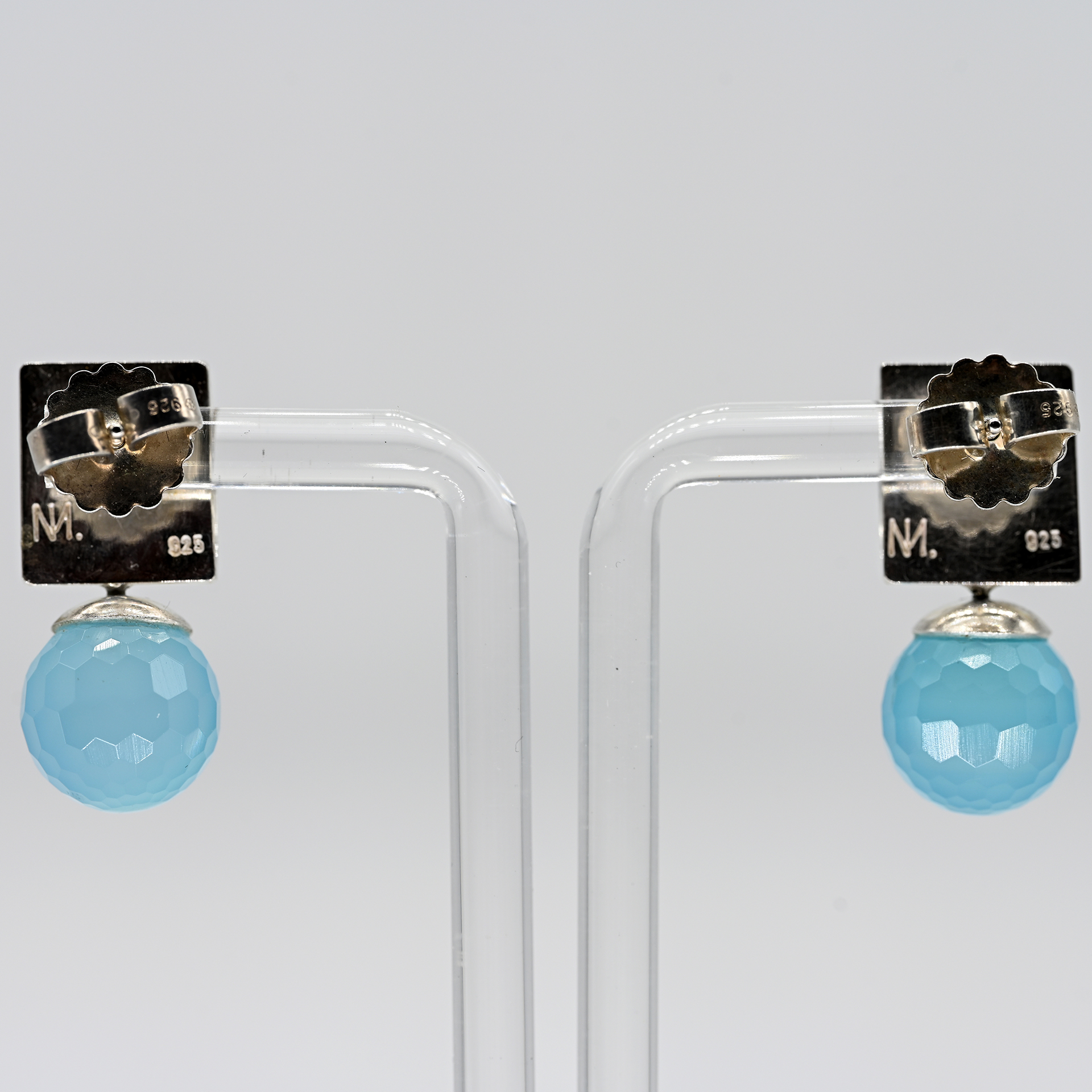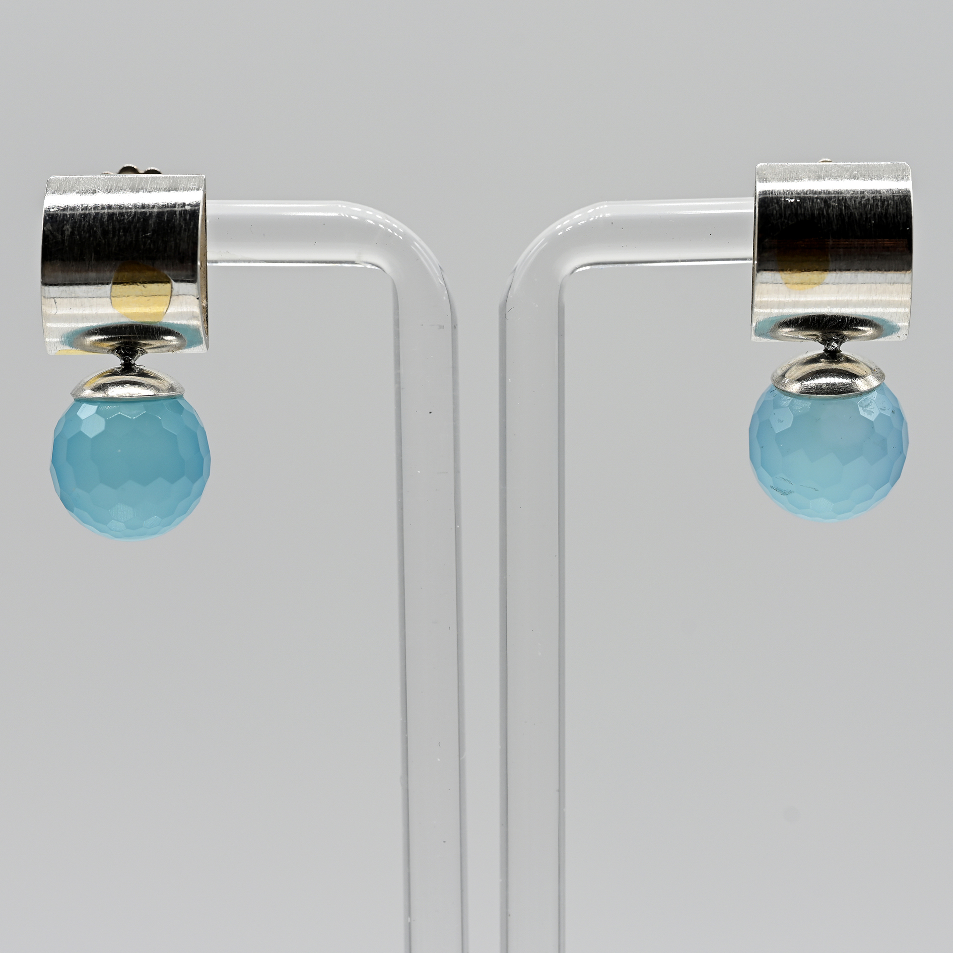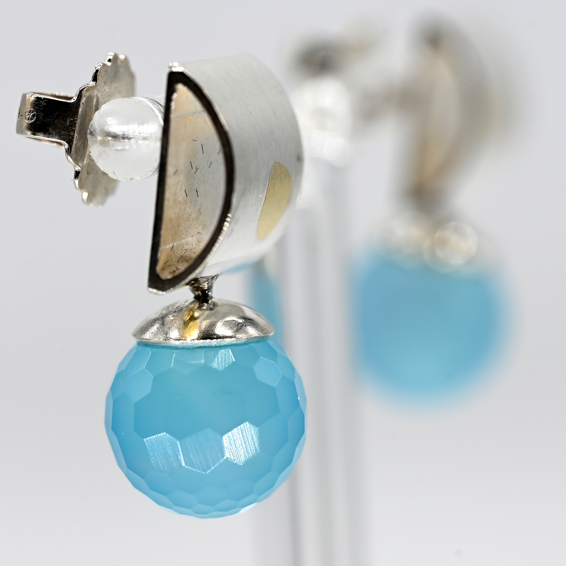Pair of stud earrings with faceted chalcedony spheres, goldsmith’s work, unsigned, 21st cent.