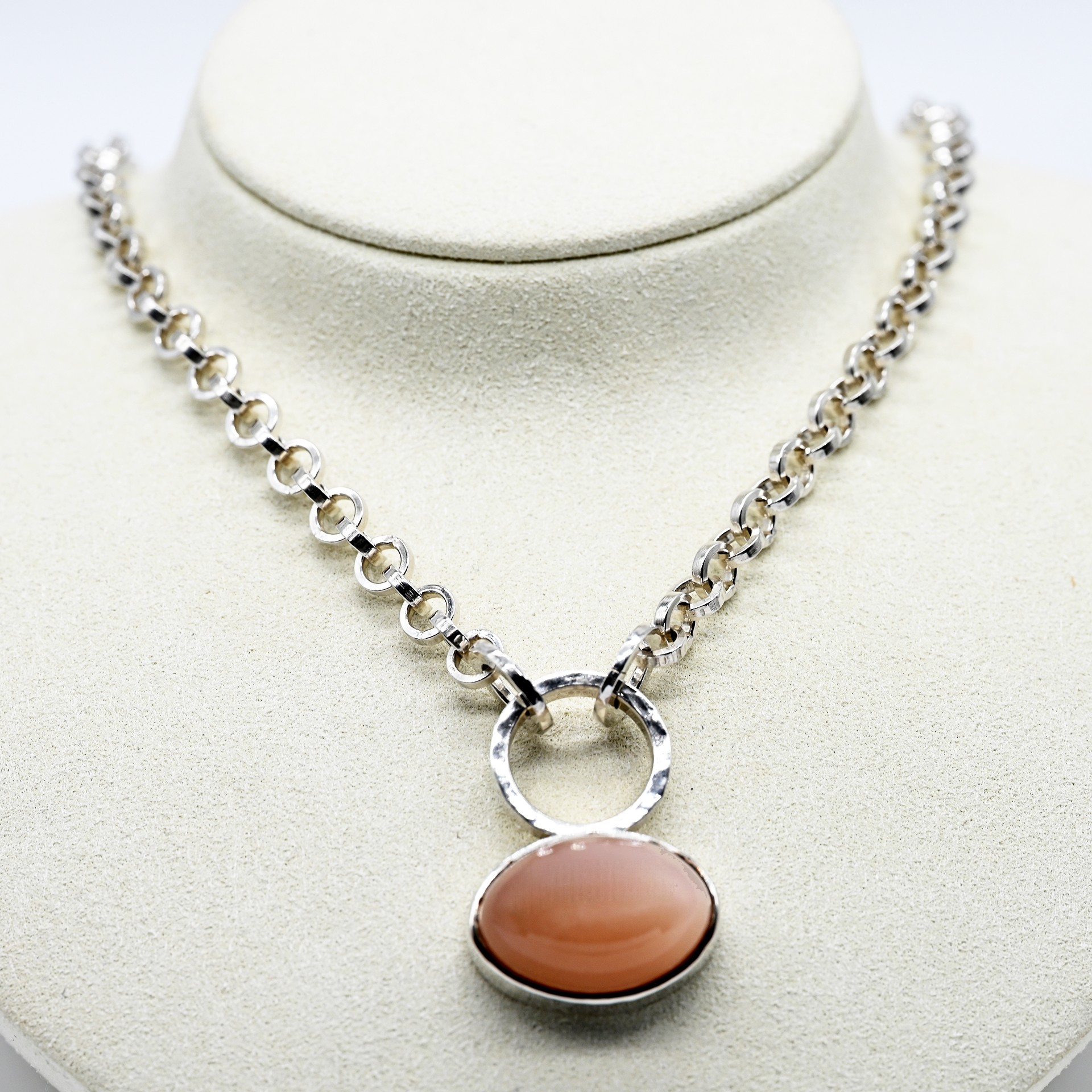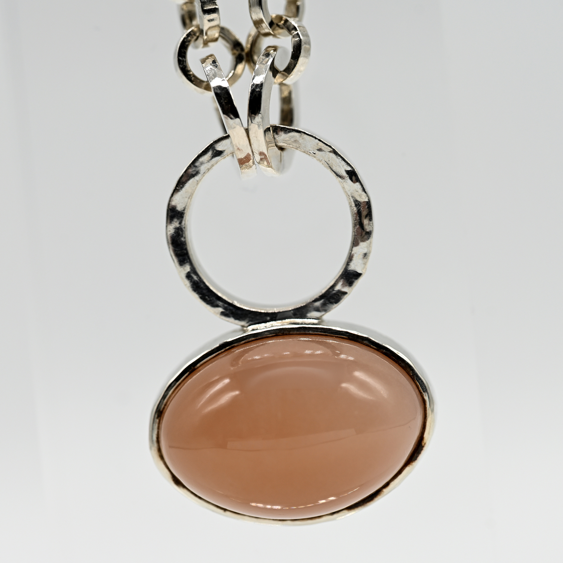 Gestempelt: 925/- Silber; Gesamtgewicht: ca. 50,9 g; ovaler Anhänger in zweigeteilter Form mit rosafarbenem Mondstein in silberner Zargenfassung unter Ring mit Hammerschlagdekor; feingliedrige Ösenkette, an zwei Punkten am Ring befestigt; Karabinerverschluss; Maße des Anhängers: ca. 35,4 x 25,6 x 14,4 mm; Durchmesser der Kettenösen: ca. 6,4 mm; Kettenlänge: ca. 50 cm.