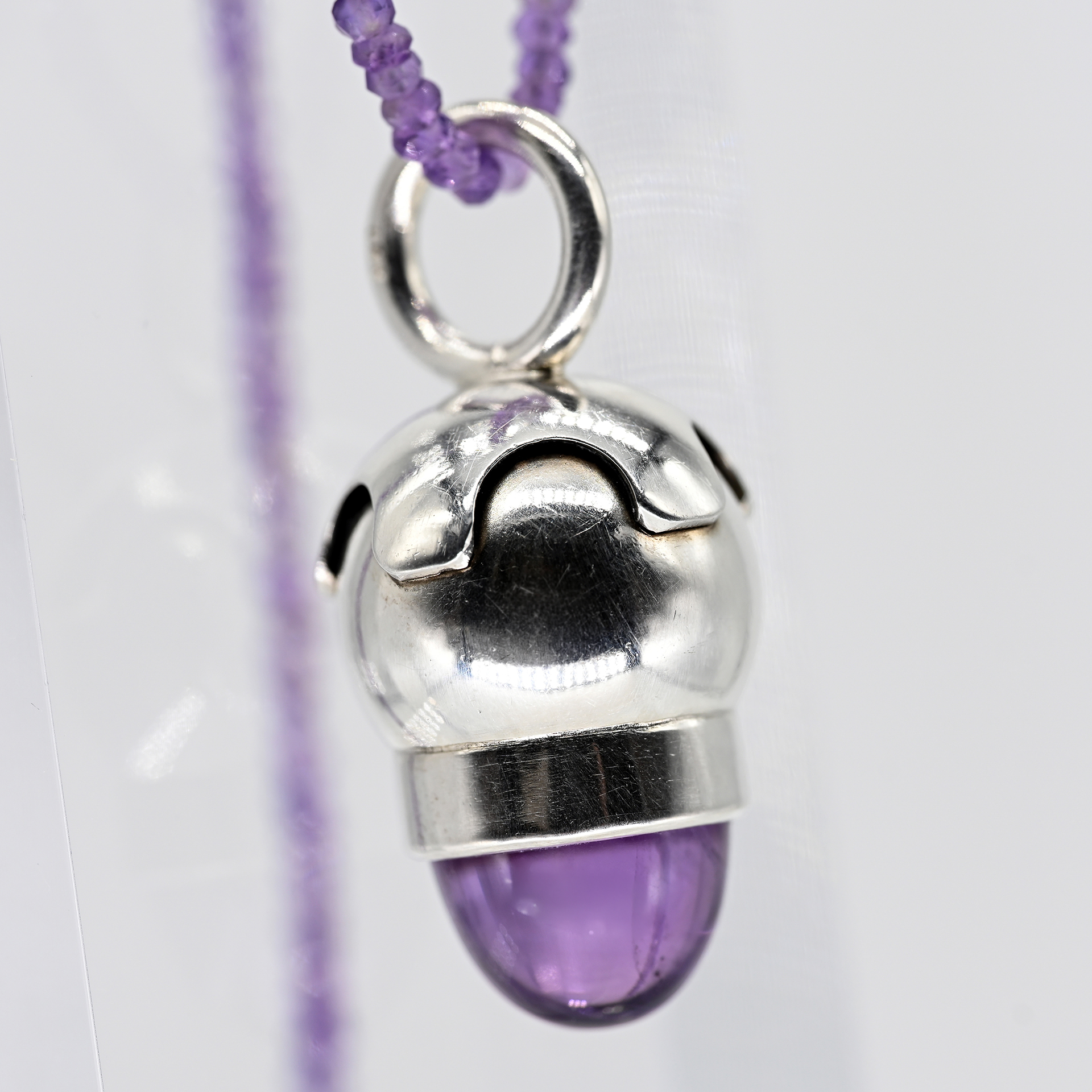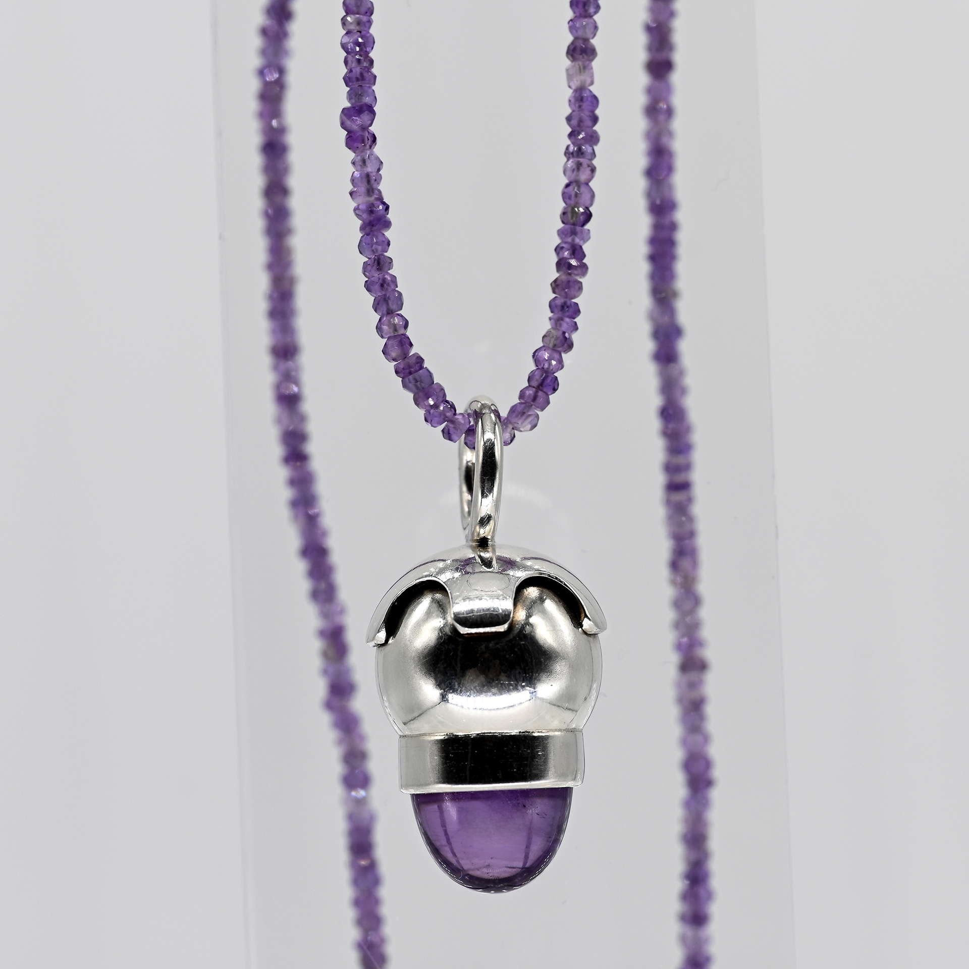 Gestempelt: 925/- Silber; Gesamtgewicht: ca. 16,1 g; massiver Anhänger in Flockenform mit Amethystcabochon; fein gegliederte Amethystkette; S-Verschluss; Höhe des Anhängers: ca. 34,7 mm; Länge des Colliers: ca. 55,9 cm.