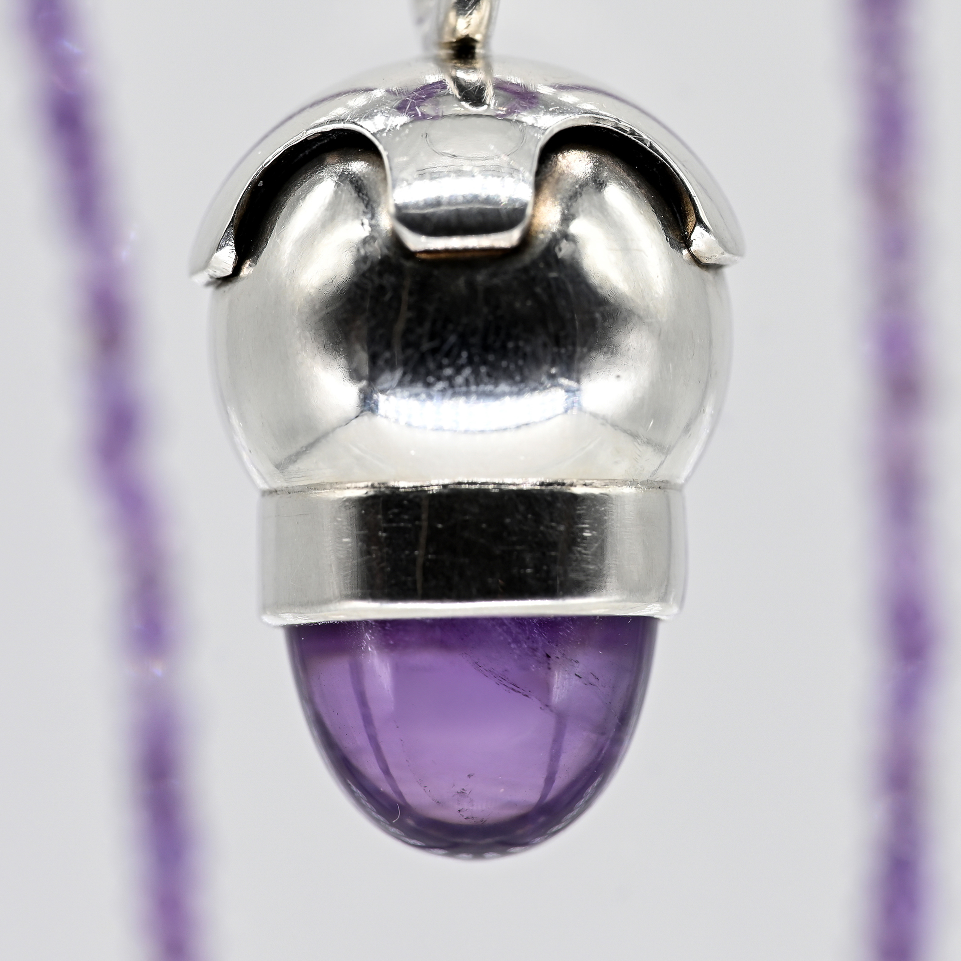 Stamped: 925/- silver; total weight: approx. 16.1 g; solid pendant in flake form with an amethyst cabochon; finely linked amethyst chain; S-hook clasp; height of the pendant: approx. 34.7 mm; length of the necklace: approx. 55.9 cm