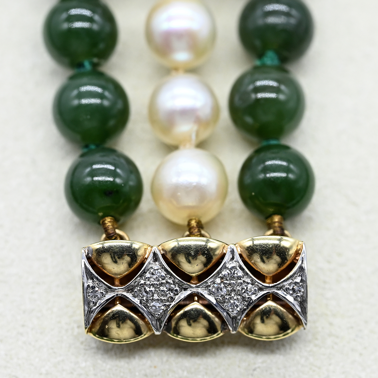 3-row necklace and 3-row bracelet, each with 2 strands of jade beads and 1 strand of pearls, gold clasps with small diamond setting, 1990s