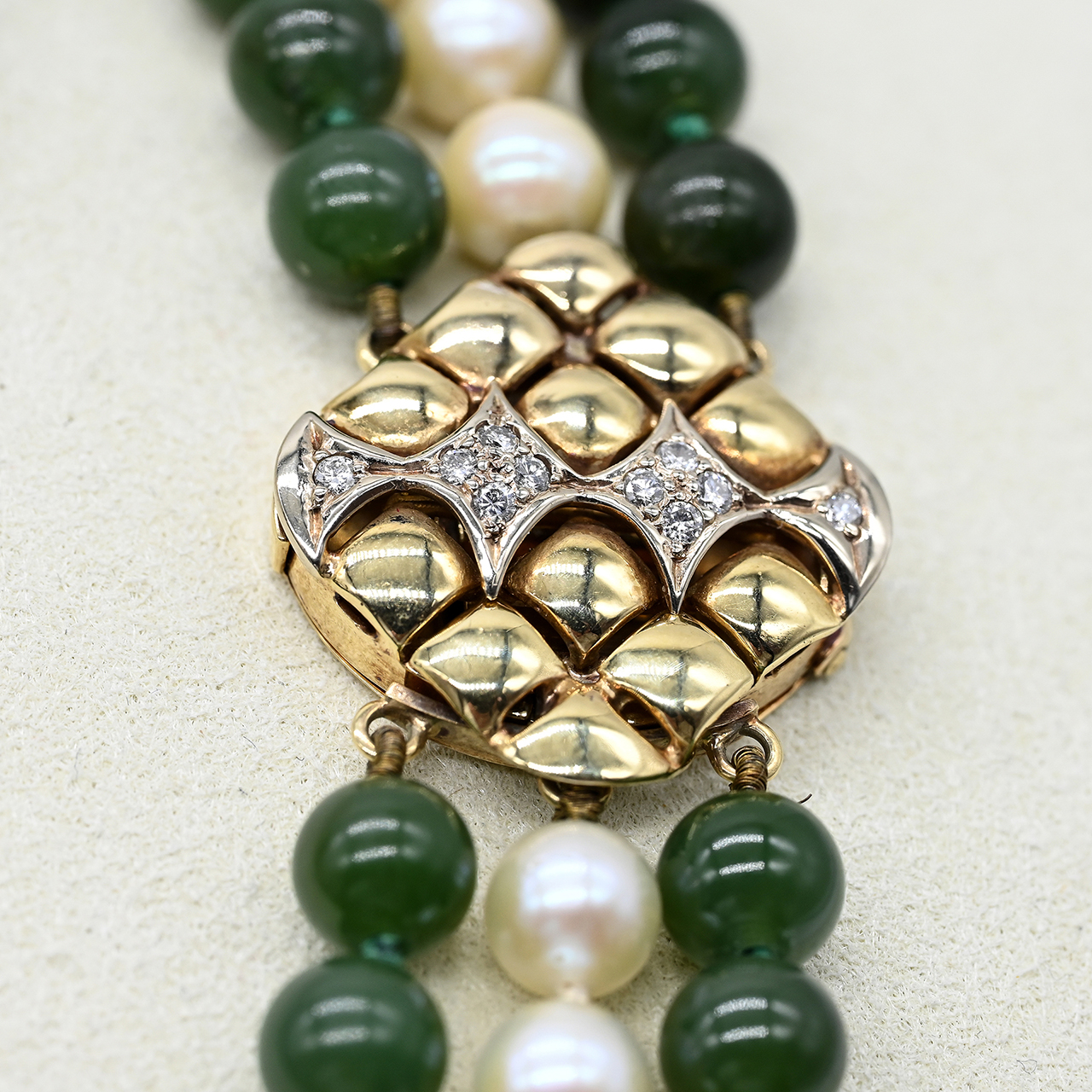 585/- Gelbgold; rauten- und rechteckförmige Kastenschlösser; im stilisierten durchbrochenen Wabenmuster; mittig unterteilt von einem rautenförmigen Band mit jeweils 10 kleinen gefassten Diamanten, zus. ca. 0,2 ct; Farbe und Reinheit: im mittleren Bereich; je 3-reihig und mit 2 Jadekugelsträngen in dunkelgrüner Farbvarietät, im Durchmesser ca. 7 mm, und 1 cremefarbenem Perlenstrang mit silberfarbenem Lüster und kleinen naturalistischen Merkmalen, im Durchmesser ca. 6,5 - 6,8 mm; Maße des Collier-Kastenschlosses: ca. 22,5 x 24,1 mm und des Armband-Kastenschlosses: ca. 19,8 x 9,2 mm; Gesamtlänge des Colliers: ca. 43,5 cm, ca. 44 cm, ca. 50 cm; Gesamtlänge des Armbandes: ca. 21 cm.