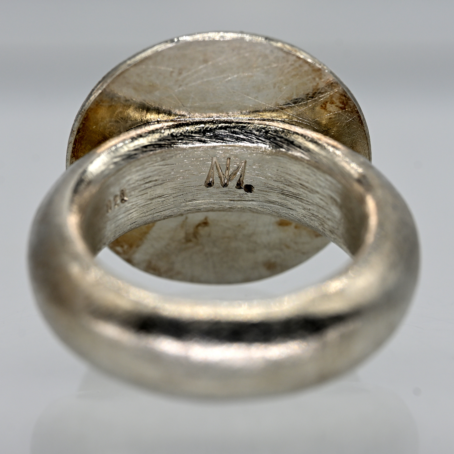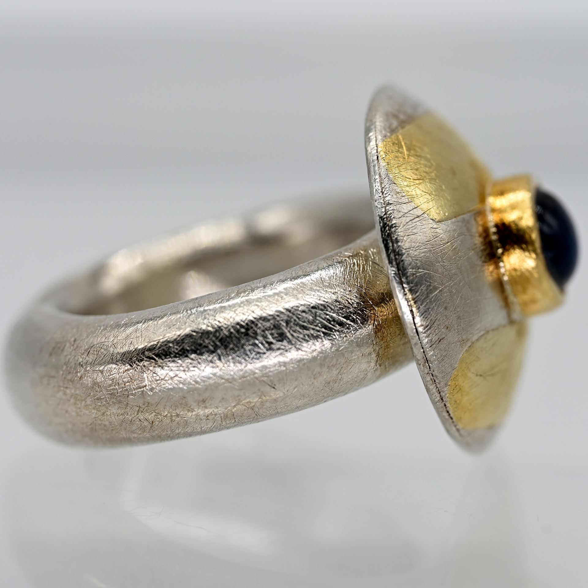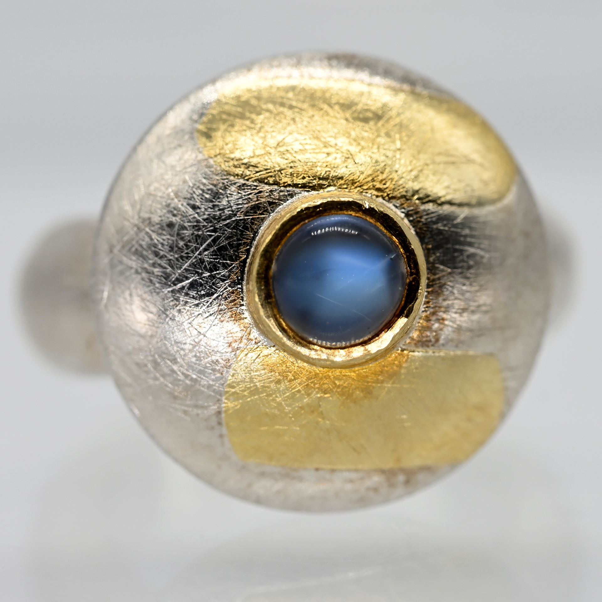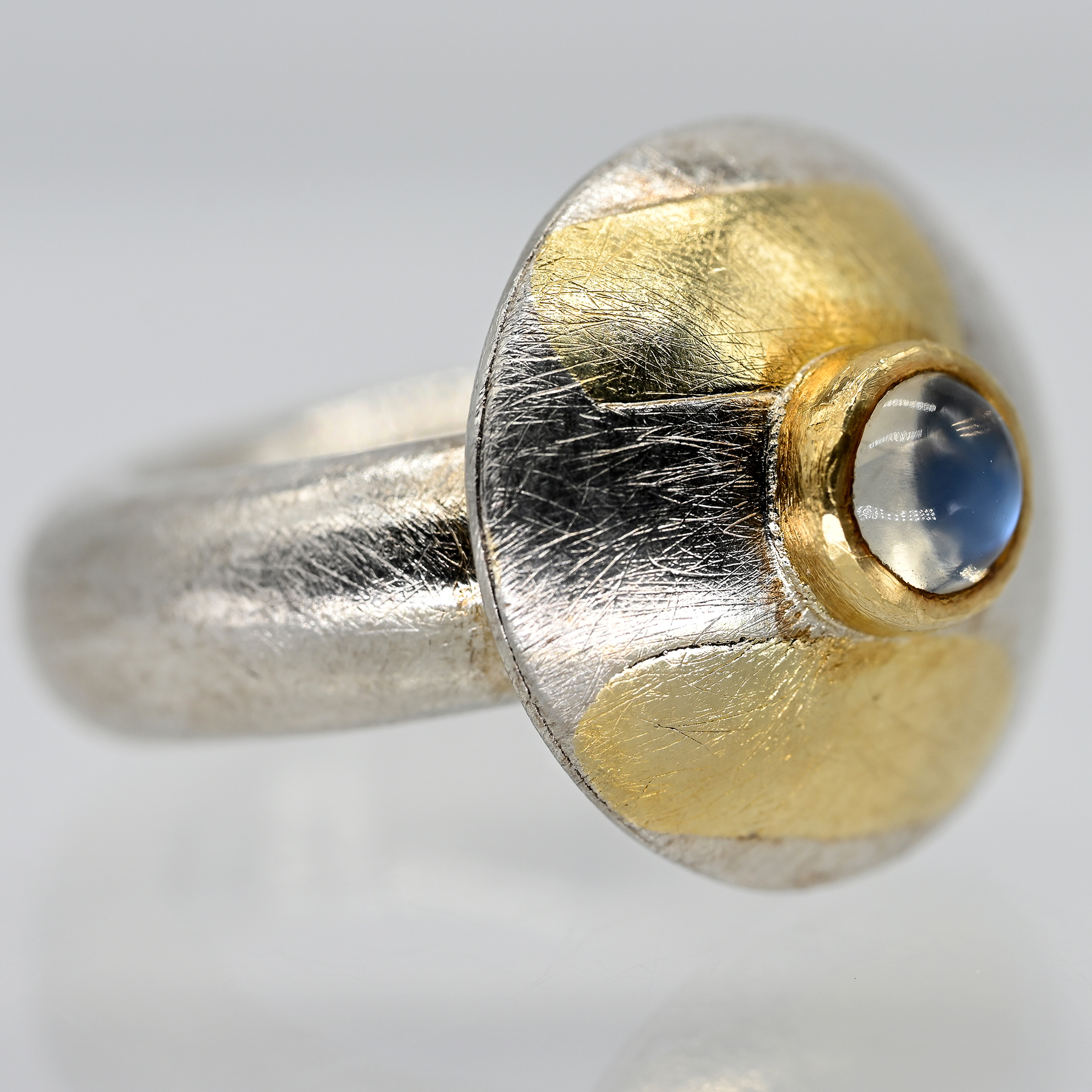 Gestempelt: 925/- Silber und Gelbgold; Gesamtgewicht: ca. 18,4 g; breite Ringschiene mit pilzförmiger Ringmitte mit amorpher Goldtauchierung und goldener Zargenfassung und kleinem Mondsteincabochon mit starker Adulareszenz; satinierte Oberflächenstruktur; Durchmesser der Ringmitte: ca. 19,6 mm; Durchmesser des Steines: ca. 6 mm; Ringgröße: 53,5.