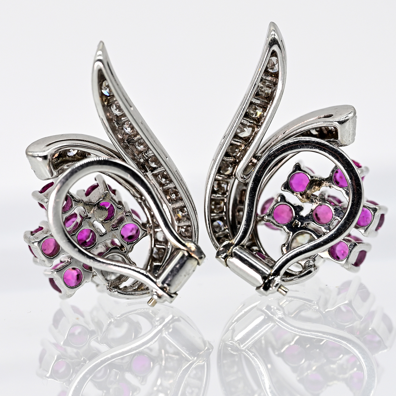 Paar Ohrclips mit 12 hochfeinen Rubinen, 2 Brillanten und 44 Melée-Brillanten, Juwelierarbeit, 80er Jahre