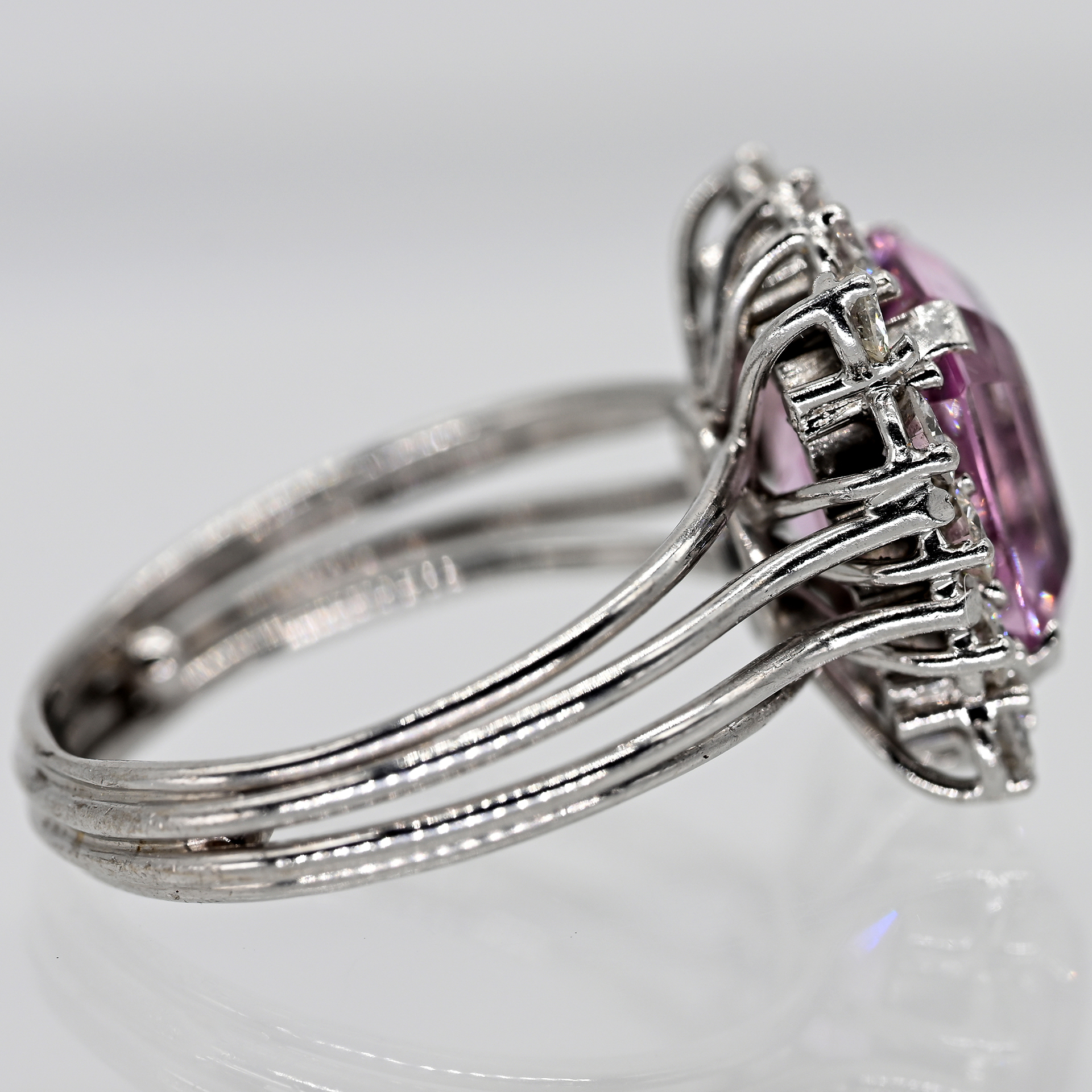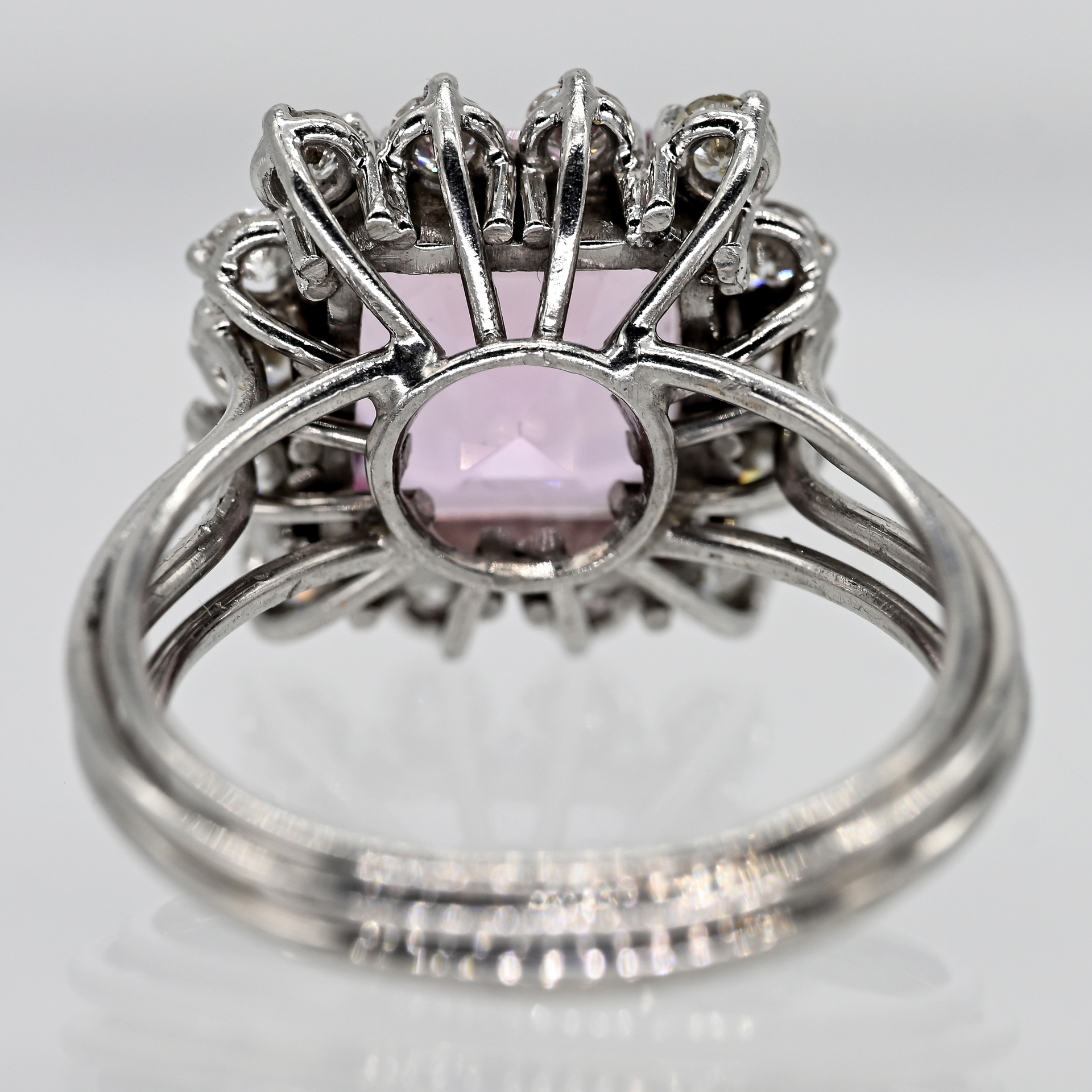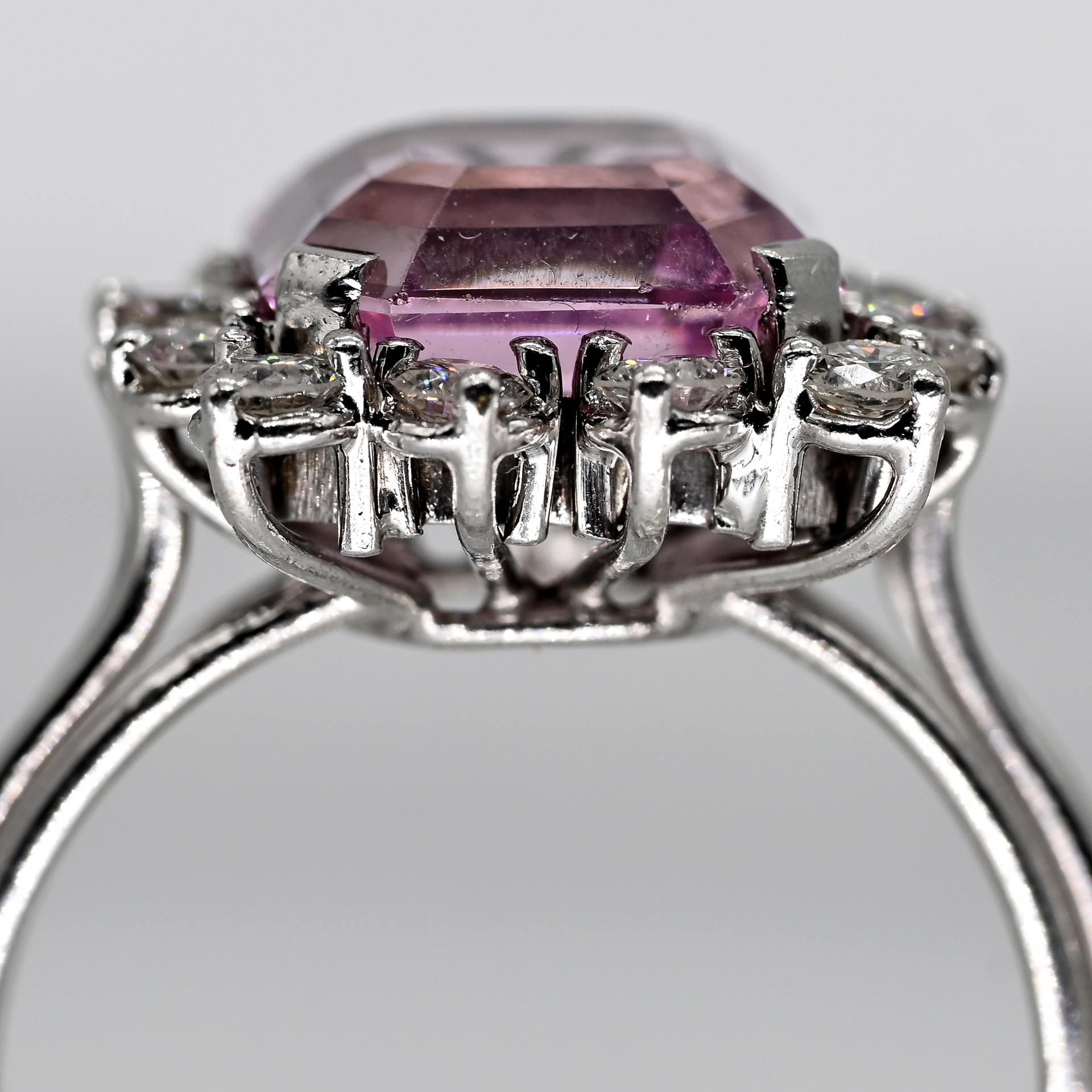 Gestempelt: 585/- Weißgold; Gesamtgewicht: ca. 6,5 g; in hochformatiger Rechteckform, stufenförmig angeordnete Krappenfassungen; zentral gefasster Morganit ca. 5 ct (Maße: ca. 10,8 x 10 mm; Höhe: ca. 6,76 mm); intensive pinkfarbene Farbvarietät; in Kissenschliffform; umrahmt von 14 Brillanten, zus. ca. 0,9(4) ct; Farbe: G-I (mittlerer Bereich); Reinheit: VVS-SI (oberer Bereich); Maße der Ringmitte: ca. 15,8 x 15,4 mm; Höhe: ca. 8,4 mm; vierfach gefächerte Ringschiene aus gebogenem Runddraht mit seitlichem Verlauf; Ringgröße: ca. 53,5.