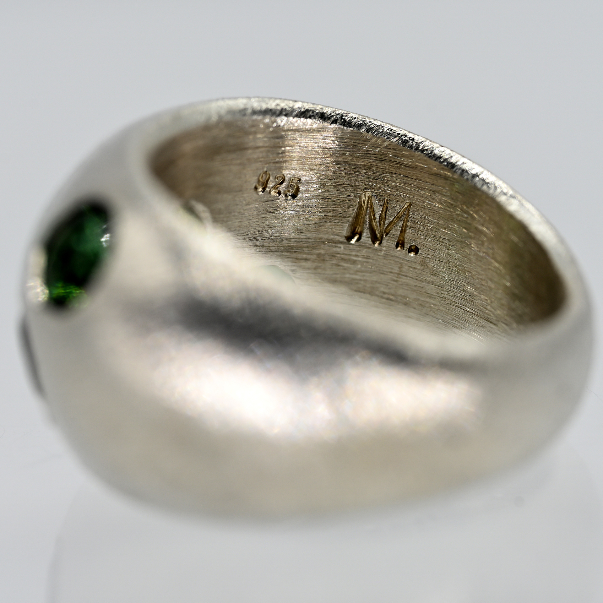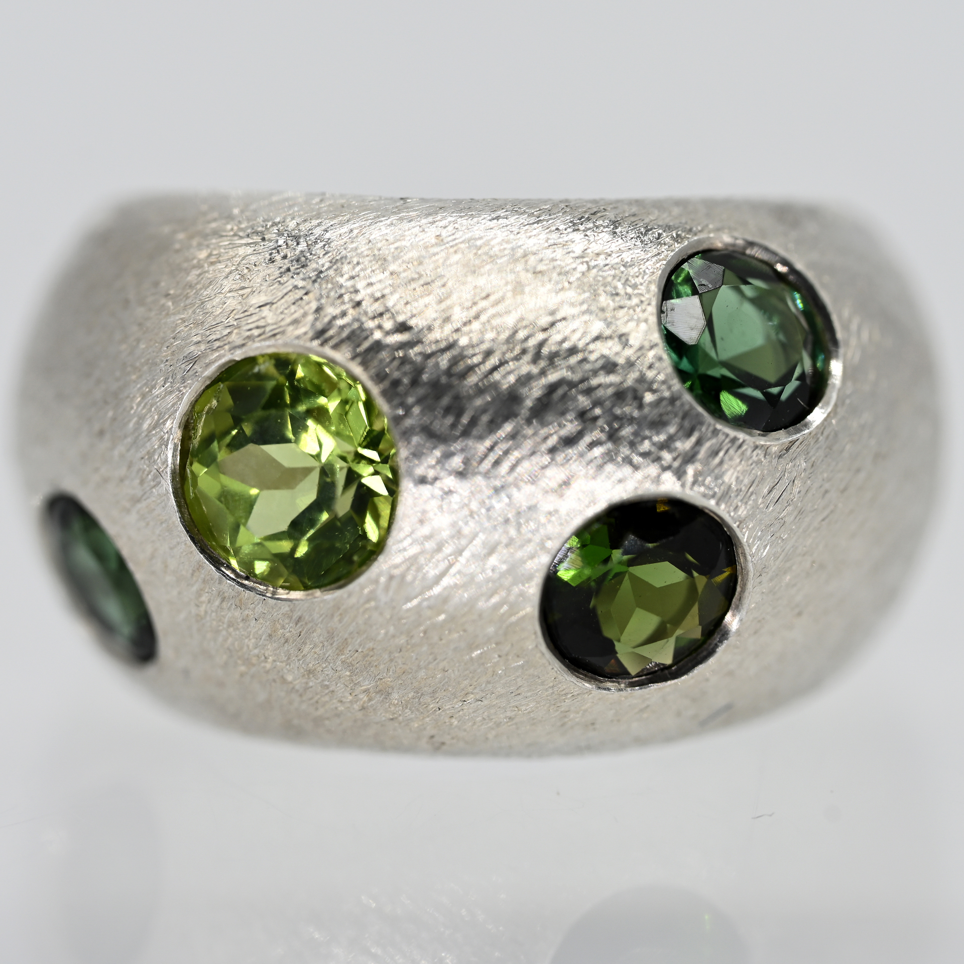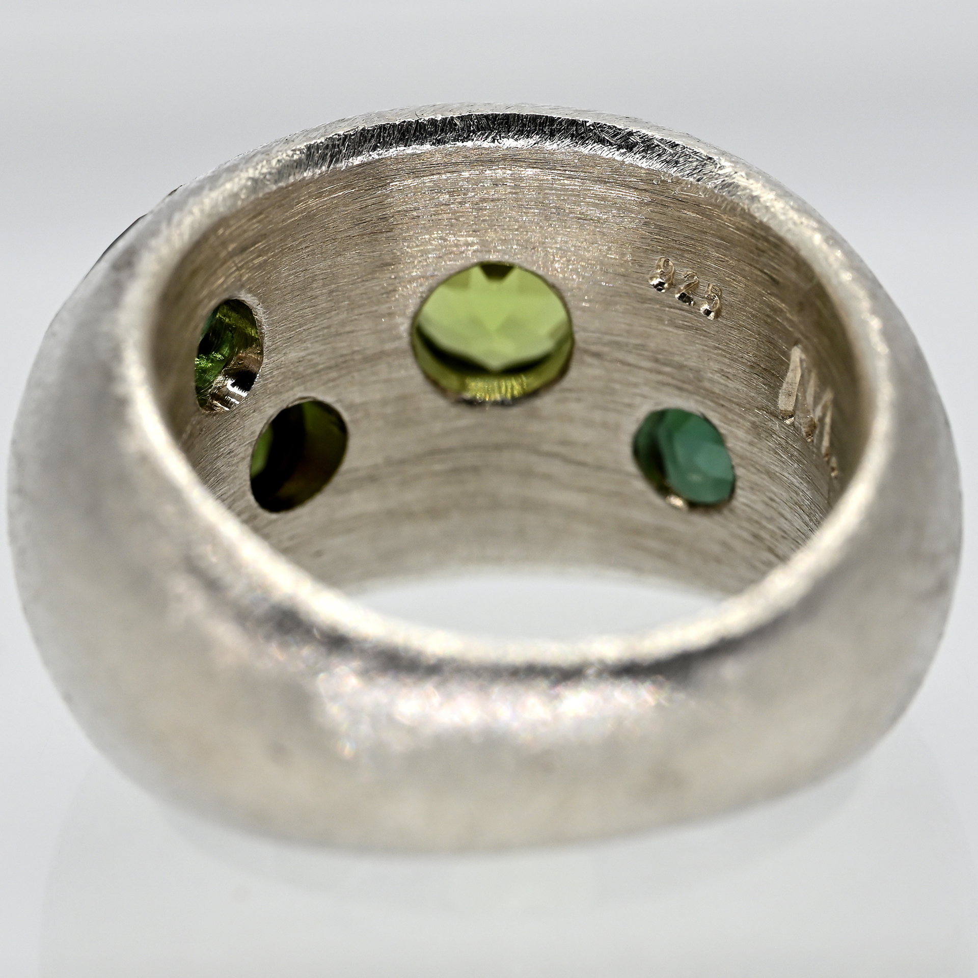 Gestempelt: 925/- Silber; Gesamtgewicht: ca. 17,3 g; gewölbte Ringschiene nach hinten verjüngt mit satiniertem Oberflächendekor; vier eingefasste runde, facettierte Turmaline in verschiedenen grünen Farbvarietäten; Durchmesser der Steine: von ca. 5,2 mm bis ca. 6,3 mm; Ringgröße: ca. 54.