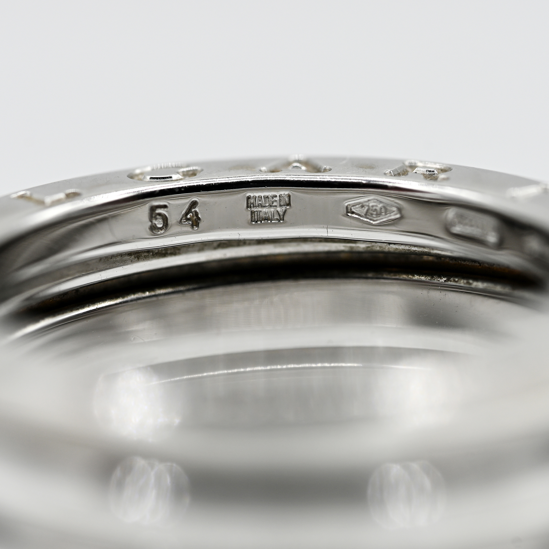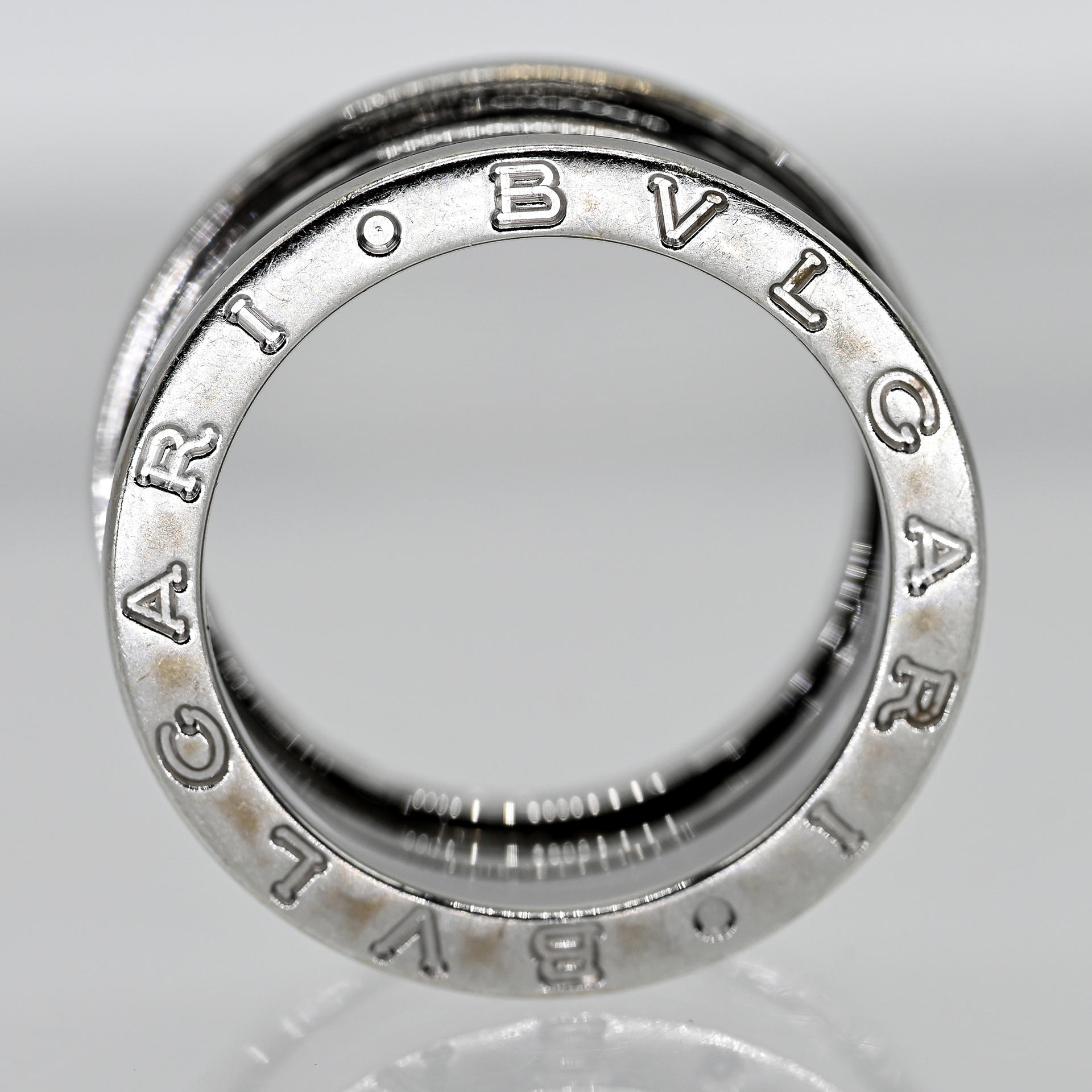 Gestempelt: 750/- Weißgold; Gesamtgewicht: ca. 10,5 g; breite, bewegliche Spiralform; auf den äußeren Rändern zweifach graviertes Logo BVLGARI; Breite des Ringes: ca. 9,9 mm; Ringgröße: 54; umlaufend erkennbare Tragespuren.
