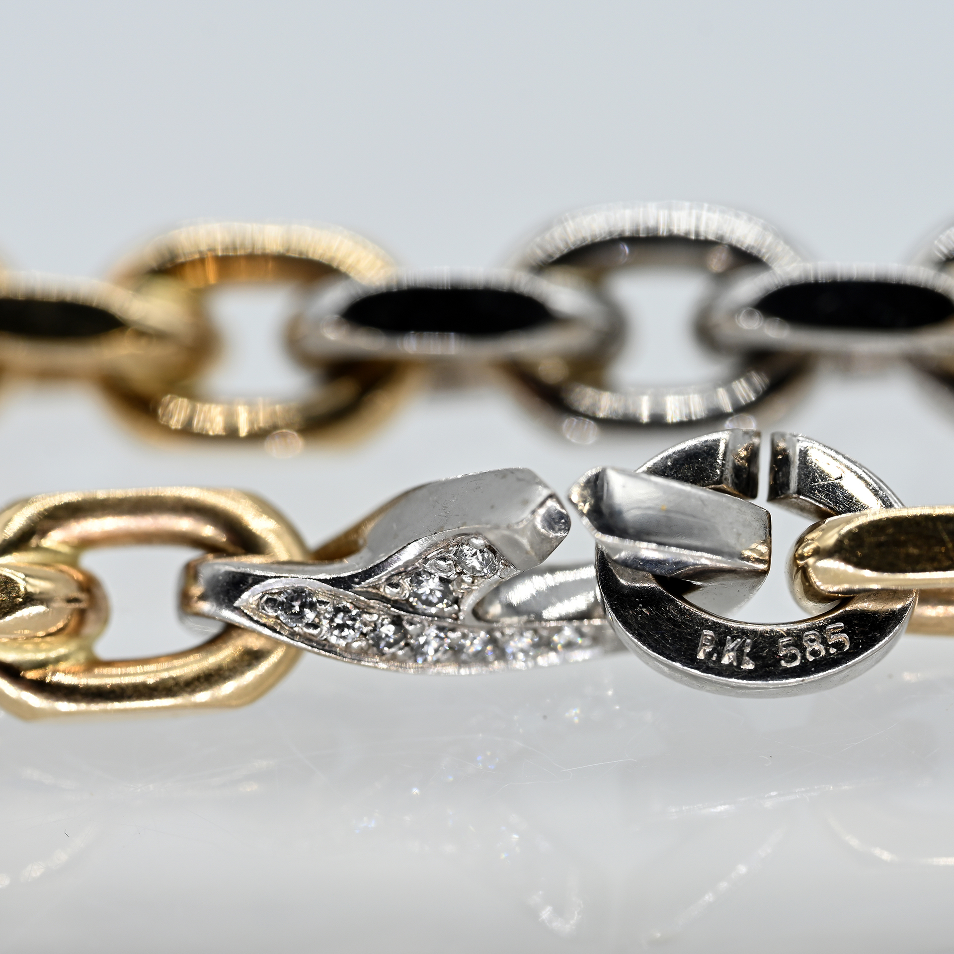 Gestempelt: 585/- Gelbgold; Gesamtgewicht: ca. 48,6 g; jeweils abwechselnd 3 weißgoldene und 3 gelbgoldene ovale Glieder, längsseitig abgeflacht; Verschluss in Karabinerhakenform von 10 Melée-Brillanten konturiert, zus. ca. 0,1 ct; Farbe und Reinheit: im oberen Bereich; Maße der Glieder je ca. 7,5 x 11,5 mm, Stärke: ca. 2,5 mm; Gesamtlänge: ca. 20,5 cm.