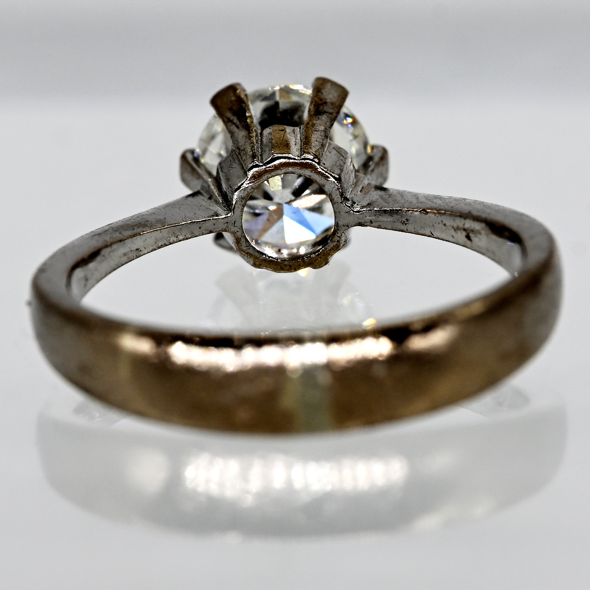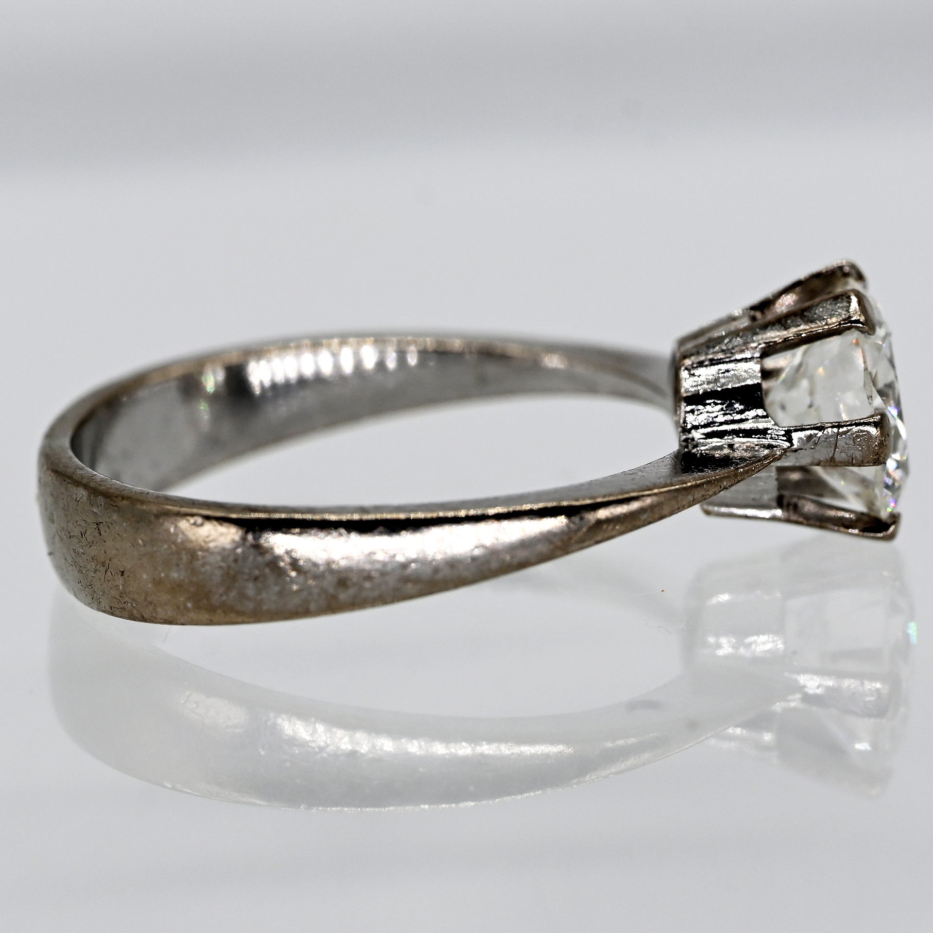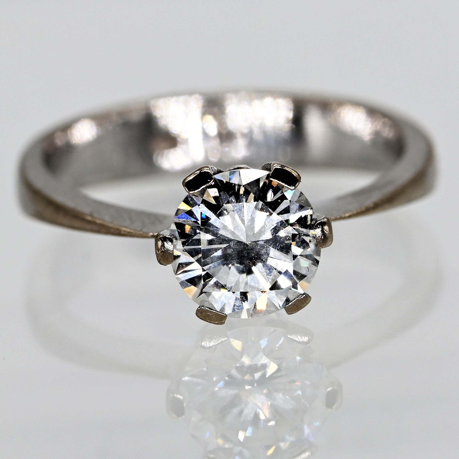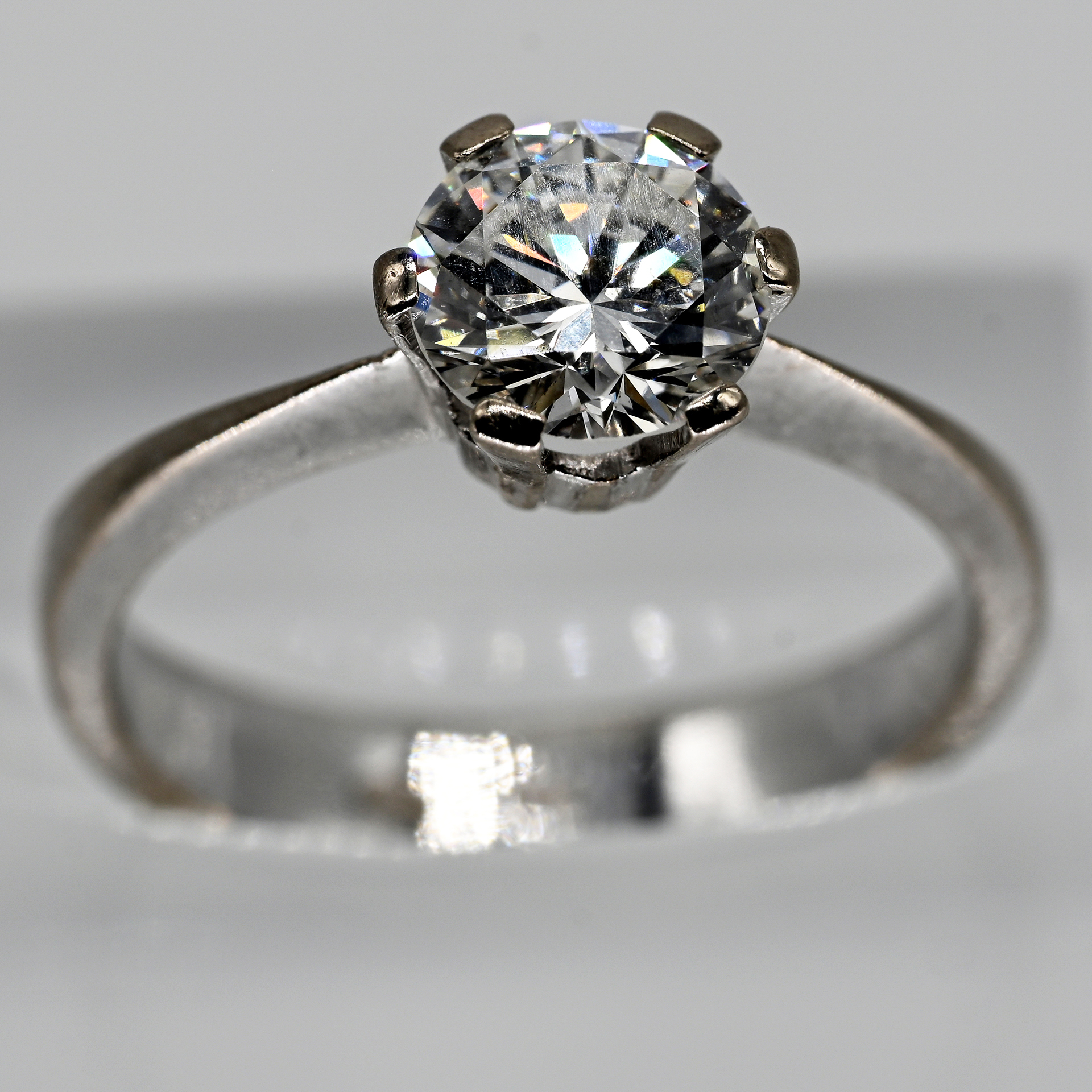 Stamped: 750/- white gold and an unidentified hallmark; total weight: approx. 3.9 g; six-prong raised crown setting and a plain tapered band; centrally set brilliant-cut diamond approx. 1.3 (9) ct; colour: E-F; clarity: VVSI-VSI; dimensions of the ring head: diameter: approx. 7.5 mm, height: approx. 6.2 mm; ring size: 54; band surface with lightly visible signs of wear.