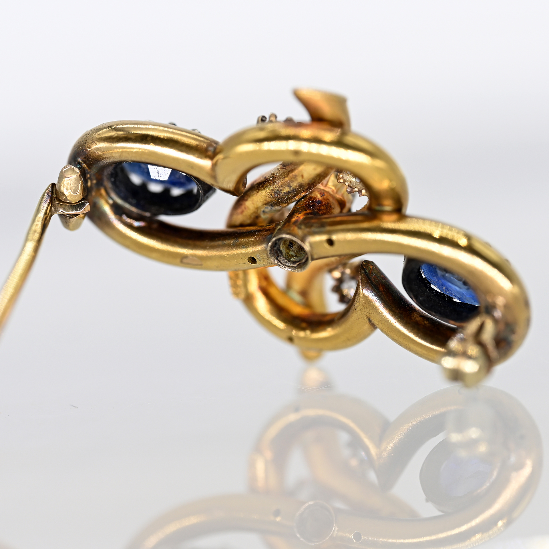 Brosche mit 2 blauen Farbsteinen und 5 Altschliff-Diamanten, zus. ca. 0,3 ct, um 1900