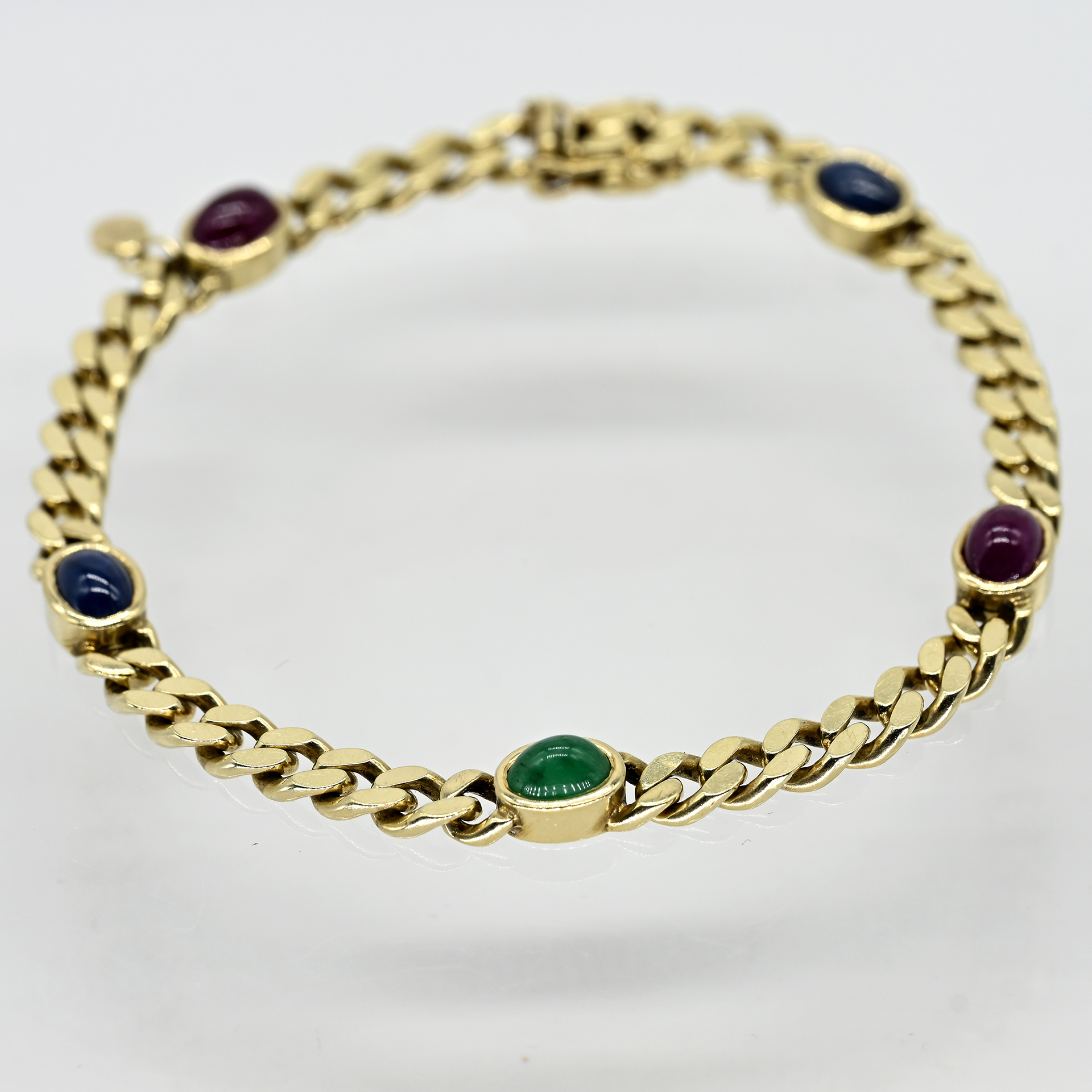 Stamped: 585/- yellow gold; total weight: approx. 21 g; flat curb-link bracelet; regularly segmented by horizontally set bezel settings; each segment set with 2 sapphires, 2 rubies and 1 emerald cabochon, intense colour varieties of good quality; concealed box clasp with lateral safety catches; width of the bracelet: approx. 5.2 mm and 6.5 mm; total length: approx. 20 mm; surface with slight signs of wear.