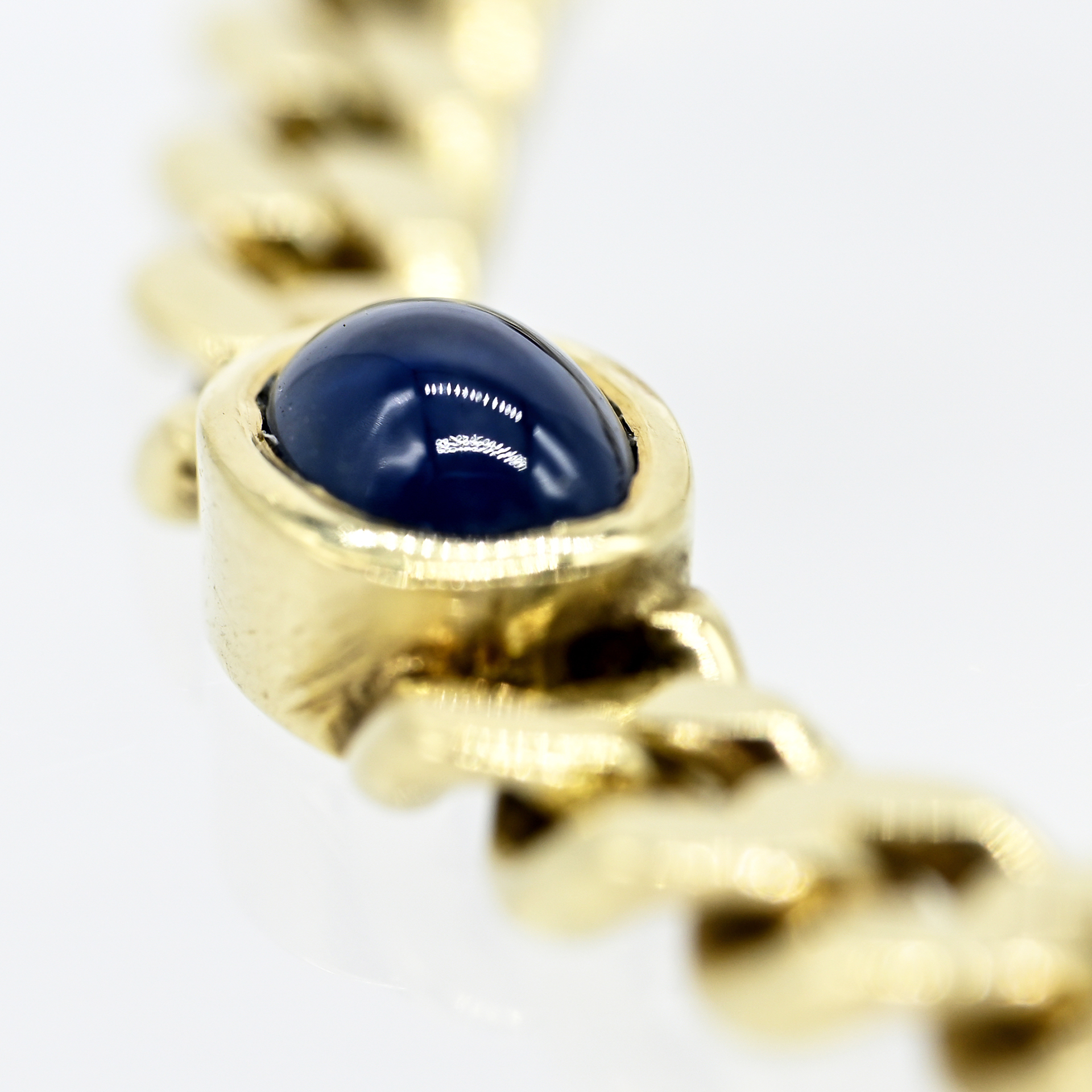 Gestempelt: 585/- Gelbgold; Gesamtgewicht: ca. 21 g; Flachpanzerarmband; regelmäßig unterteilt von horizontal eingesetzten Zargenfassungen; jeweils unterteilt von 2 Saphiren, 2 Rubinen und 1 Smaragd-Cabochon, intensive Farbvarietäten in guter Qualität; verdecktes Kastenschloss mit seitlichen Sicherheitsachten; Breite des Armbandes: ca. 5,2 mm und 6,5 mm; Gesamtlänge: ca. 20 mm; Oberfläche mit leichten Gebrauchsspuren.