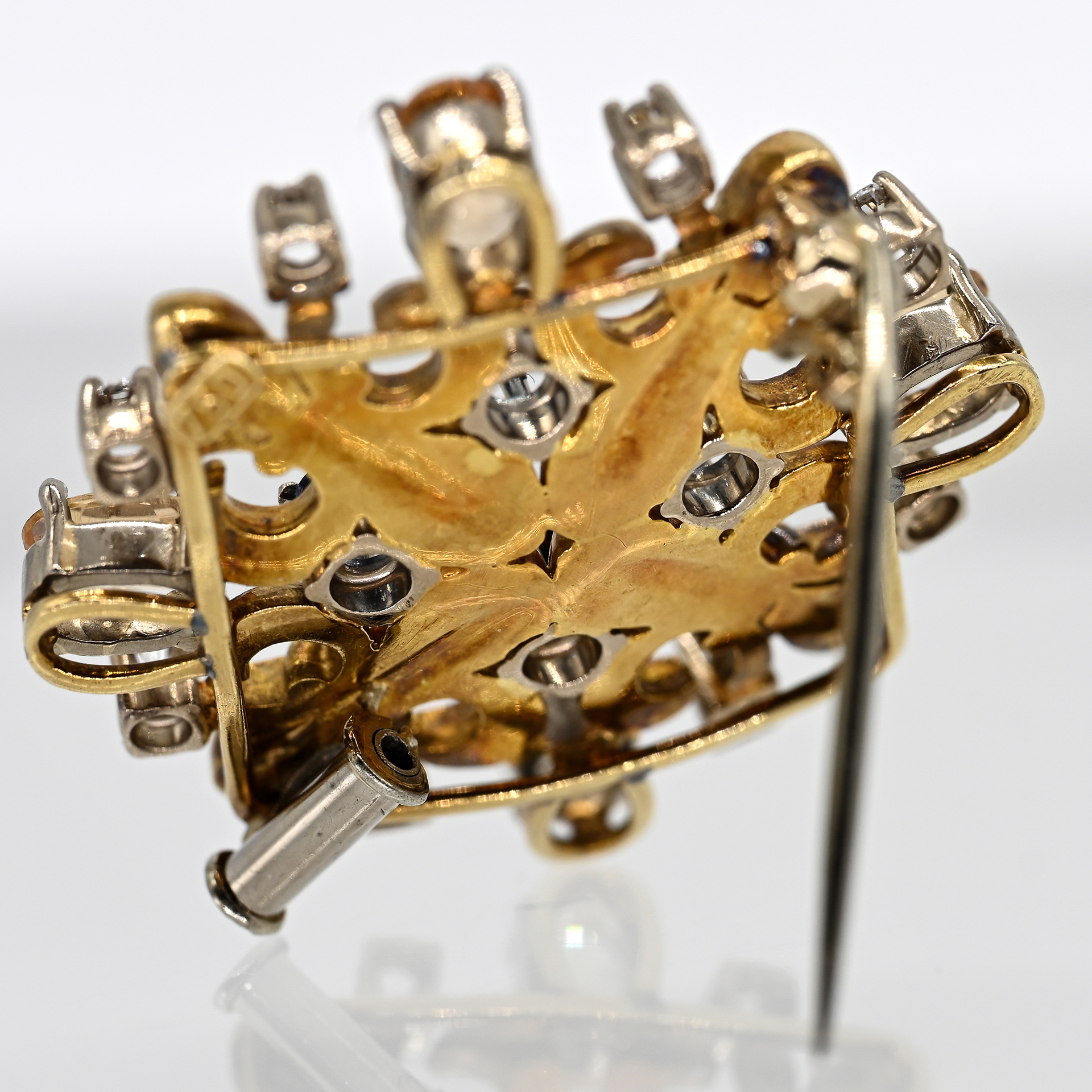 Stamped: 750/- yellow and white gold; total weight: 10.8 g; stylised rectangular base form with fourfold subdivided openwork ornamentation; polished and satin-finished surface decoration; claw settings each with 4 round faceted sapphires in an intense cornflower blue colour variety, diameter: approx. 3.5 mm; 4 oval faceted citrines in a light yellowish/brownish colour variety; dimensions per stone: approx. 6 x 4 mm; 8 brilliant-cut diamonds, total approx. 0.24 ct; colour and clarity: upper range; dimensions of the brooch: approx. 25.9 x 26.5 mm, height: approx. 7.3 mm.