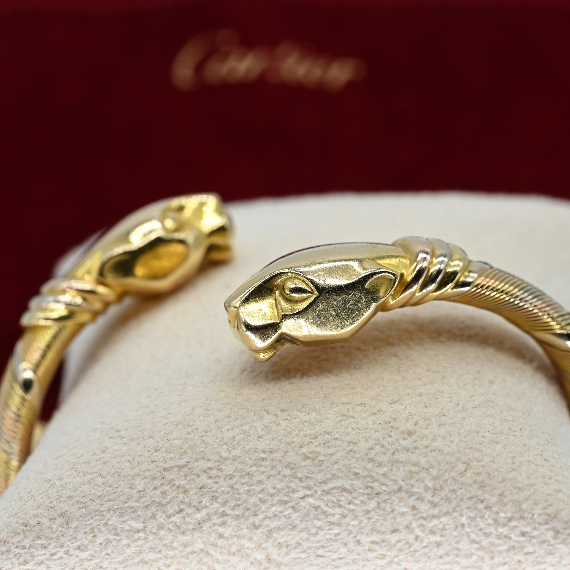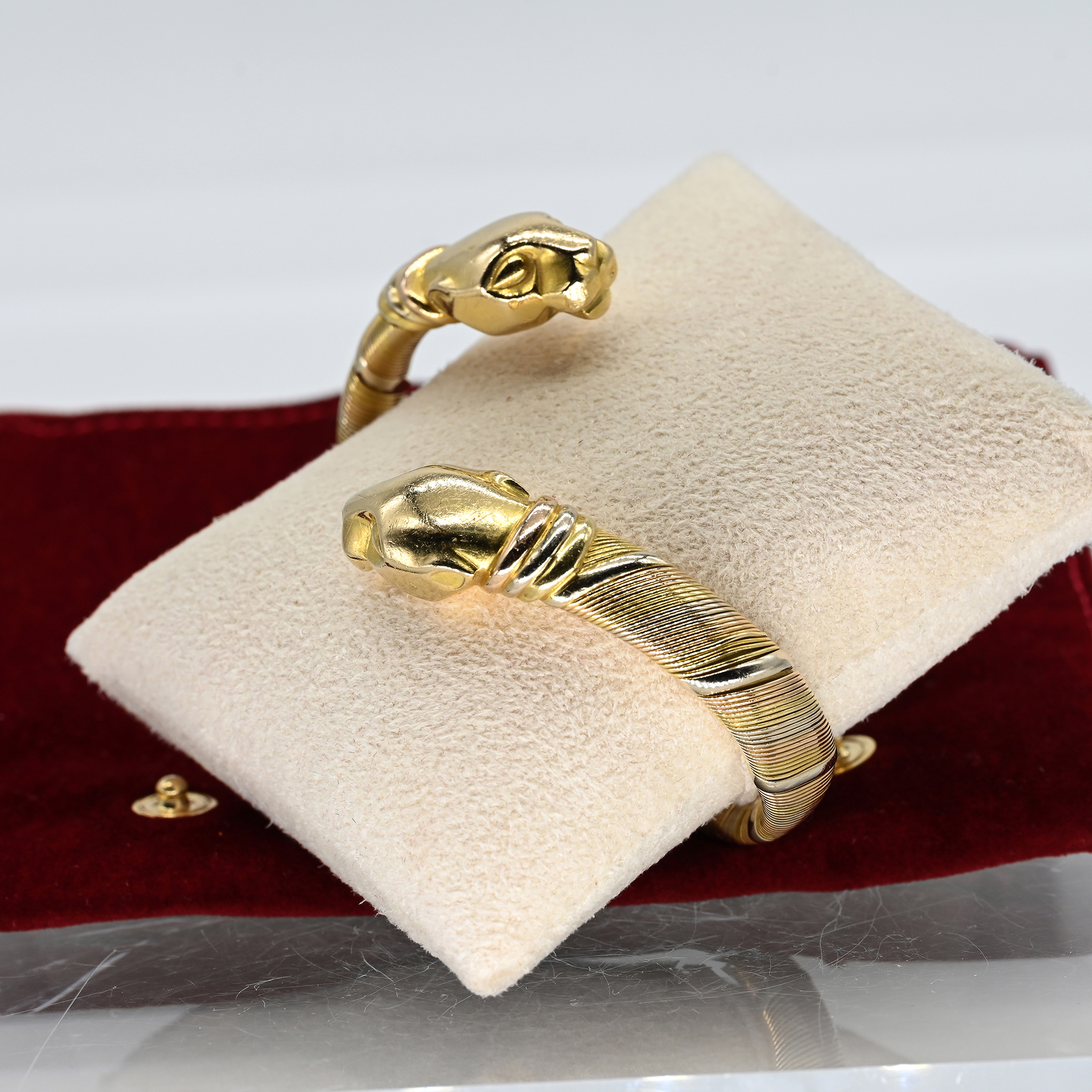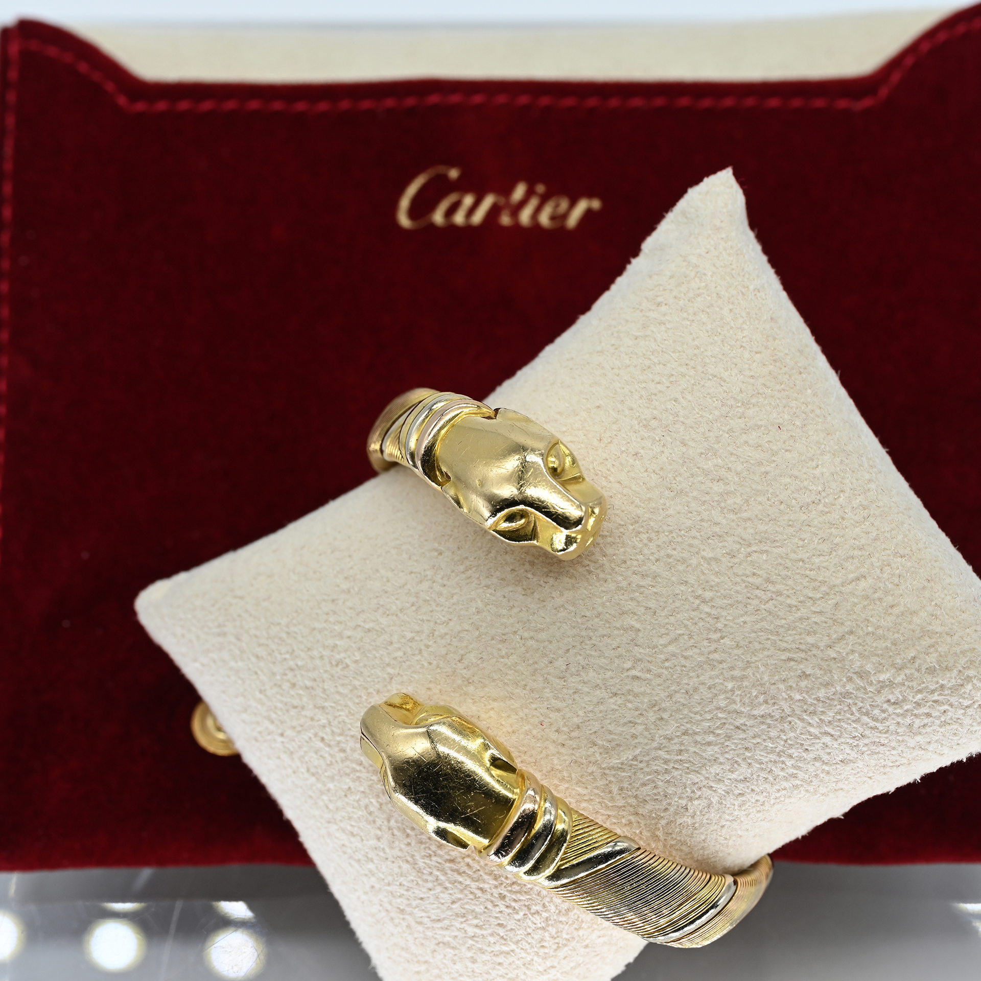 Gestempelt: 750/- Gold in Tricolor; Seriennummer: 704146; offene, leicht diagonal versetzte Armspange; flexibles Band mit feiner und breiter Drahtumwicklung; an den Enden jeweils ein plastischer Pantherkopf in abstrakter Darstellung; Maße: jeweils ca. 27,4 x 12,9 x 10,1 mm; Reifinnenmaß: ca. 6 x 4 cm; an der unteren Seite, in der Stahlfeder gebrochen; keine Papiere oder Box vorhanden, rote Tasche in Wildlederoptik und goldenem Logo von Cartier.