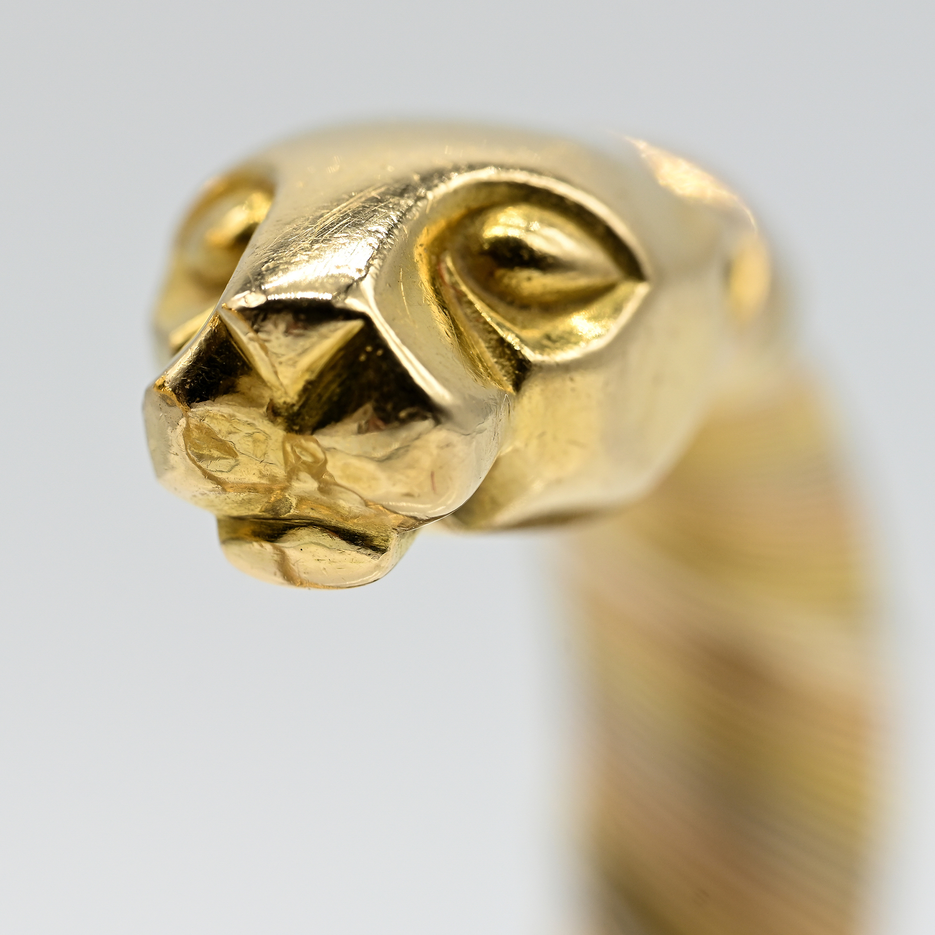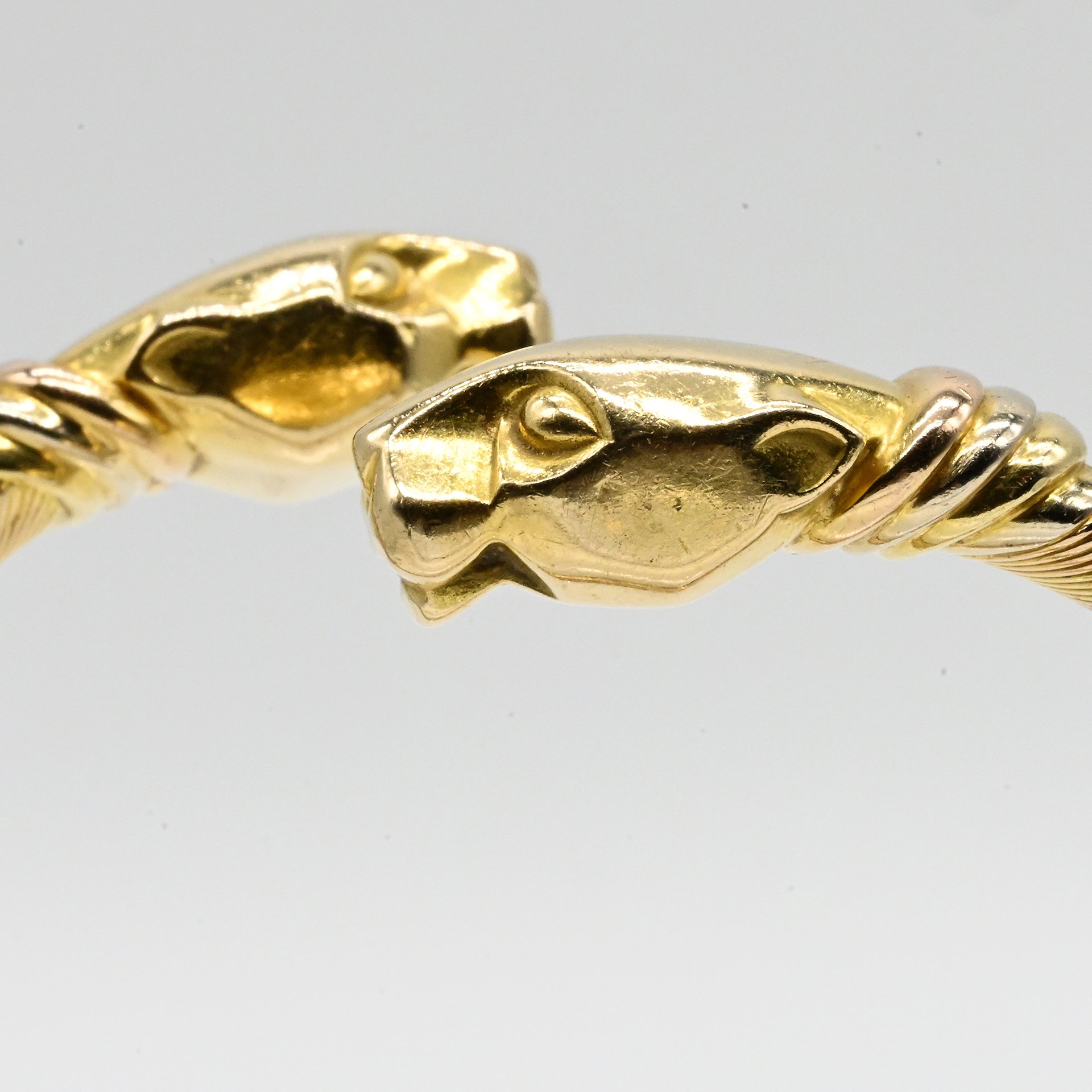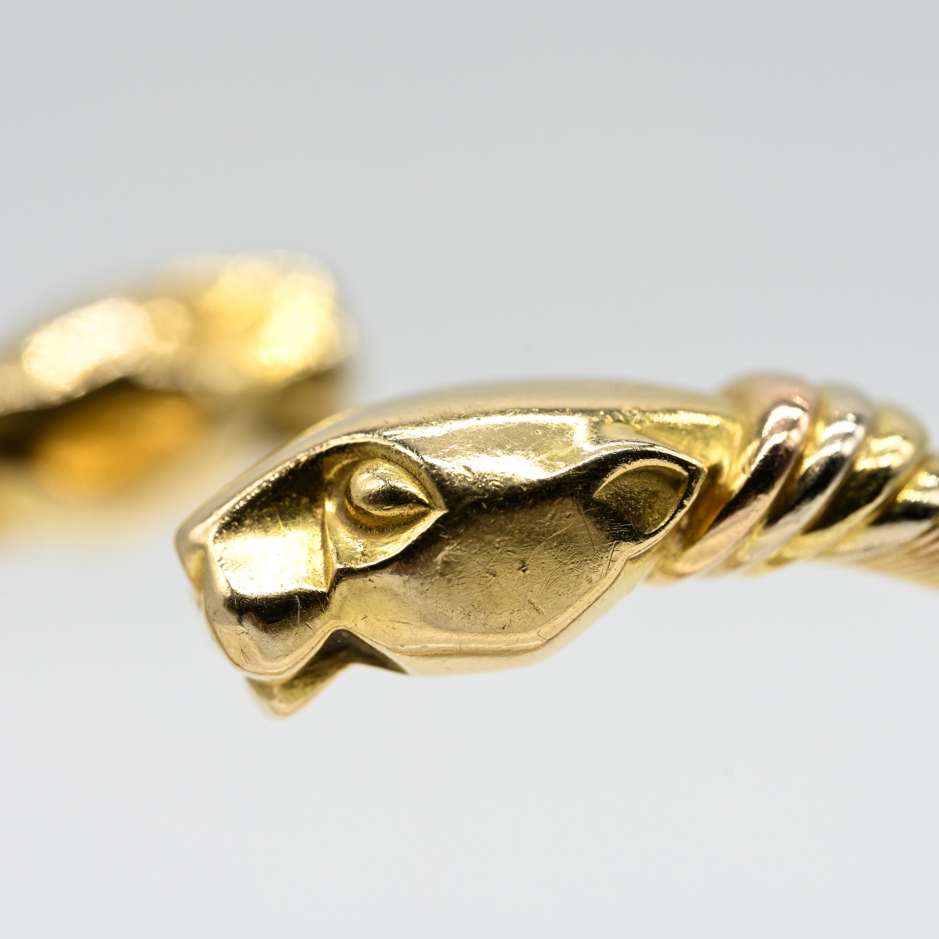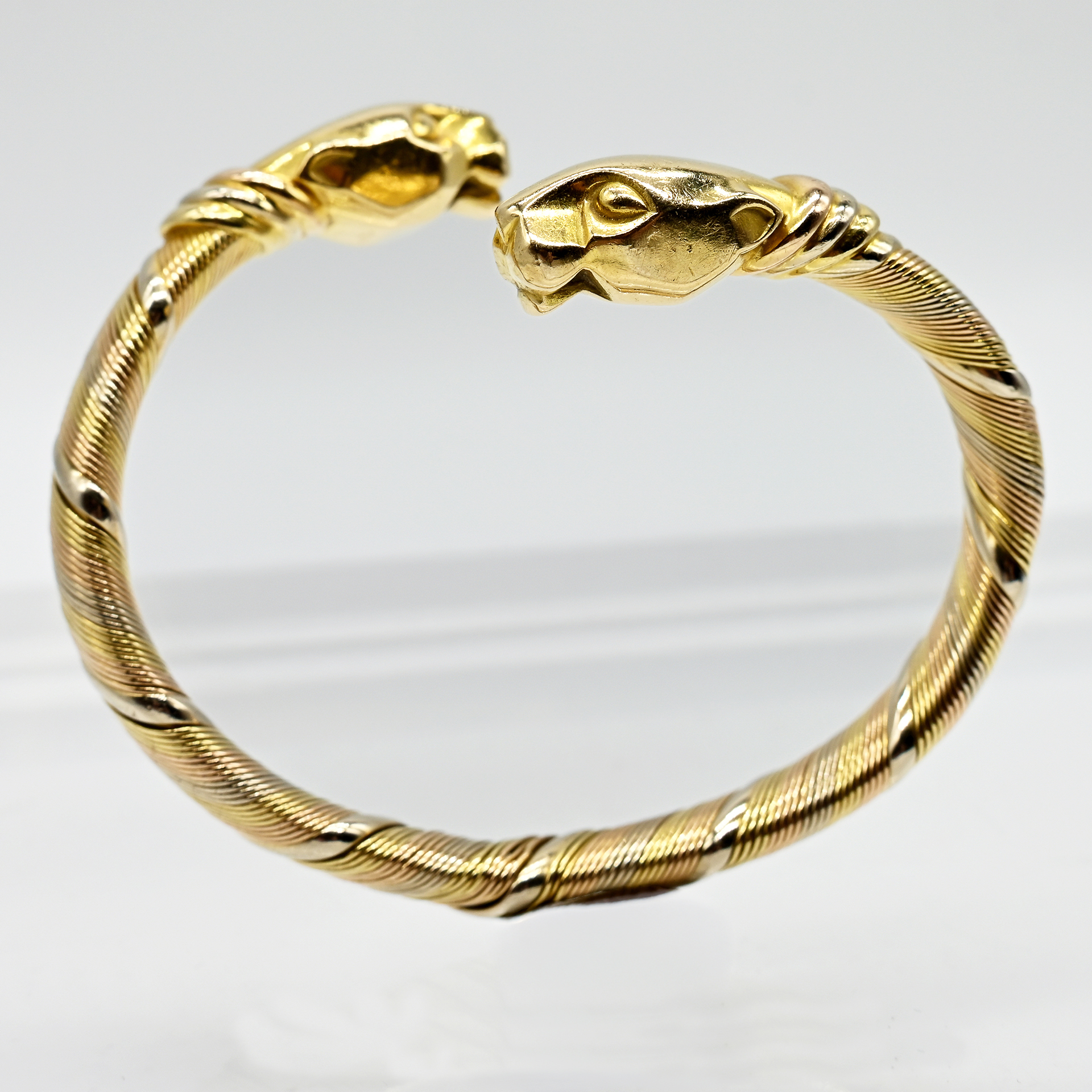 Stamped: 750/- gold in tricolour; serial number: 704146; open bangle, slightly diagonally offset; flexible band with fine and broader wire wrapping; at each end a sculptural abstract panther head; dimensions: each approx. 27.4 x 12.9 x 10.1 mm; inner bangle dimensions: approx. 6 x 4 cm; broken at the lower side in the steel spring; no papers or box present, red suede-look pouch with gold logo of Cartier.
