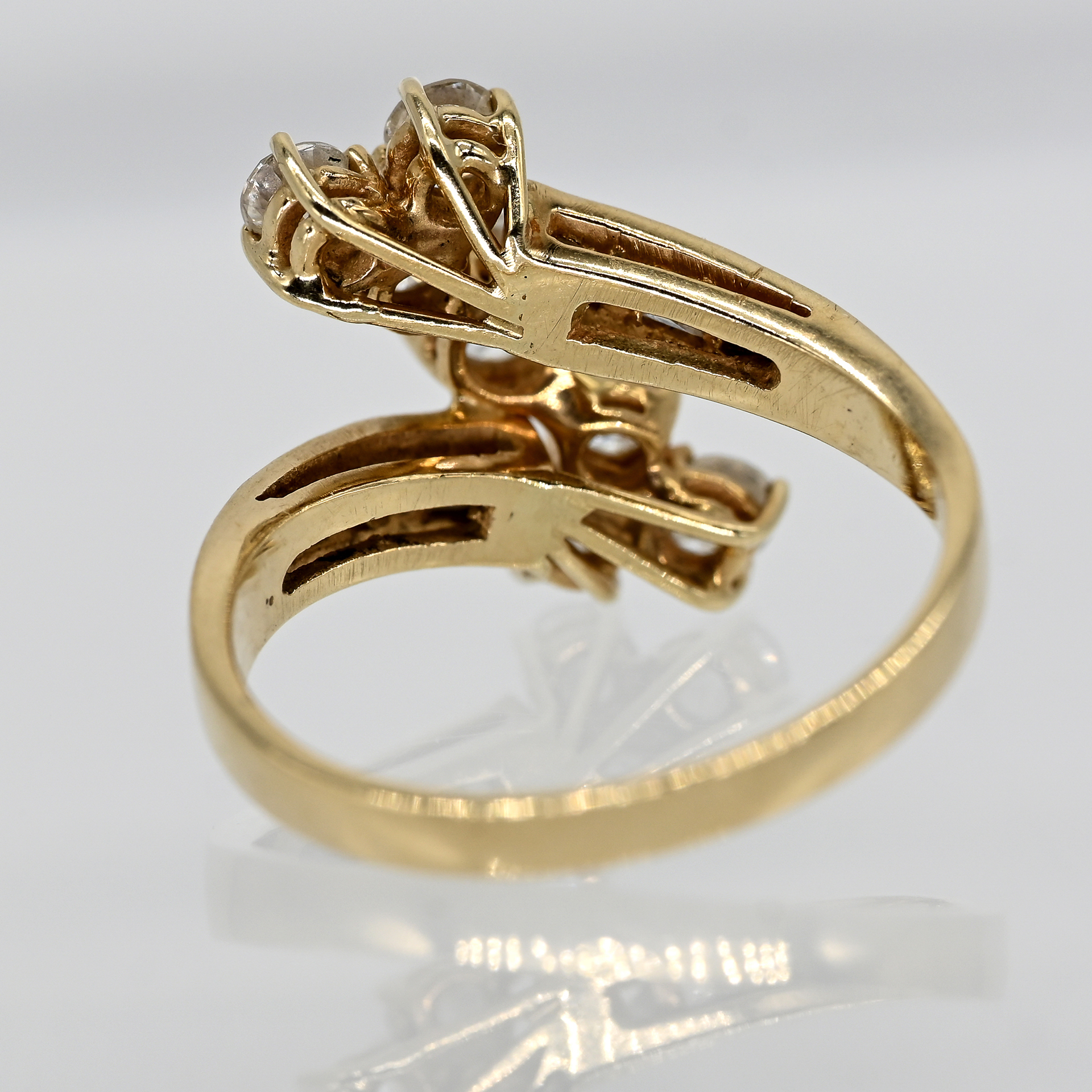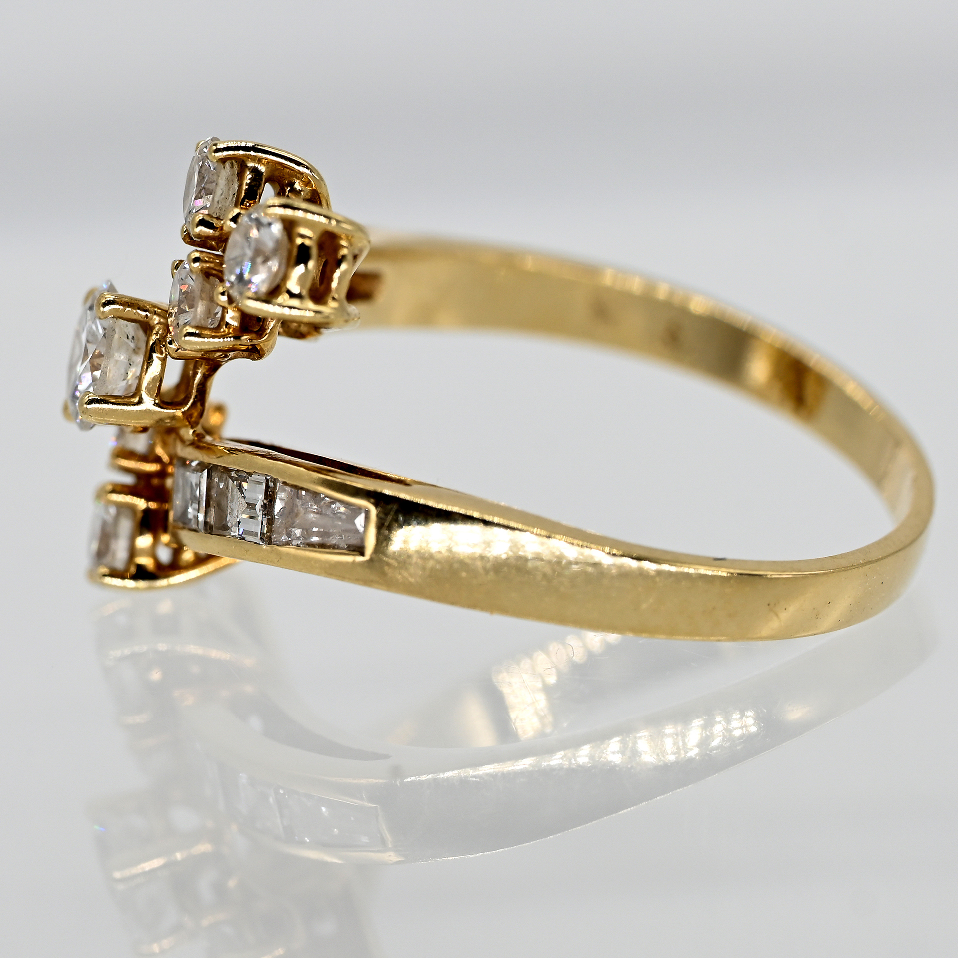 Gestempelt: 585/- Gelbgold; Gesamtgewicht: ca. 3,5 g; stilisierter Crossover-Ringschienenverlauf, dazwischen diagonal 7 versetzt angeordnete Krappenfassungen mit je einem gefassten Brillanten; seitlich auf dem Ringschienenansatz jeweils 3 gefasste Diamantbaguettes, zus. ca. 1 ct; Farbe und Reinheit: im oberen Bereich; Maße der Ringmitte: ca. 17,6 x 14,4 mm; Ringgröße: 53,5.