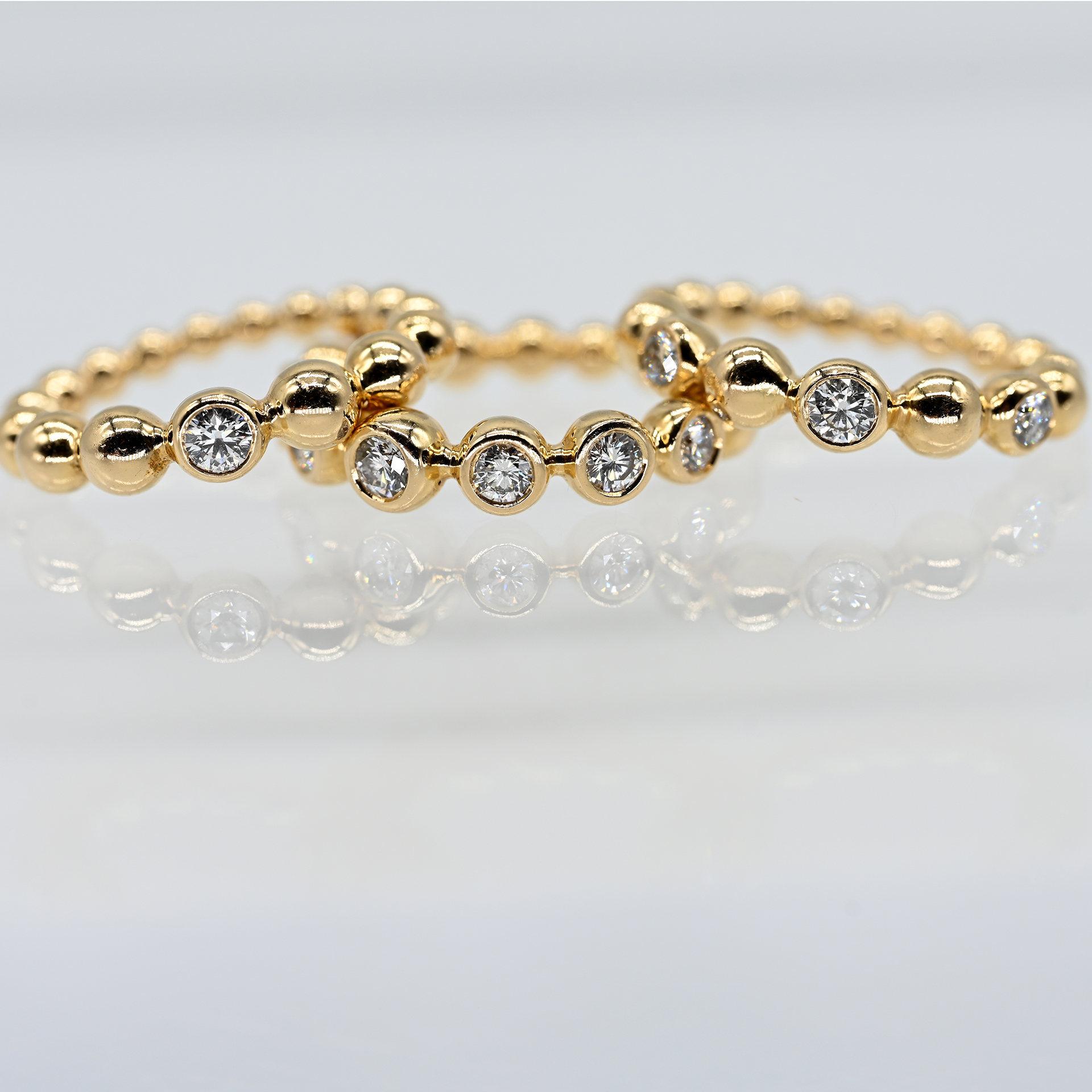 Stamped: 750/- rose gold; total weight: approx. 20.8 g; rows of contiguous spherical elements with lateral flow; each set with a different number of brilliant-cut diamonds: 1) 1 brilliant-cut diamond approx. 0.14 ct; colour: G; clarity: SI; width of the ring centre: approx. 4.5 mm; ring size: 52. 2) 3 brilliant-cut diamonds, total approx. 0.34 ct; colour: G; clarity: SI; width of the ring centre: approx. 4.6 mm; ring size: 52. 3) 7 brilliant-cut diamonds, total approx. 0.68 ct; colour: G; clarity: SI; width of the ring centre: approx. 5 mm; ring size: 52; all details according to invoice: Wempe, Hamburg, dated 27 December 2011.