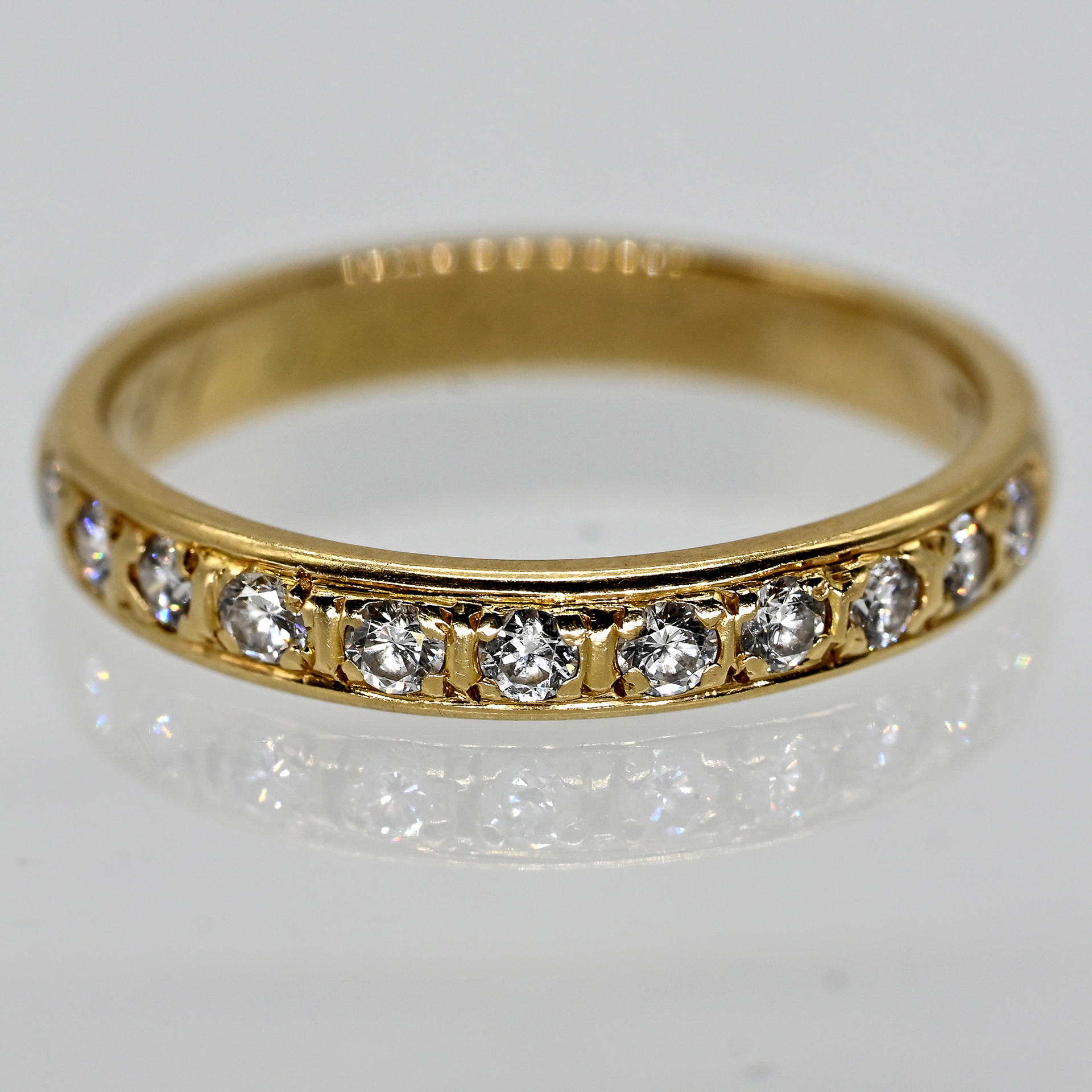 Stamped: 585/- yellow gold; weight: approx. 2.4 g; band ring with half-set row of 11 melee brilliant-cut diamonds, total approx. 0.3 ct; colour and clarity: upper to mid range; inside the ring shank stamped with a partially struck goldsmith’s mark, fineness mark and residual engraving; ring size: 51.5.