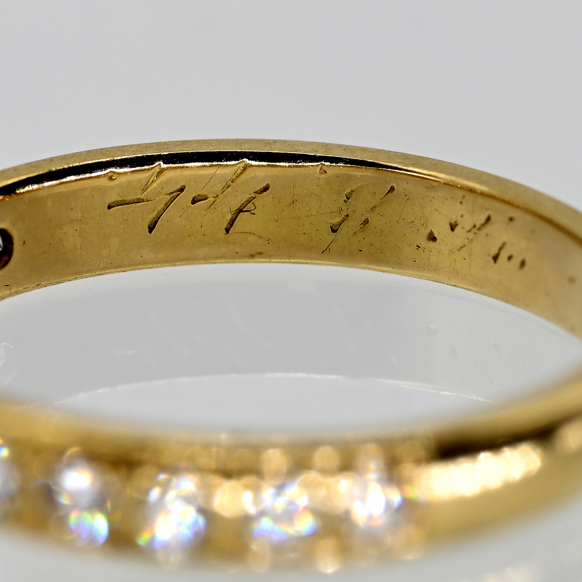 Gestempelt: 585/- Gelbgold; Gewicht: ca. 2,4 g; Bandring mit halbseitigem Besatz von 11 Melée-Brillanten, zusammen ca. 0,3 ct; Farbe und Reinheit: im oberen bis mittleren Bereich; in der Ringschiene gestempelt mit verschlagener Goldschmiedepunze, Feingehaltsstempel und Restgravur; Ringgröße: 51,5.