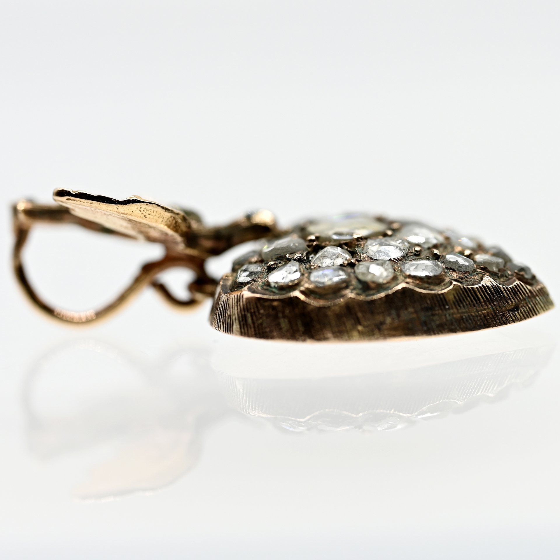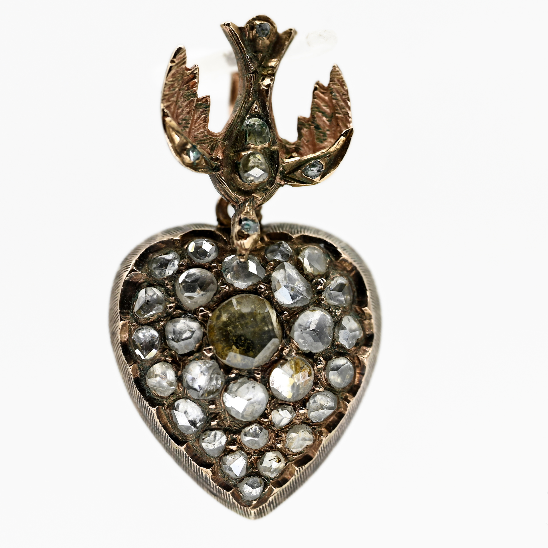 Unmarked: 585/- rose gold with silver backing; total weight: approx. 5.6 g; semi-sculptural heart with a pendant dove and concealed bail on the reverse; the front set with approx. 33 diamonds in various old-cut forms, total approx. 1.5 ct; colour and clarity: lower range; dimensions of the heart: approx. 18.6 x 16.8 mm; height: approx. 5.7 mm; total length: approx. 30.6 mm.