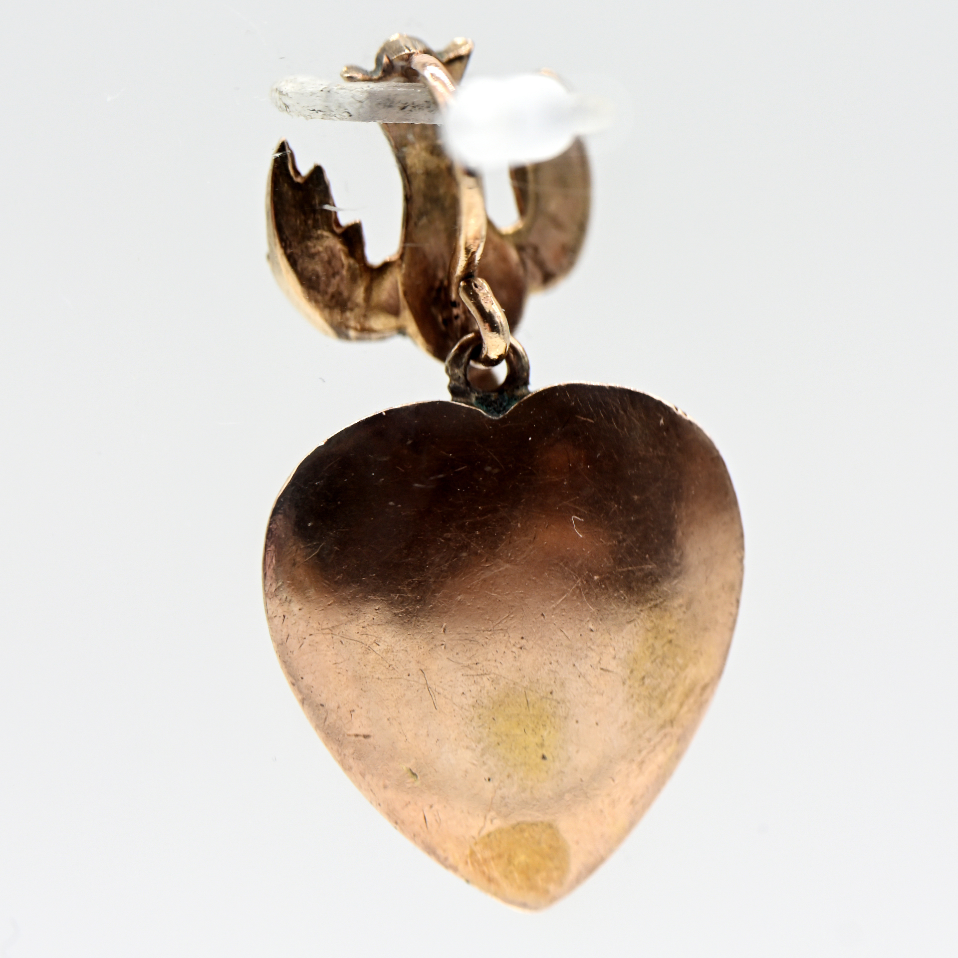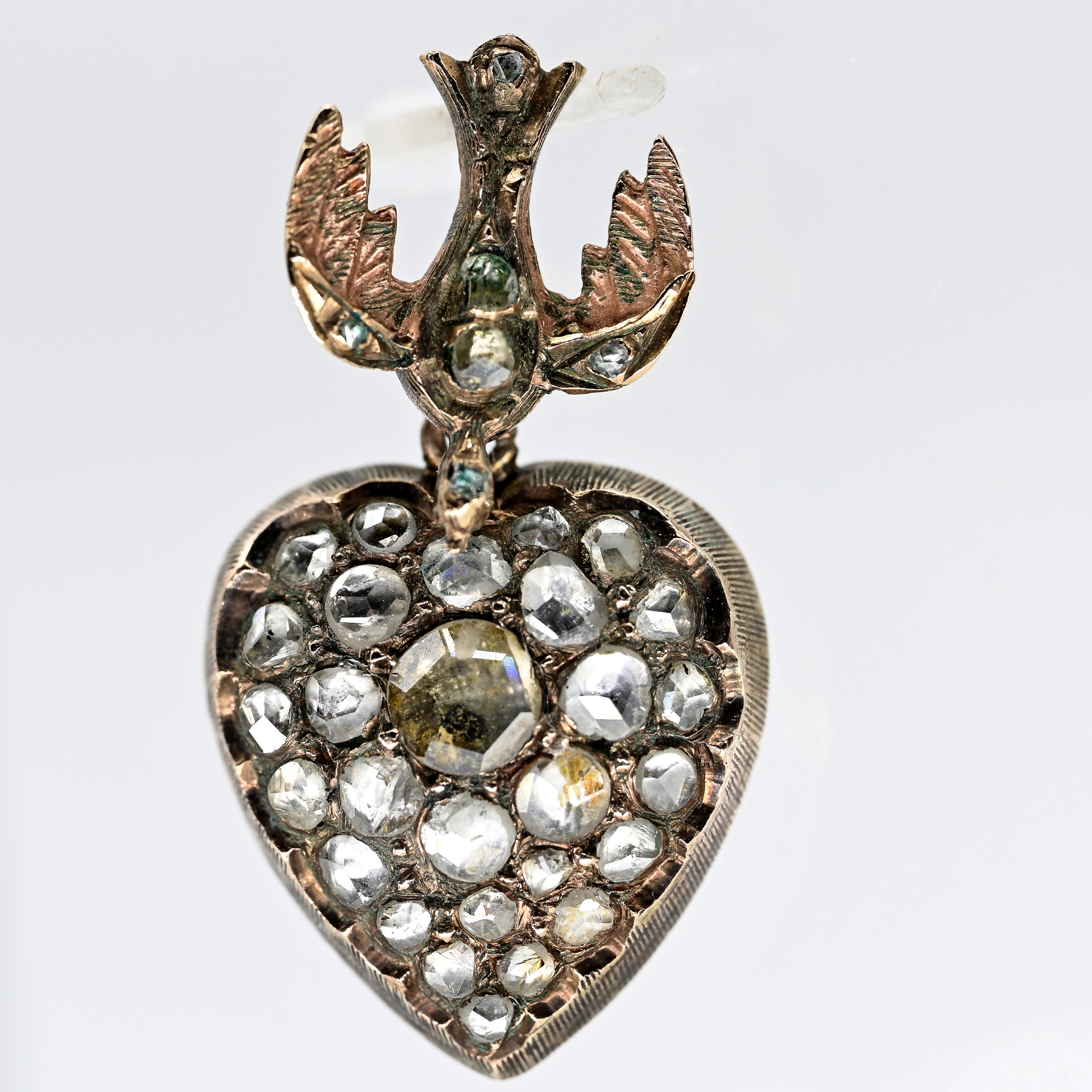 Ungestempelt: 585/- Roségold mit Silber parkettiert; Gesamtgewicht: ca. 5,6 g; halbplastisches Herz und anhängende Taube mit rückseitig verdeckter Öse; auf der Schauseite mit ca. 33 Diamanten ausgefasst, in verschiedenen Altschliffformen, zus. ca. 1,5 ct; Farbe und Reinheit: im unteren Bereich; Maße des Herzens: ca. 18,6 x 16,8 mm; Höhe: ca. 5,7 mm; Gesamtlänge: ca. 30,6 mm.