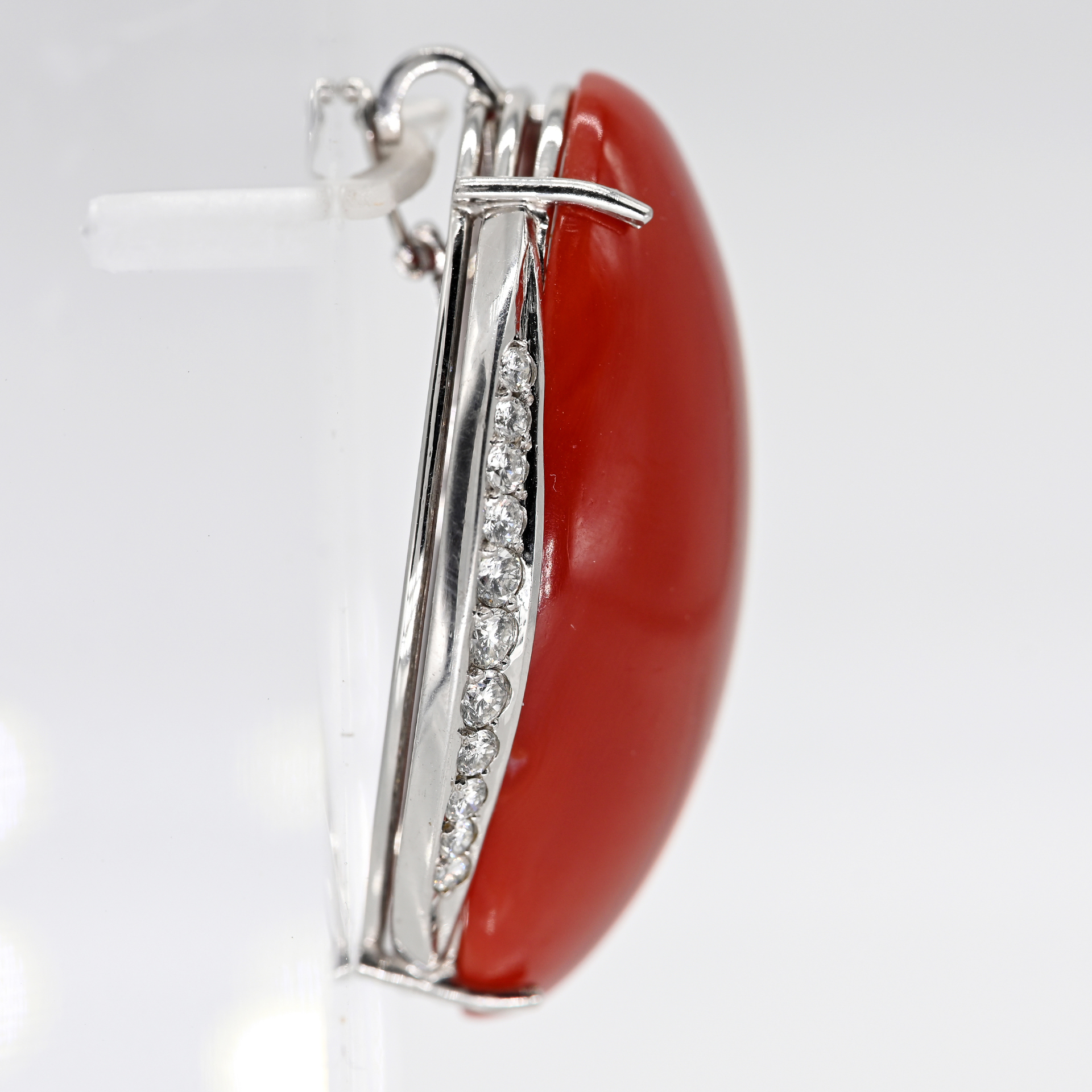 Stamped: 750/- white gold; total weight: 18.2 g; high oval setting; coral cabochon set with 4 claws; deep red colour variety with faintly visible natural structure; longitudinally applied curved elements set with 11 brilliant-cut diamonds on each side in pavé setting; total approx. 0.5 ct; colour and clarity: upper range; concealed rear bail with safety catch; pendant dimensions: approx. 37.8 x 29.5 mm, height: approx. 12.7 mm.