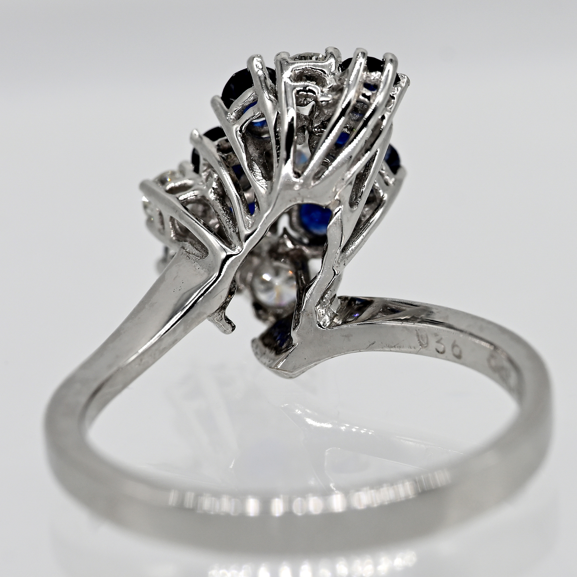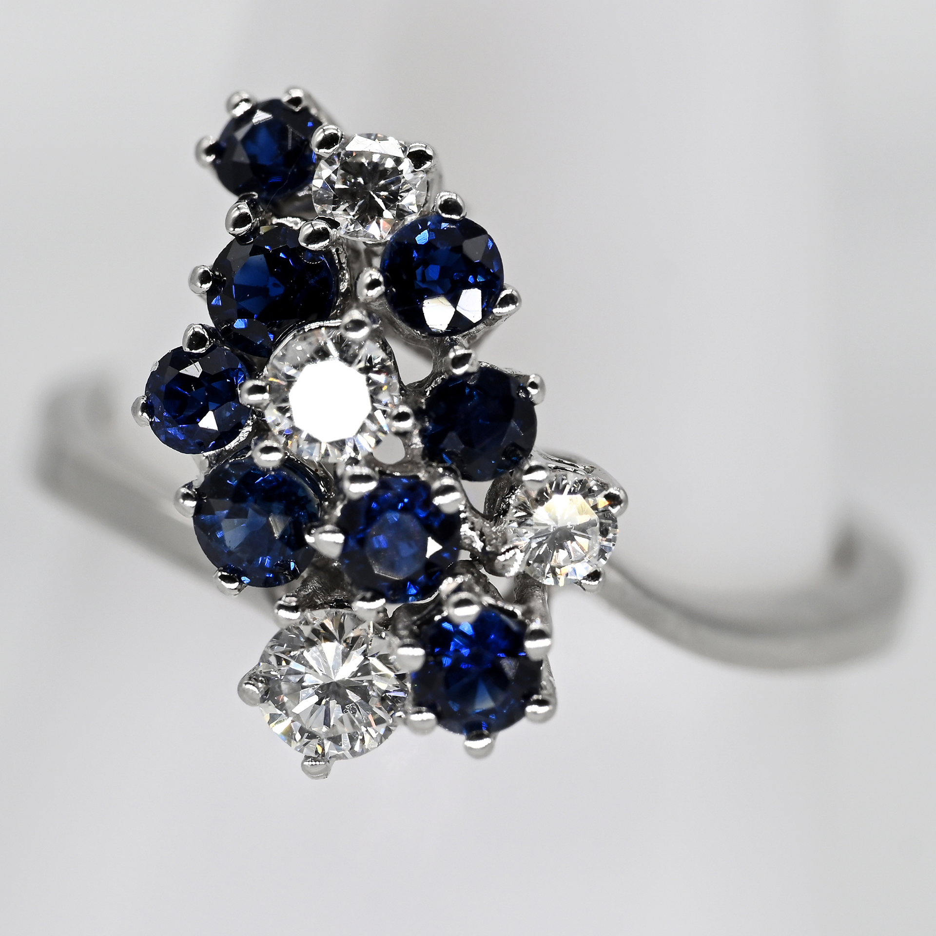 Gestempelt: 585/- Weißgold; Gesamtgewicht: ca. 4,4 g; getreppt angeordnete Krappenfassungen in amorpher Anordnung; ausgefasst mit 8 runden, facettierten Saphiren, zus. ca. 0,48 ct (lt. Gravur); intensive blaue Farbvarietät; 4 Brillanten, zus. ca. 0,36 ct (lt. Gravur); Farbe: F-G und Reinheit: VS; Maße der Ringmitte: ca. 14,5 x 11 mm; Höhe: ca. 9,4 mm; Ringgröße: 55.