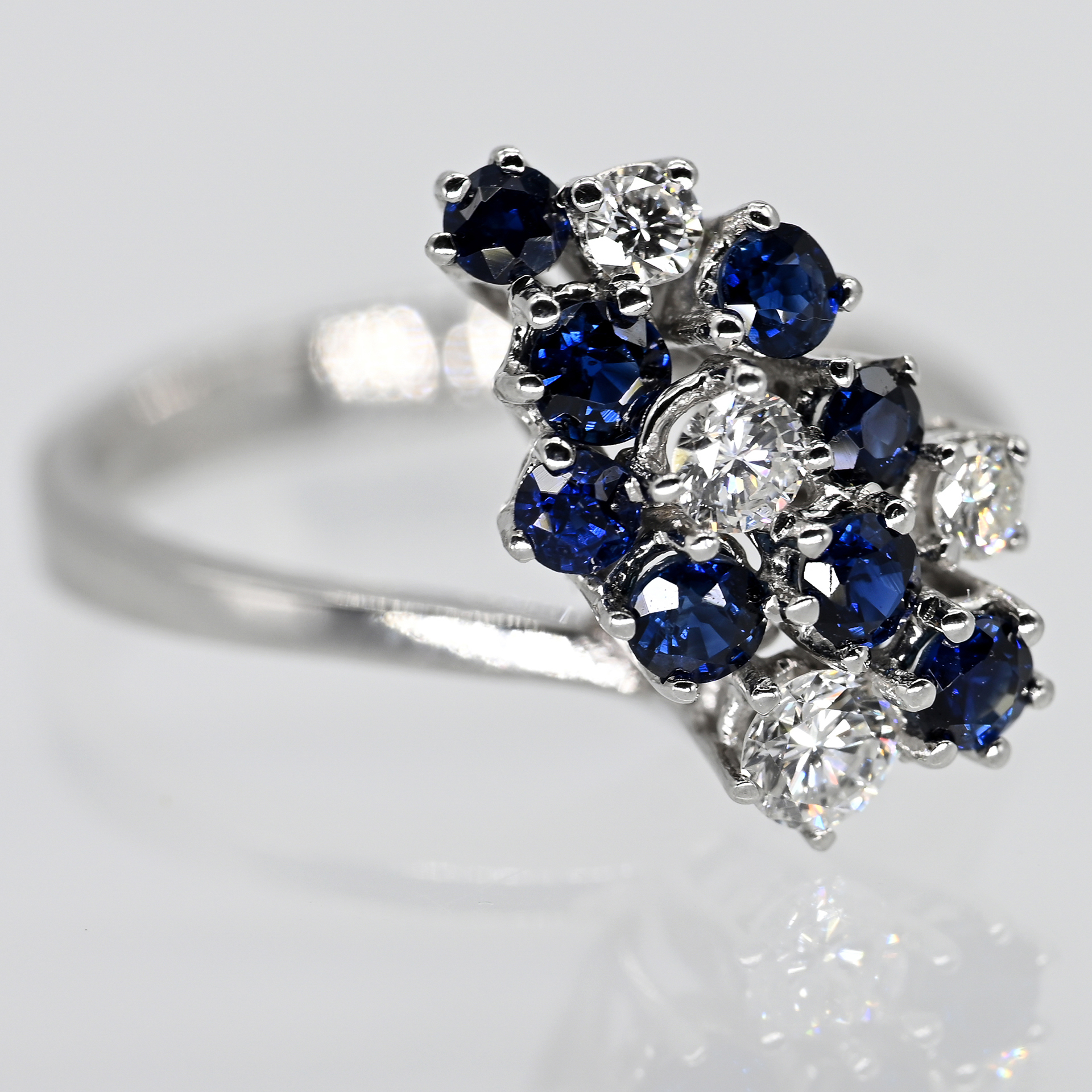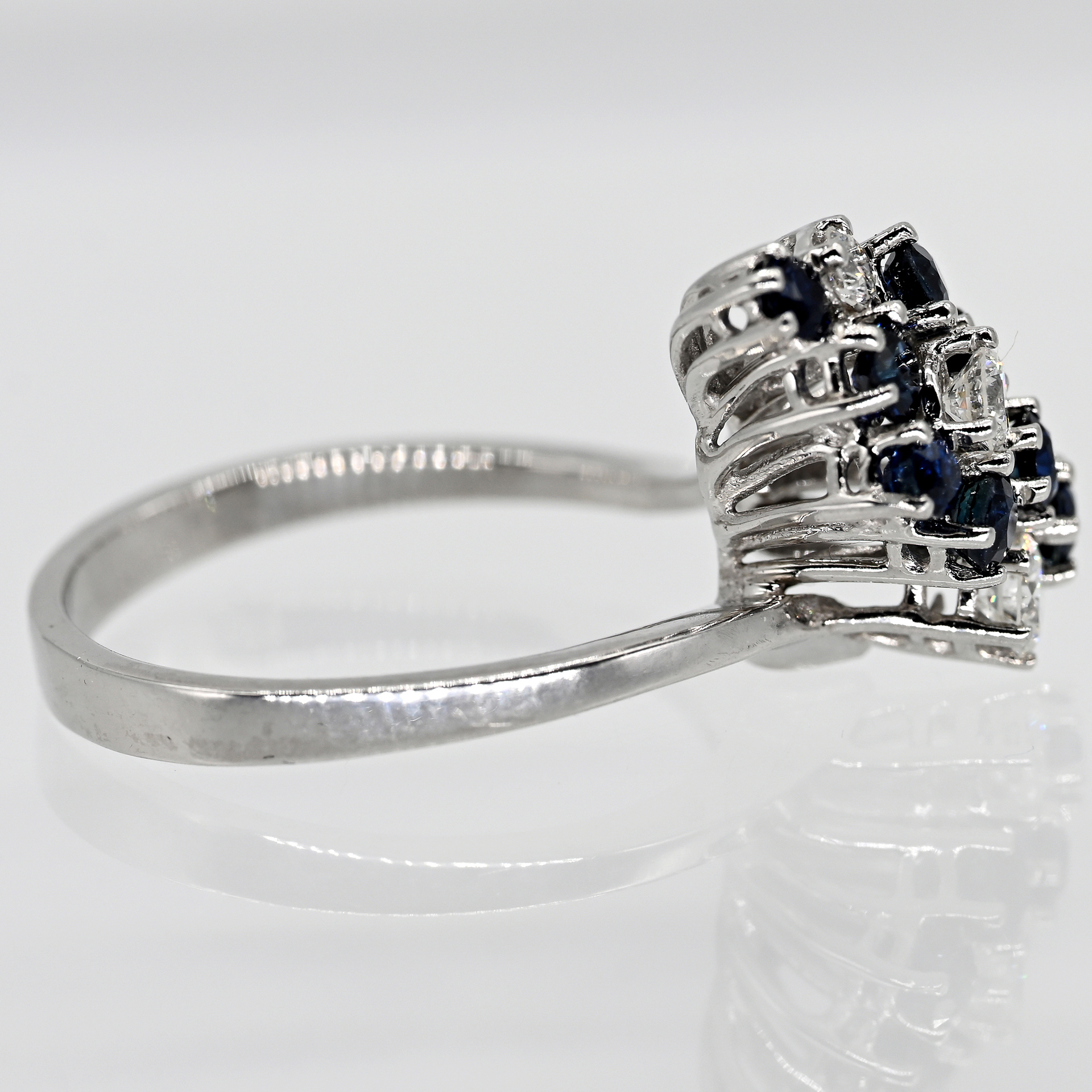 Stamped: 585/- white gold; total weight: approx. 4.4 g; stepped claw settings in an amorphous arrangement; set with 8 round faceted sapphires, total approx. 0.48 ct (according to engraving); intense blue colour variety; 4 brilliant-cut diamonds, total approx. 0.36 ct (according to engraving); colour: F-G and clarity: VS; dimensions of the ring centre: approx. 14.5 x 11 mm; height: approx. 9.4 mm; ring size: 55.
