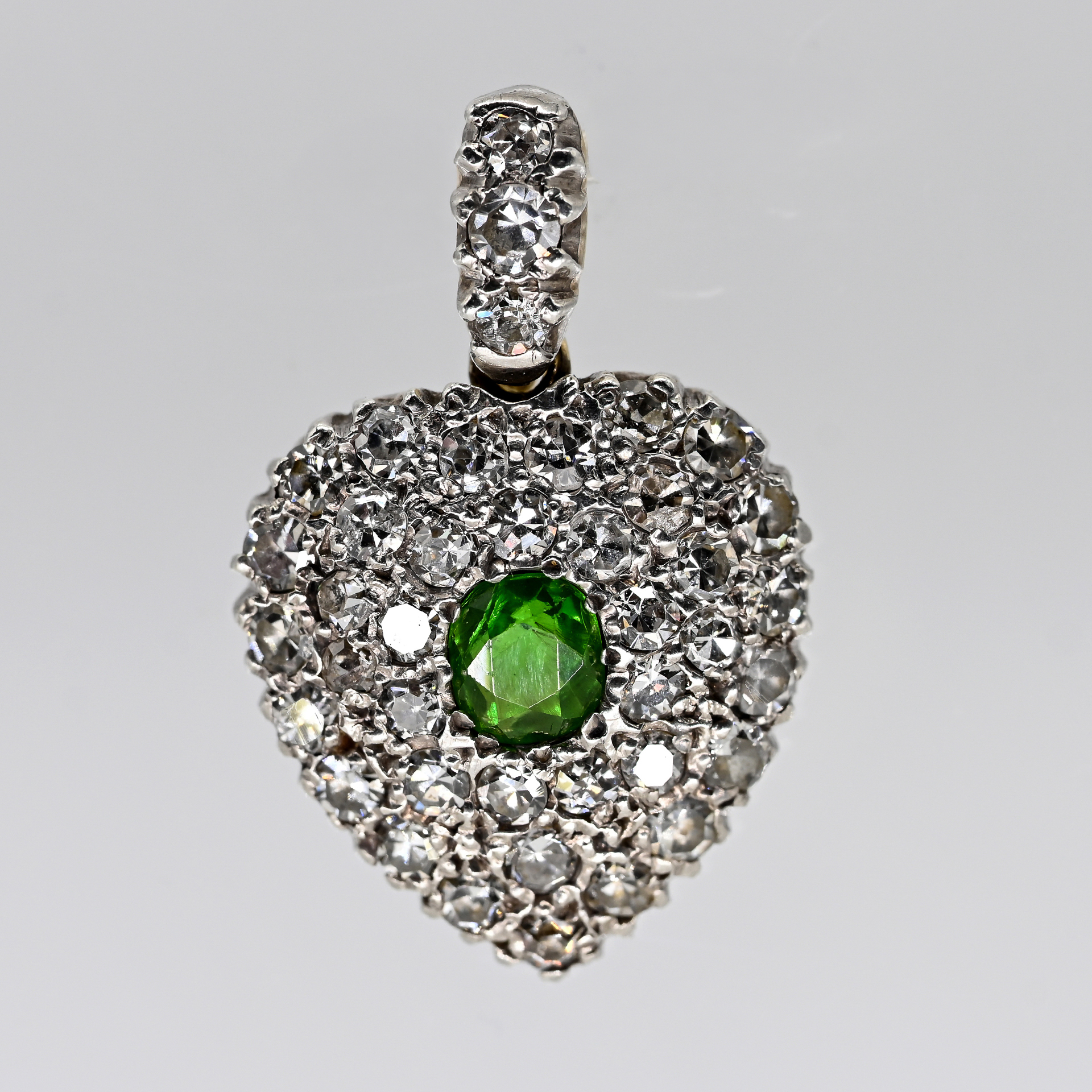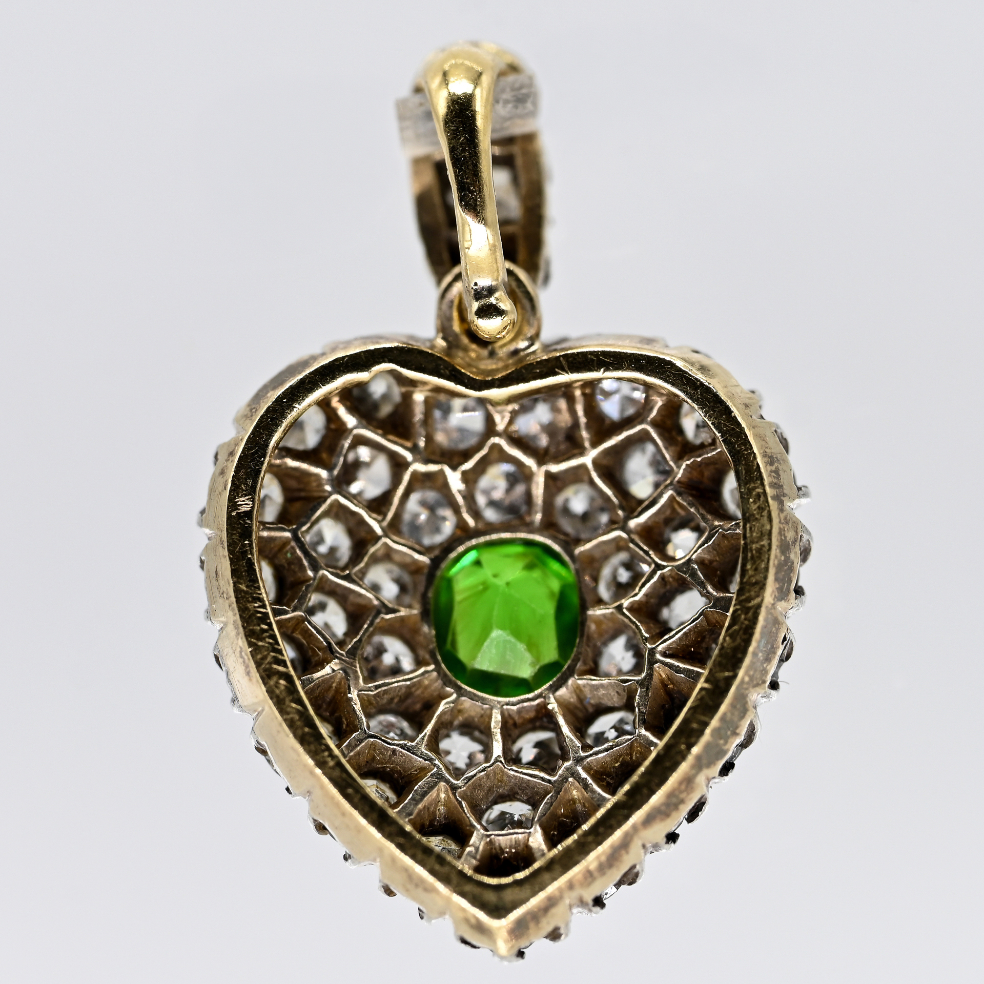 Unmarked: 585/- yellow gold and silver-backed; classic, slightly raised heart form with triangular bail; centrally set green faceted coloured stone; surrounded by approx. 40 small diamonds in transitional cut, total approx. 1.2 ct; colour: upper range; clarity: upper to mid range; dimensions: length incl. bail approx. 22.6 mm; heart: approx. 15.6 x 14.6 mm; height: approx. 4.8 mm.
