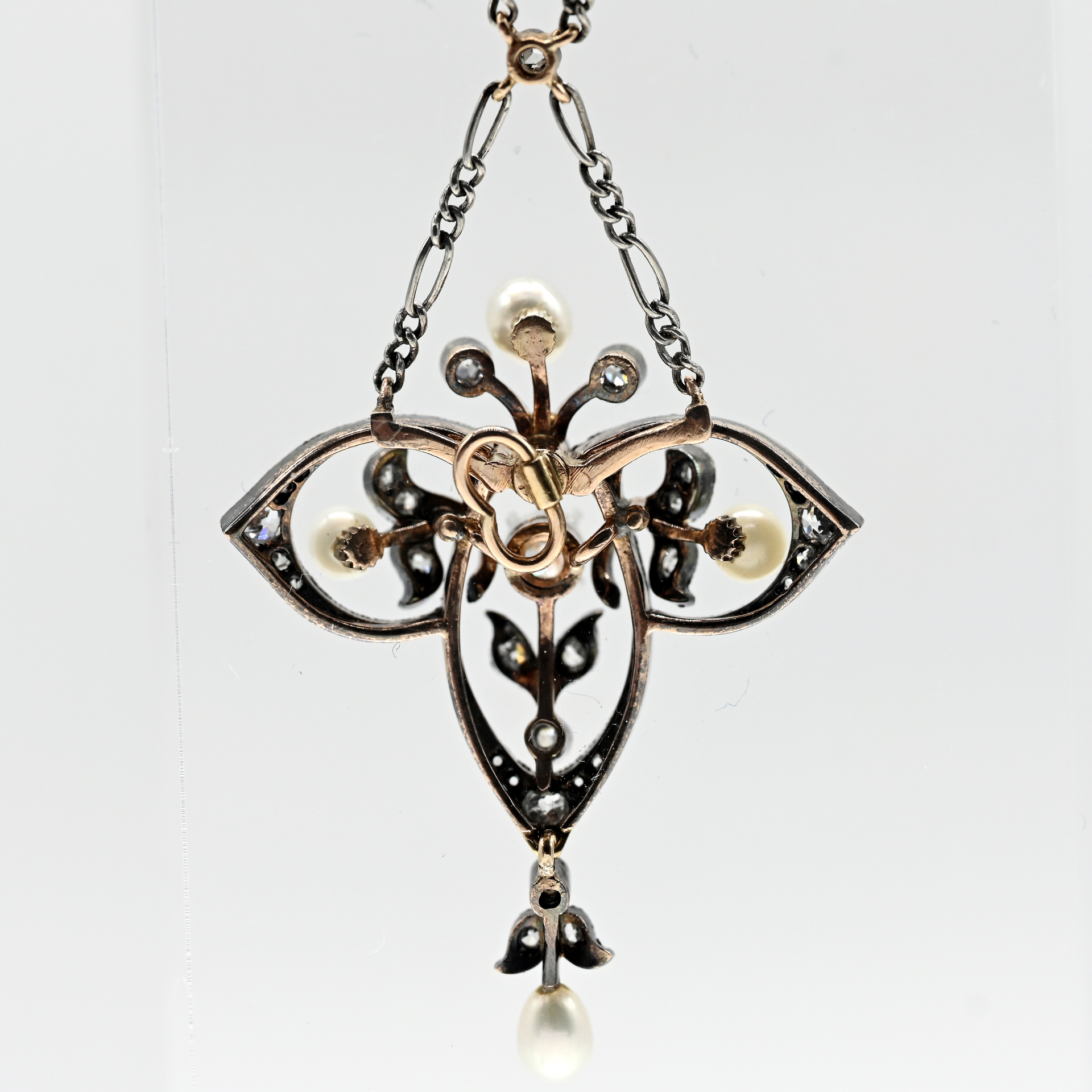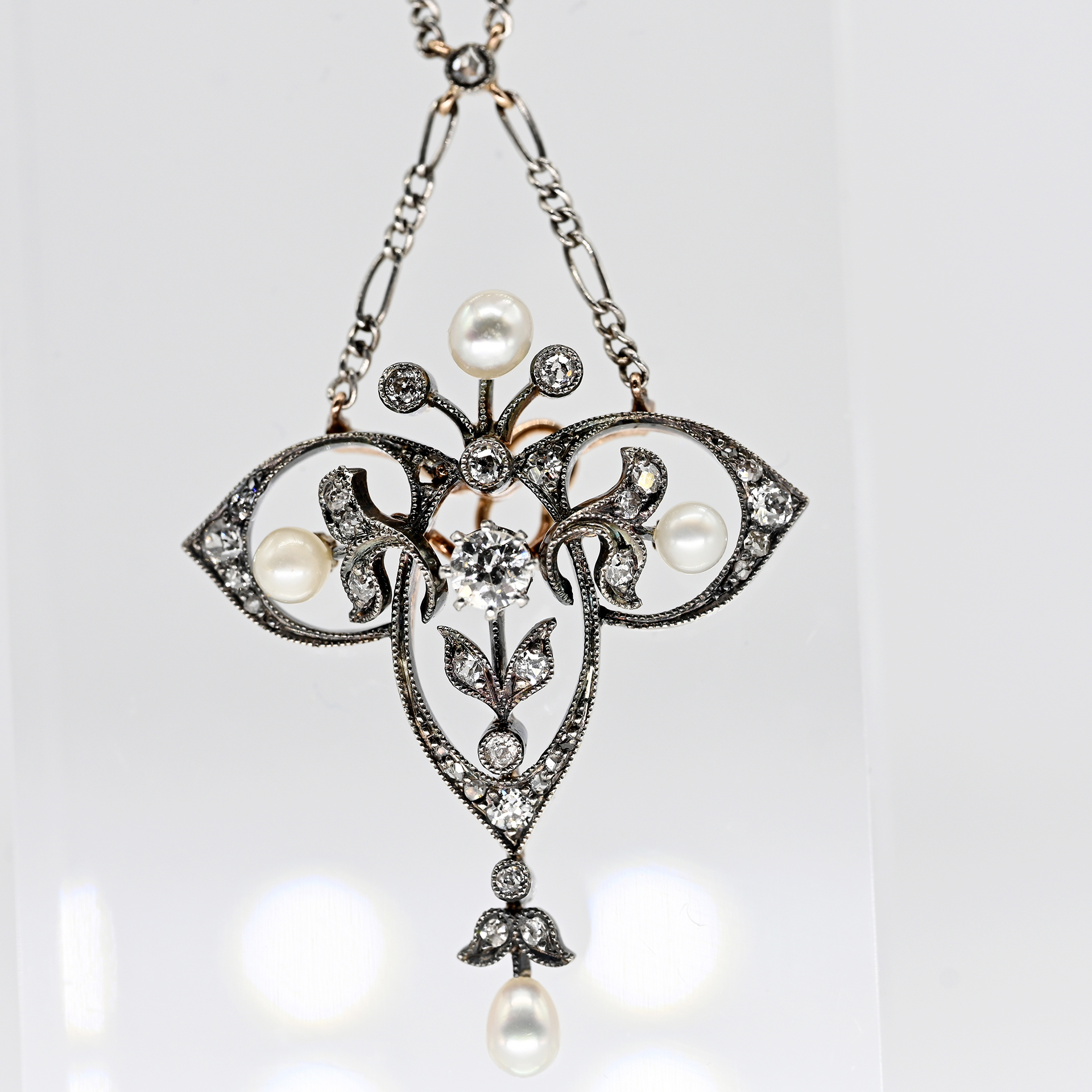 Ungestempelt: 585/- Gelb- und Weißgold; Gesamtgewicht: ca. 9,2 g; typische, dreipassige, durchbrochene Art Déco Form; konturiert und akzentuiert mit 36 Altschliff-Diamanten, zus. ca. 0,8(3) ct; detaillierte Angaben: Mittelstein ca. 0,2(3) ct; Farbe: H-I; Reinheit: SI 2 - Piqué 1; 35 Diamanten, zus. ca. 0,6 ct; Farbe und Reinheit: mittlerer Bereich; 4 kleine Naturperlen in unterschiedlichen Farbnuancen und Lüster; feine Ankerkette mit Kastenschloss und seitlicher Sicherheitsacht; Maße des Anhängers: ca. 37,2 x 28,8 mm; Colliergesamtlänge: ca. 39 cm.