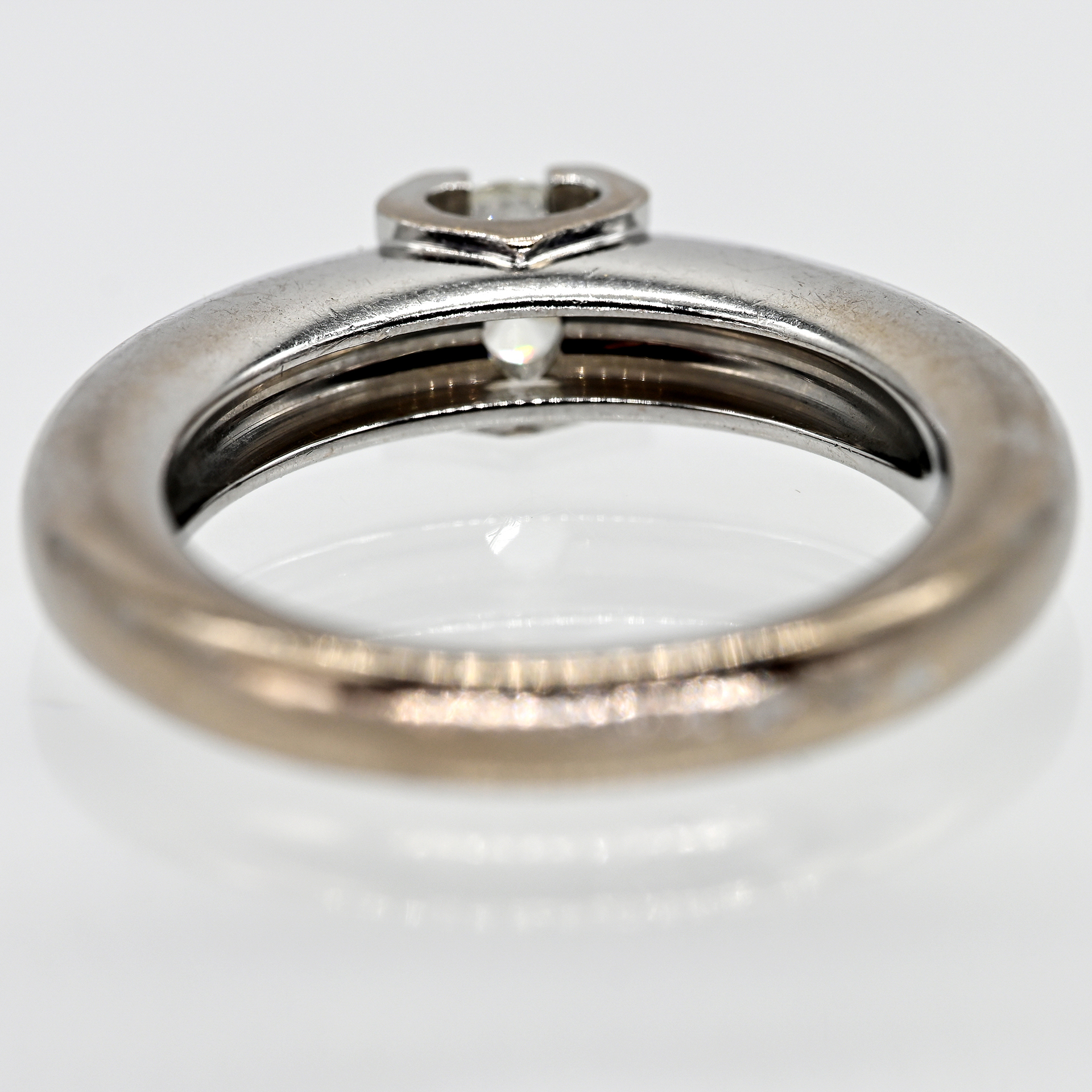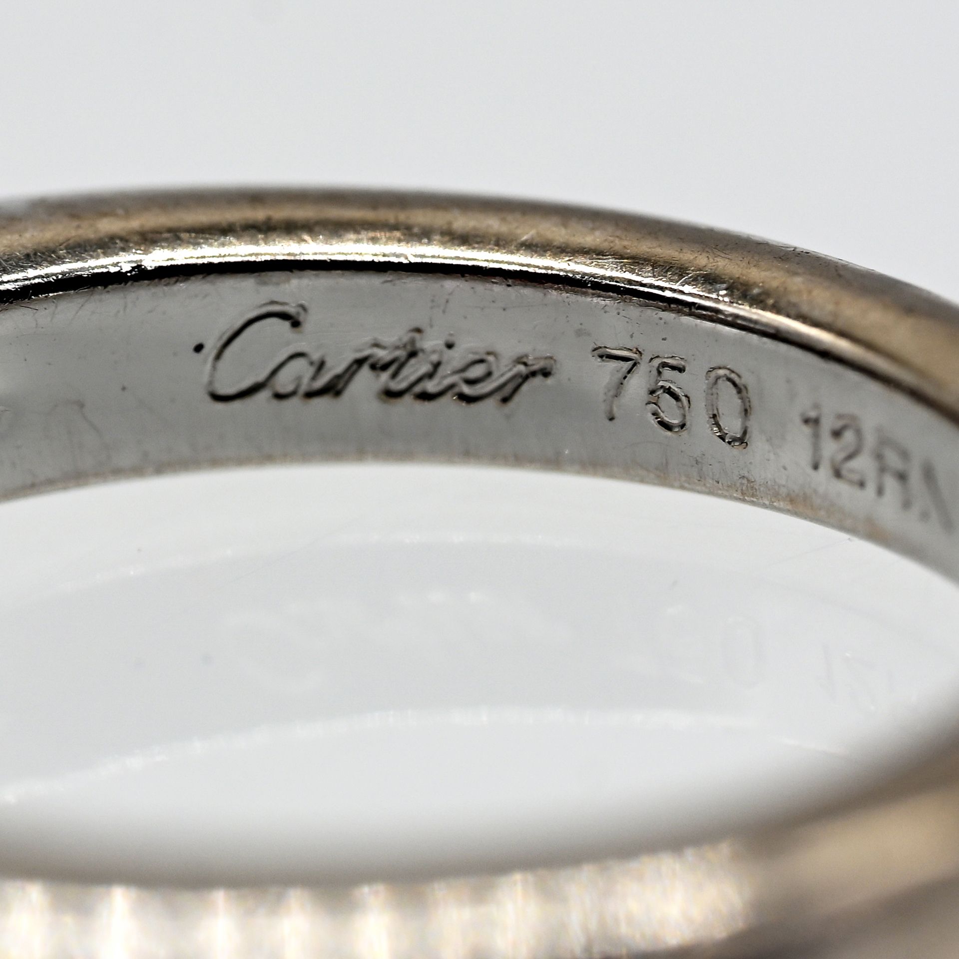 Stamped: 750/- white gold; Cartier 12RN040 1998; total weight: approx. 9 g; stylised solid band ring form with four-claw setting; side view showing the characteristic reclining C-shape in Cartier style; set brilliant-cut diamond approx. 0.36 ct; colour: G-H; clarity: VVS-VS; dimensions of the ring centre: approx. 5 x 5.7 mm; height: approx. 5.4 mm; ring size: 53; ring shank and setting with visible signs of wear.