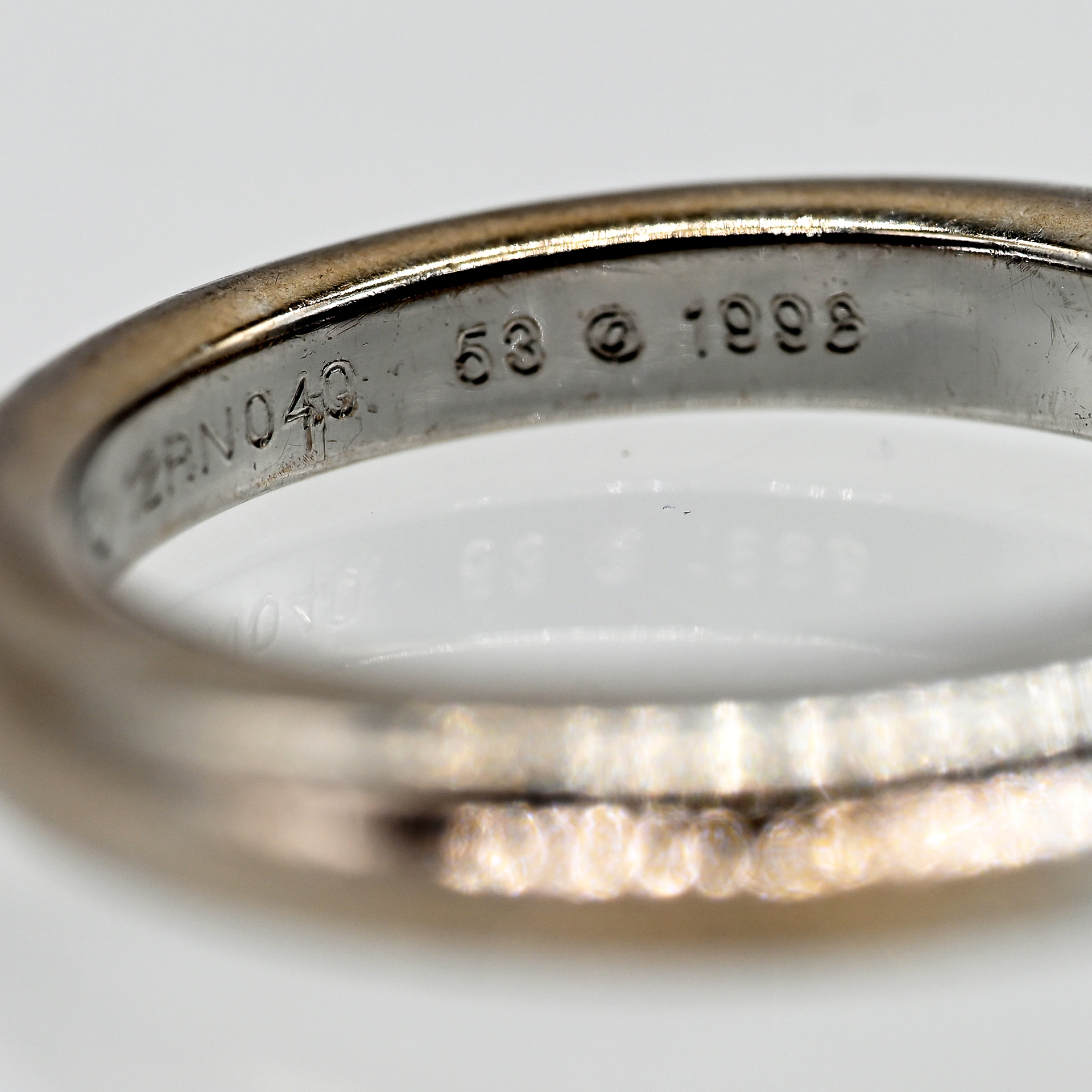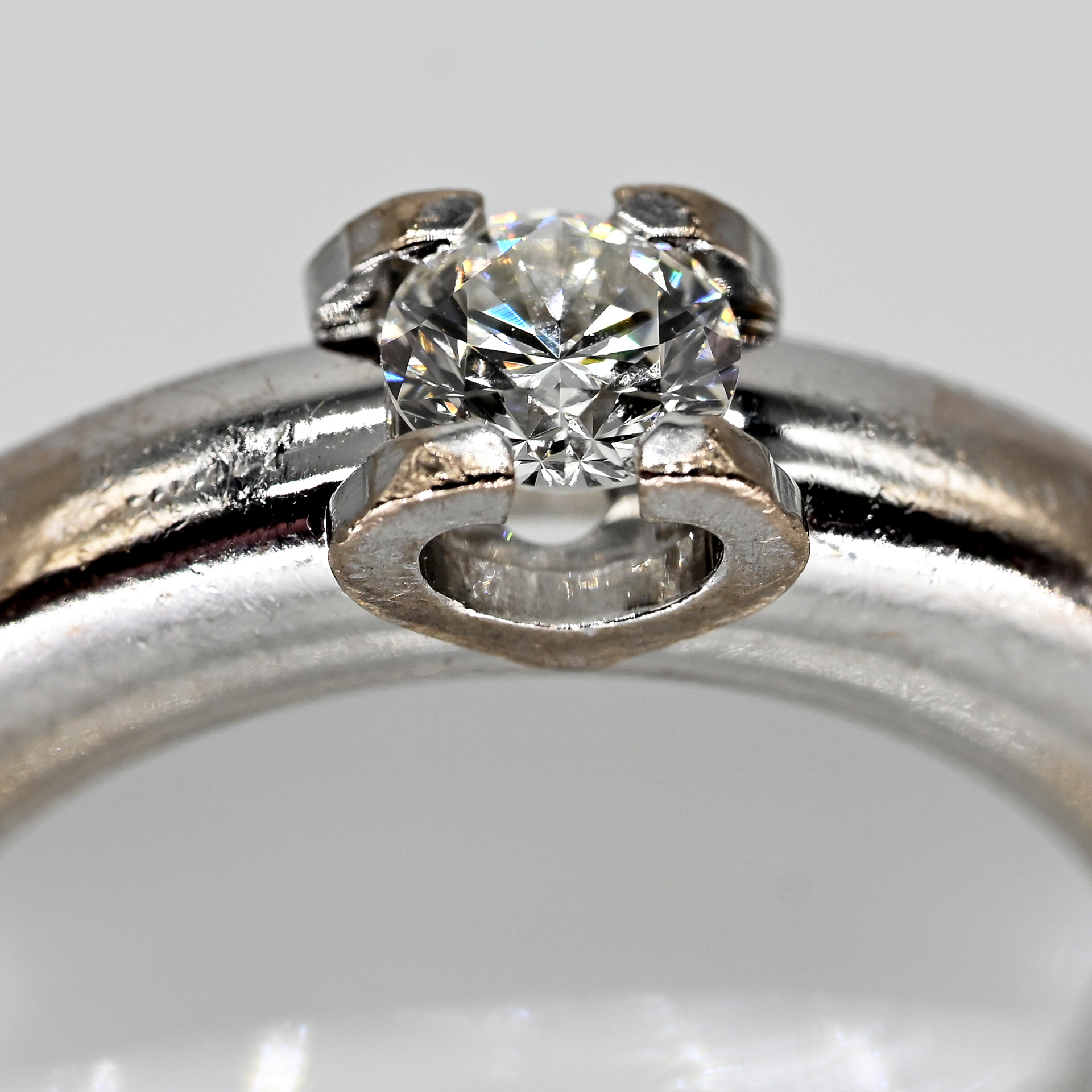 Gestempelt: 750/- Weißgold; Cartier 12RN040 1998; Gesamtgewicht: ca. 9 g; stilisierte, massive Bandringform und vierfache Krappenfassung; in der Seitenansicht liegende C-Form in der Cartier-Optik; gefasster Brillant ca. 0,36 ct; Farbe: G-H; Reinheit: VVS-VS; Maße der Ringmitte: ca. 5 x 5,7 mm; Höhe: ca. 5,4 mm; Ringgröße: 53; Ringschiene und Fassung mit sichtbaren Tragespuren.