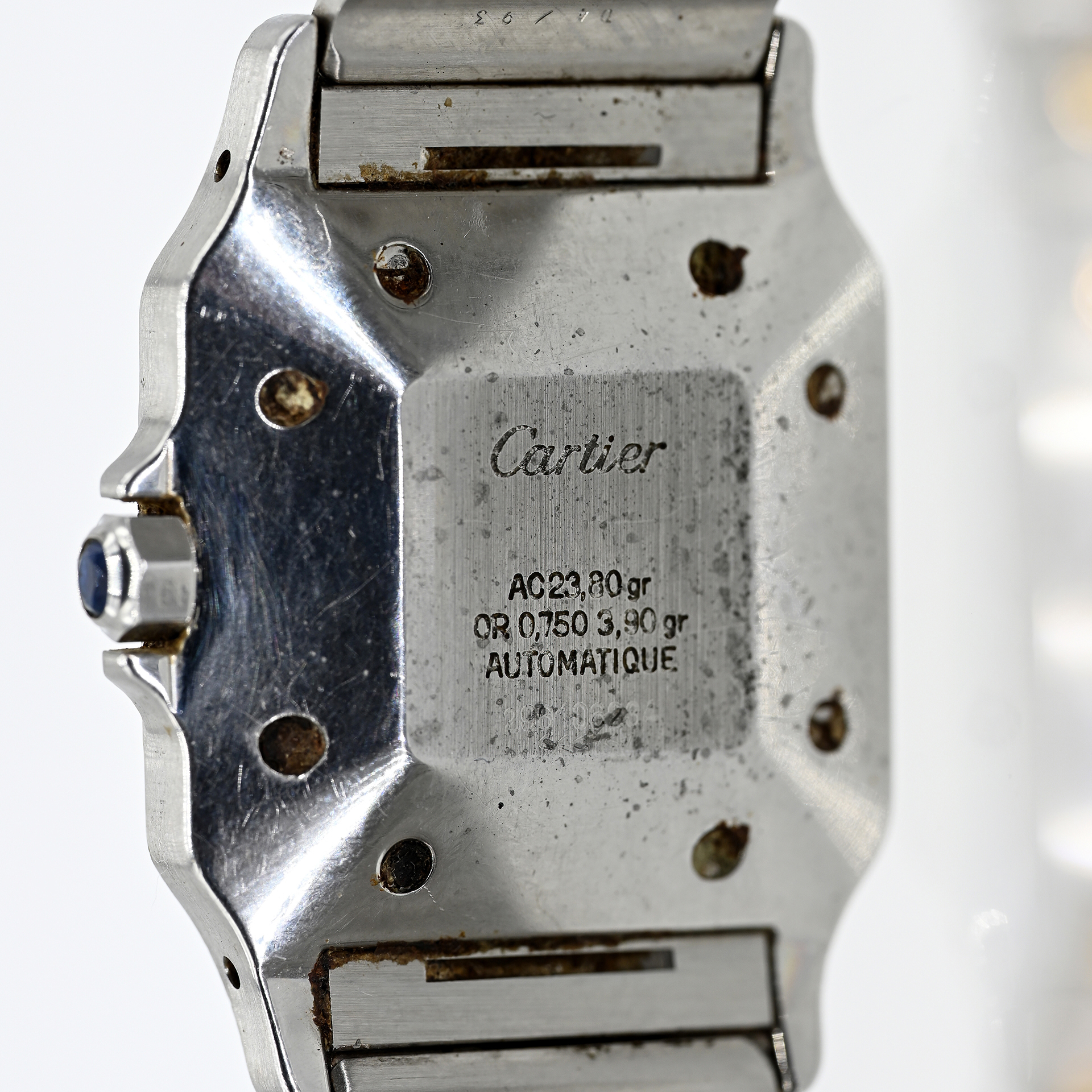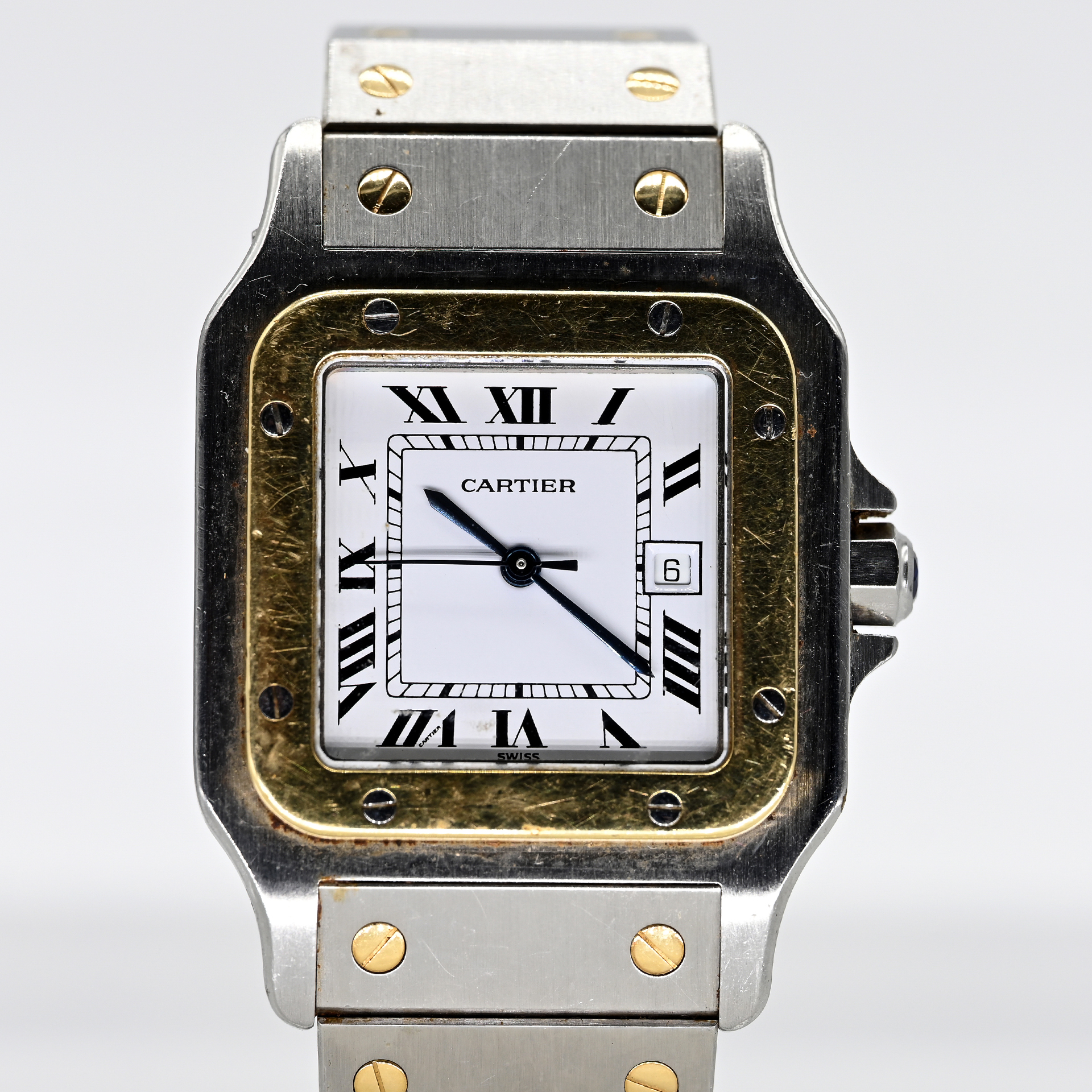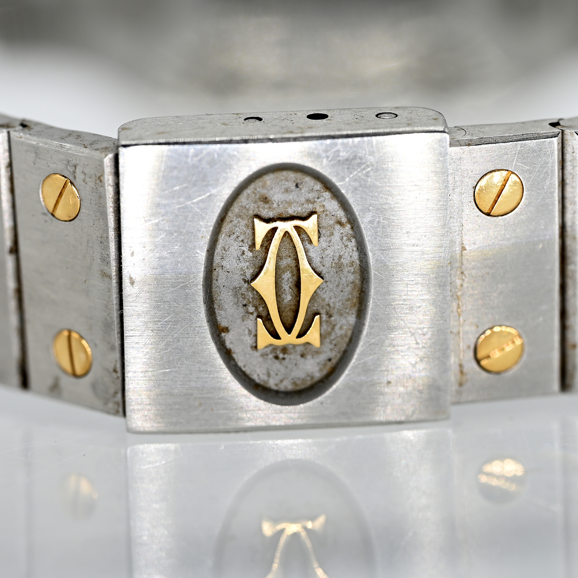 Stahl und Gelbgold; Gesamtgewicht: ca. 87,7 g; Automatik; quadratische, goldene Lünette; weißes Emaillezifferblatt mit schwarzen römischen Ziffern; gebläute, pfeilförmige Zeiger und feiner Sekundenzeiger; Datum auf 3; Saphirglas; Gliederarmband mit beidseitigem goldenen Schraubendekor; Faltschließe; Maße der Lünette: ca. 24,5 x 24,5 mm; keine Garantie auf Werk und Funktion; erkennbare, leichte Tragespuren; keine Papiere oder Kasten vorhanden.
