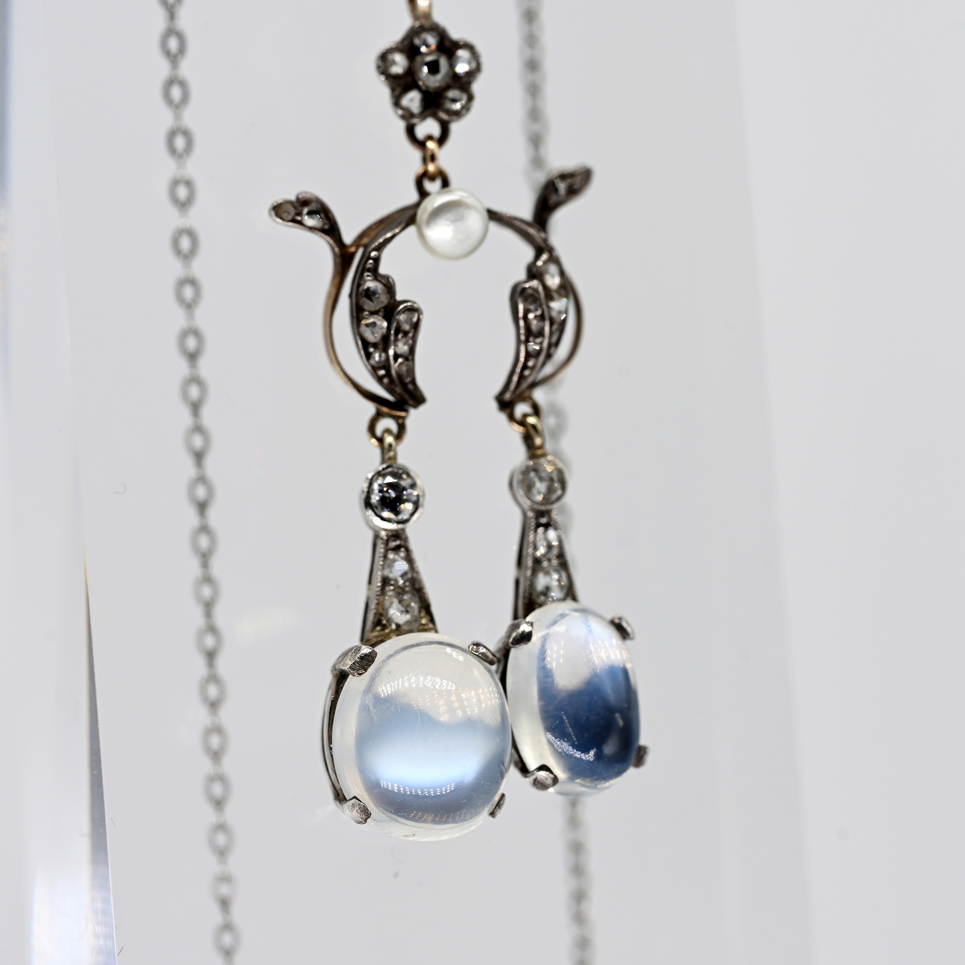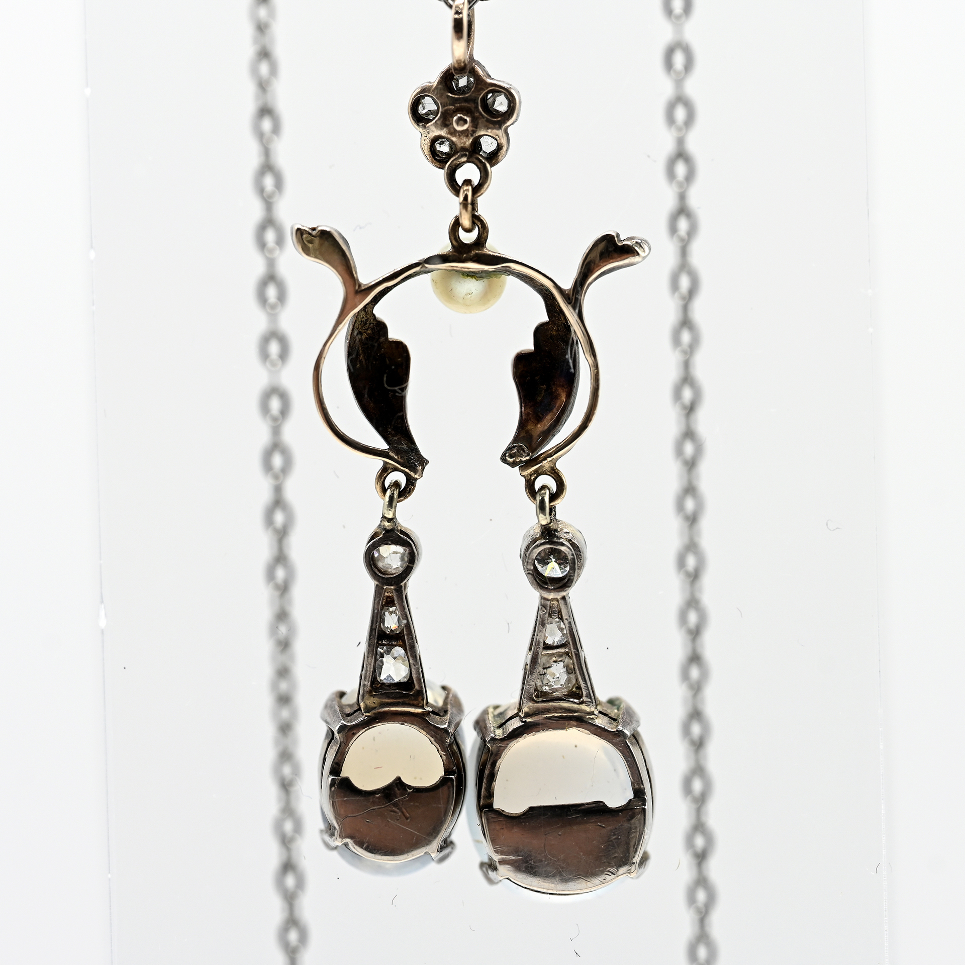 Anhänger ungeprüft: Roségold, Silber und andere Metalle; Gesamtgewicht: ca. 5,5 g; Ornamental- und florale Formen mit zwei ungleichen, beweglichen Anhängseln; konturiert mit kleinen Altschliff-Diamanten und Diamantrosen, zus. ca. 0,2 ct; Farbe und Reinheit: im mittleren und unteren Bereich; an den Anhängseln jeweils ein gefasster Mondstein-Cabochon in unterschiedlicher Größe, Farbvarietät und Adoleszenz; Länge: ca. 47,5 mm;