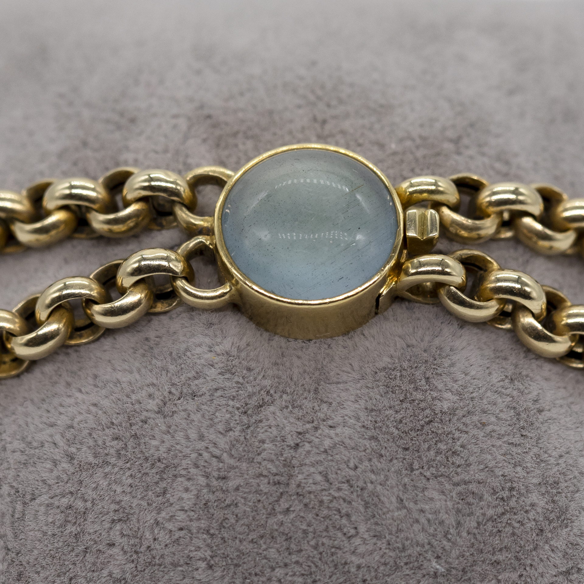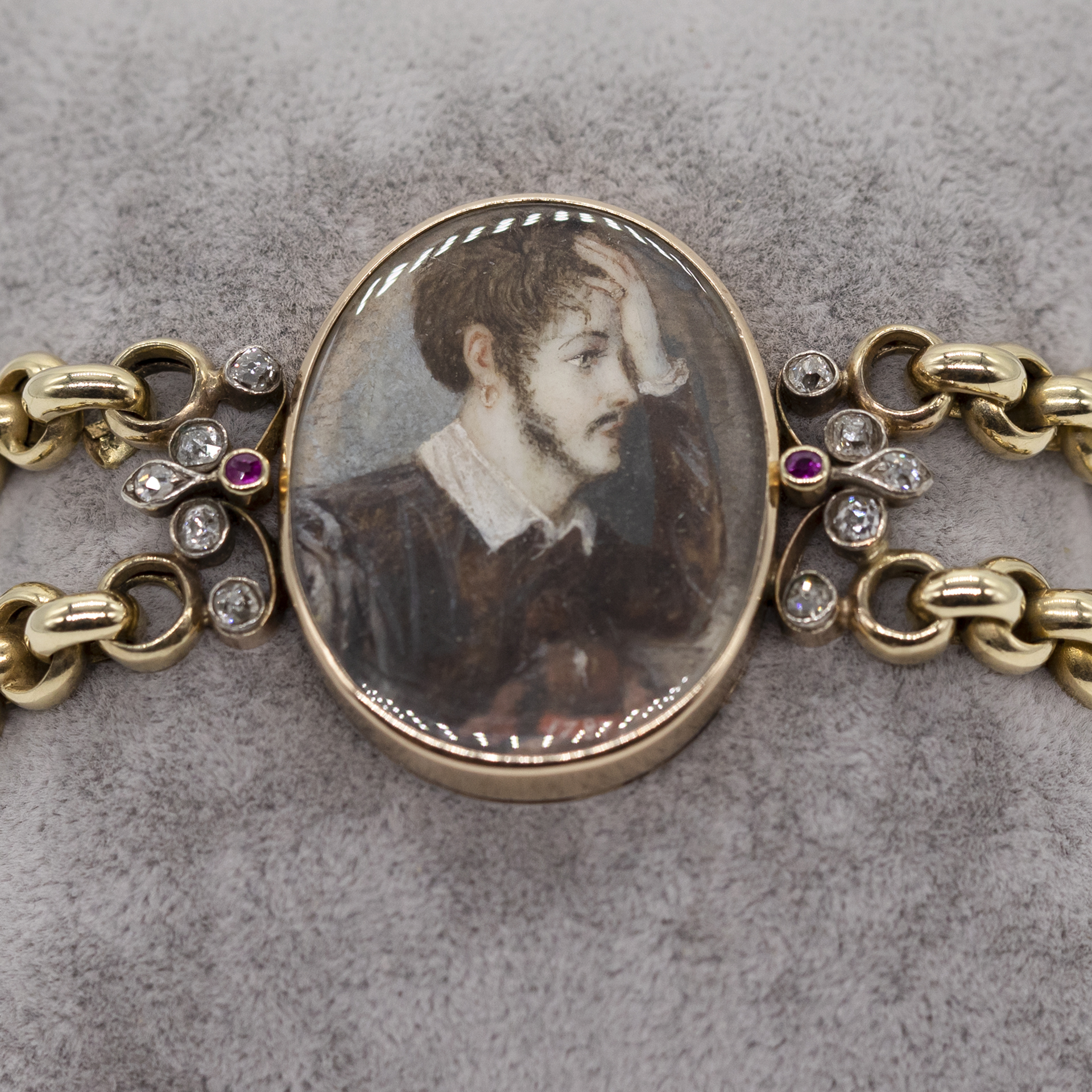 Rosé and yellow gold, stamped 585/- on the clasp tab; total weight: approx. 33 g; high-oval centrepiece featuring a set miniature in tempera, showing a man in a thinker’s pose in side profile, dated 1787; narrow, plain bezel border with two applied ornamental elements, each holding five rose-cut diamonds in chaton settings, totalling approx. 0.4 ct; colour and clarity in the mid range; flanked by one small ruby on each side; attached to two rows of circular chain links; round box clasp set with a sapphire cat’s eye cabochon; miniature dimensions: approx. 31.5 x 24.7 mm; height: approx. 5.4 mm; total length: approx. 18.5 cm.