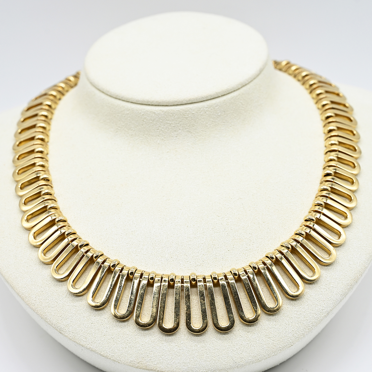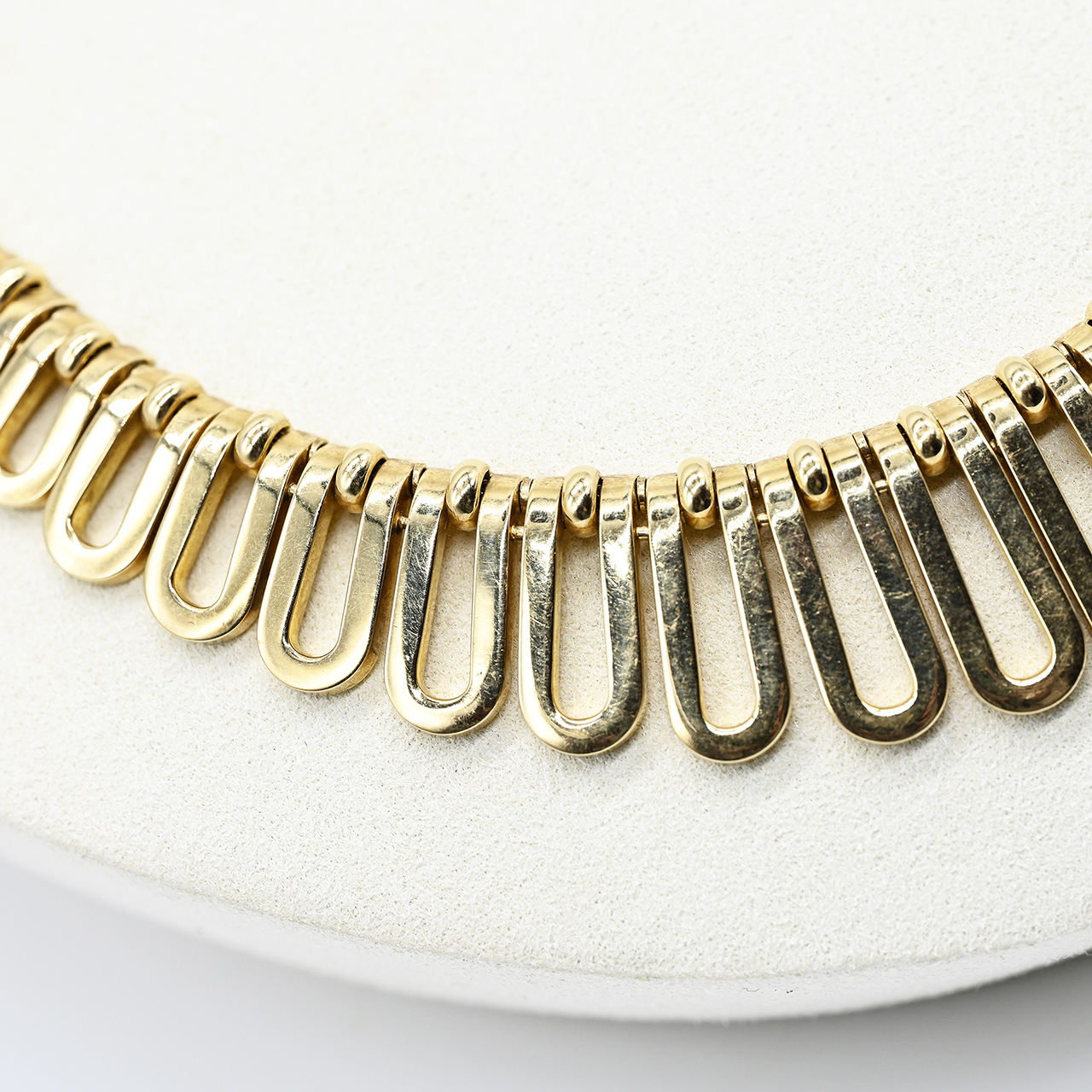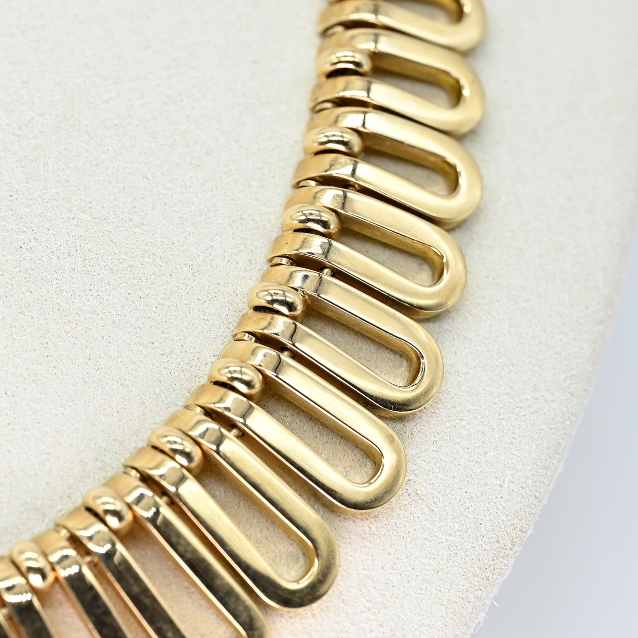 750/- Gelbgold; Gesamtgewicht: ca. 85,8 g; Einzelglieder im Schlaufen- und Ösendekor mit seitlichem Verlauf; verdecktes Kastenschloss und seitliche Sicherheitsacht; Breite der Colliermitte: ca. 23,3 mm und am Ende ca. 14,4 mm; Gesamtlänge: ca. 40,5 cm; rückseitig gestempelt mit K.