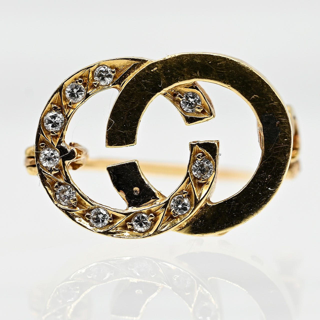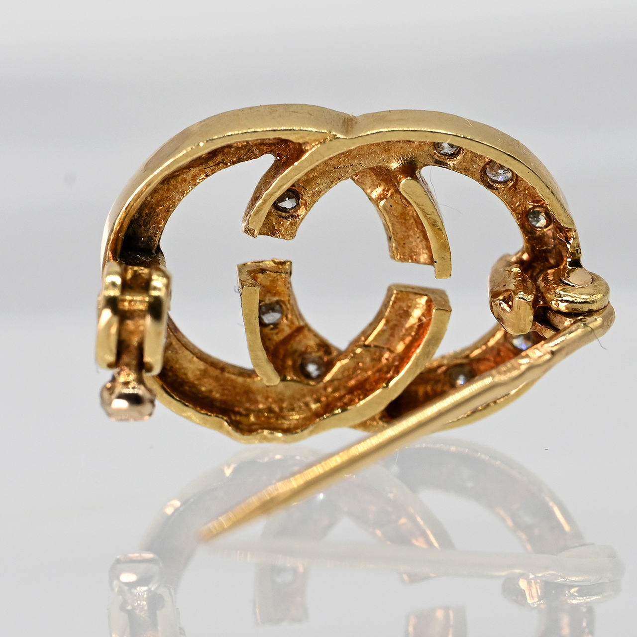 585/- yellow gold; total weight: approx. 2.1 g; two intertwined C-shaped circles, one set with ten small diamonds; dimensions: approx. 11 x 16.1 mm; height: approx. 2 mm.